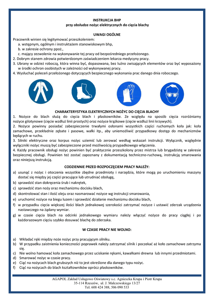 INSTRUKCJA BHP przy obsłudze nożyc elektrycznych do cięcia blachy UWAGI OGÓLNE Pracownik winien się legitymować przeszkoleniem: a. wstępnym, ogólnym i instruktażem stanowiskowym bhp, b. w zakresie ochrony ppoż., c. mający zezwolenie na wykonywanie tej pracy od bezpośredniego przełożonego. 2. Dobrym stanem zdrowia potwierdzonym zaświadczeniem lekarza medycyny pracy. 3. Ubrany w odzież roboczą, która winna być, dopasowana, bez luźno zwisających elementów oraz być wyposażony w środki ochron osobistych w zależności od wykonywanej pracy. 4. Wysłuchać poleceń przełożonego dotyczących bezpiecznego wykonania prac danego dnia roboczego. CHARAKTERYSTYKA ELEKTRYCZNYCH NOŻYC DO CIĘCIA BLACHY 1. Nożyce do blach służą do cięcia blach i płaskowników. Ze względu na sposób cięcia rozróżniamy nożyce gilotynowe (cięcie wzdłuż linii prostych) oraz nożyce krążkowe (cięcie wzdłuż linii krzywych). 2. Nożyce powinny posiadać zabezpieczenie trwałymi osłonami wszystkich części ruchomych koła jak: koła zamachowe, przekładnie zębate i pasowe, wałki itp., aby uniemożliwić przypadkowy dostęp do mechanizmów będących w ruchu. 3. Silniki elektryczne oraz korpus nożyc uziemić lub zerować według wskazań instrukcji. Wyłącznik, względnie wyłączniki nożyc muszą być zabezpieczone przed możliwością przypadkowego włączenia. 4. Każdy pracownik obsługi nożyc powinien być praktycznie przeszkolony przez mistrza lub brygadzistę w zakresie bezpiecznej obsługi. Powinien też zostać zapoznany z dokumentacją techniczno-ruchową, instrukcją smarowania oraz niniejszą instrukcją. a) b) c) d) e) f) g) CODZIENNIE PRZED ROZPOCZĘCIEM PRACY NALEŻY: usunąć z nożyc i otoczenia wszystkie zbędne przedmioty i narzędzia, które mogą po uruchomieniu maszyny dostać się między jej części pracujące lub utrudniać obsługę, sprawdzić stan dokręcenia śrub i nakrętek, sprawdzić stan noży oraz mechanizmu docisku blach, skontrolować stan i ilość oleju oraz nasmarować nożyce wg instrukcji smarowania, uruchomić nożyce na biegu luzem i sprawdzić działanie mechanizmu docisku blach, w przypadku cięcia większej ilości blach jednakowej szerokości zatrzymać nożyce i ustawić zderzak urządzenia nastawczego na żądany wymiar. w czasie cięcia blach na odcinki jednakowego wymiaru należy włączyć nożyce do pracy ciągłej i po każdorazowym cięciu szybko dosuwać blachę do zderzaka. W CZASIE PRACY NIE WOLNO: a) Wkładać ręki między noże nożyc przy pracującym silniku. b) W przypadku zaistnienia konieczności poprawek należy zatrzymać silnik i poczekać aż koło zamachowe zatrzyma się. c) Nie wolno hamować koła zamachowego przez uciskanie rękami, kawałkami drewna lub innymi przedmiotami. d) Smarować nożyc w czasie pracy. e) Ciąć na nożycach blach grubszych niż to jest określone dla danego typu nożyc. f) Ciąć na nożycach do blach kształtowników oprócz płaskowników. AGAPOL Zakład Usługowo Oświatowy s.c. Agnieszka Krupa i Piotr Krupa 35-114 Rzeszów, ul. J. Malczewskiego 13/27 Tel. 608 424 388, 506 090 533 g) Ciąć tak wąskich pasów blachy, które nie byłyby przyciskane przez przycisk. h) Pracować przy niewystarczającym lub oślepiającym oświetleniu. NALEŻY PAMIĘTAĆ, ŻE: a) W przypadku awarii nożyc należy je zatrzymać, wyłączyć spod napięcia, wypadek zgłosić swojemu bezpośredniemu przełożonemu (brygadziście lub mistrzowi). b) W przypadku przerwy w dopływie prądu lub spadku napięcia w sieci należy ustawić wyłącznik (lub wyłączniki) nożyc w położeniu zerowym. c) Po awarii zasilania włączyć nożyce można dopiero po stwierdzeniu, że napięcie prądu w sieci osiągnęło wymaganą wielkość. d) Pracownik obsługujący nożyce powinien być ubrany w odzież nie utrudniającą ruchów, jednak bez odstających i zwisających części, które grożą pochwyceniem przez znajdujące się w ruchu części maszyny oraz nosić nakrycie głowy uniemożliwiające rozsypywanie się włosów. e) Ręce powinny być odziane w rękawice. a) b) c) d) e) f) PO ZAKOŃCZENIU PRACY NALEŻY: unieruchomić nożyce, wyłączyć silnik spod napięcia, poczekać na zatrzymanie się koła zamachowego, uporządkować narzędzia, materiały i gotowe wyroby, nożyce oczyścić i nasmarować, przygotować nożyce do przekazania następnej zmianie względnie do rozpoczęcia pracy w dniu następnym. POSTĘPOWANIE W SYTUACJACH AWARYJNYCH W razie zauważenia usterek lub jakichkolwiek zagrożeń na stanowisku należy je natychmiast zgłosić bezpośredniemu przełożonemu by zostały natychmiast usunięte. Do pracy można przystąpić ponownie dopiero po ich usunięciu i ponownym sprawdzeniu pracy urządzenia. W PRZYPADKU POWSTANIA POŻARU NALEŻY - ostrzec osoby znajdujące się w obrębie zagrożenia, - wyłączyć zasilanie budynku w energię elektryczną i odciąć dopływ gazu, - zaalarmować straż pożarną, - powiadomić przełożonych o pożarze, - podjąć decyzję o ewakuacji ludzi, - przystąpić do prowadzenia akcji gaśniczej za pomocą podręcznego sprzętu gaśniczego. W PRZYPADKU ZAISTNIENIA WYPADKU - zabezpieczyć miejsce wypadku, - udzielić poszkodowanemu pierwszej pomocy, - w razie potrzeby wezwać pomoc lekarską, - powiadomić przełożonych. UWAGA 1. W razie wątpliwości co do zachowania warunków bezpieczeństwa pracy pracownik ma prawo przerwać pracę i zwrócić się do przełożonego o wyjaśnienie sytuacji. 2. W przypadku znalezienia się wobec bezpośredniego niebezpieczeństwa ma prawo powstrzymać się od wykonywania pracy. Pracownik w omawianej sytuacji zachowuje prawo do wynagrodzenia, nie może jednak odmówić podjęcia innej, równorzędnej pracy, gdy usunięcie zagrożenia przy poprzednio wykonywanej pracy nie jest możliwe. Zatwierdził ……………………..………. AGAPOL Zakład Usługowo Oświatowy s.c. Agnieszka Krupa i Piotr Krupa 35-114 Rzeszó