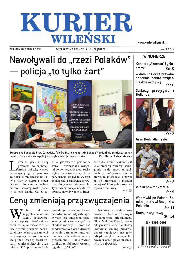 www.kurierwilenski.lt DZIENNIK POLSKI NA LITWIE WTOREK 24 KWIETNIA 2012 r. Nr. 79 (16873) cena 1,20 Lt Nawoływali do „rzezi Polaków” — policja „to tylko żart” W NUMERZE Koncert „Akcentu” i „Masters” Str. 5 W domu dziecka prawdopodobnie pobito trzyletnią dziewczynkę Str. 6 Sarkozy przegrywa z Hollande Str. 7 Gran Derbi dla Realu Europejska Fundacja Praw Człowieka (po środku jej ekspert dr. Łukasz Wardyn) nie zamierza jednak pogodzić się wnioskiem policji i złożyła apelację do prokuratury Fot. Marian Paluszkiewicz itewska policja dalej prowadzi, co najmniej, strusią politykę wobec narastającej agresji przeciwko polskiej mniejszości na Litwie. Gdy w styczniu przed Domem Polskim w Wilnie nieznani sprawcy został pobity 16-letni Daniel Cz. za to, L że — jak twierdzi poszkodowany — rozmawiał z kolegami po polsku, policja odrzuciła wątek narodowościowy, bo z góry uznała, że był to wyczyn chuligański, aczkolwiek sprawców dotychczas nie ustaliła. Tym razem policja uznała, że otwarte nawoływanie w inter- necie do „rzezi Polaków” jest „nieobraźliwą zabawą”, szczególnie na tle innych antypolskich „bzdur”, jakich pełno w litewskim internecie, a nawet na tle informacji o polskiej mniejszości jest pełno również w prasie i telewizji. str. 4 » Ceny zmieniają przyzwyczajenia obliczu stale rosnących cen na artykuły spożywcze, paliwo, opłaty mieszkaniowe coraz więcej mieszkańców Litwy ogarnia poczucie beznadziejności. Wzrost cen zmienił przyzwyczajenia konsumenckie ponad trzeciej części rodzin zamieszkujących duże miasta. 36,2 proc. mieszkań- W ców dużych miast na Litwie twierdzi, że na artykuły spożywcze jest zmuszona przeznaczyć już większą część dochodów rodziny, 19 proc. zaś sondażowanych osób droższe artykuły zamieniło tańszymi i w sklepach wybiera rzeczy przecenione — takie wyniki sondażu opublikował wczoraj tygodnik „Veidas”. Jak skomentowała w rozmowie z „Kurierem” nawyki konsumenckie mieszkańców Olga Malaškevičienė, rzecznik prasowy sieci handlowej „Maxima”, zmiany przyzwyczajeń kupujących nastąpiły, odkąd zaczął się kryzys. Jak powiedziała, z powodu zmiany siły nabywczej. str. 3 » Str. 8 Wielki powrót Vettela Str. 9 Wędrówki po Polsce: Zamknięte drzwi Bazyliki w Pelplinie Str. 11 Duchy z wystawy Str. 14 ISSN 1392-0405 sWYDARZENIA KRÓTKO Litewski budżet stoi na polskim Orlenie Lista największych podatników już nie pierwsze dziesięciolecie potwierdza tę samą tendencję — „Orlen Lietuva” płaci więcej podatków niż 300 przedsiębiorstw działających w pięciu innych branżach pozaprzemysłowych razem wziętych. Rafineria ropy naftowej, według danych Państwowej Inspekcji Podatkowej, w ubiegłym roku zapłaciła 1,279 mld litów podatków i pod względem tego wskaźnika dźwignęła cały sektor przemysłowy na drugie miejsce. Polscy turyści omijają Litwę Spadło zainteresowanie turystów polskich Litwą. Mogły na tym zaważyć również czynniki polityczne, napisał polski tygodnik „Przegląd”. Cytuje on słowa kierownika biura turystycznego „Bezkresy” Waldemara Ławeckego, który twierdzi, że w odróżnieniu od roku ubiegłego, w bieżącym roku nie odczuwa się życzenia Polaków odwiedzenia Litwy w dniach świątecznych 1-3 maja. „Całkowity brak zainteresowania wycieczkami na Litwę w ciągu najbliższego długiego weekendu. Przed rokiem wysłałem cztery pełne autokary, a teraz nie będzie żadnego” — powiedział Ławecki. „Odwrócenie się od Litwy wskazuje na to, jaki wpływ na turystkę może okazać nie tylko gospodarka, ale i polityka. Może rezygnacja z podróży na Litwę skuteczniej niż ktoś inny przekona przywódców tego kraju, że mniejszość polska powinna posiadać takież prawa, jak Litwini w Polsce. Oczywiście, żadnego bojkotu nie było, ale wielu z nas mogło jednak sobie pomyśleć: skoro w ten sposób traktują tam naszych rodaków, jedźmy gdzie indziej“ — zaznaczył kierownik biura turystycznego. BNS KURIER WILEŃSKI NWtorek, 24 kwietnia 2012 r. Nawoływali do „rzezi Polaków” — policja „to tylko żart” ze str. 1 » Do tego bowiem sprowadza się odpowiedź Głównego Komisariatu Policji (GKP) powiatu wileńskiego, który odmówił wszczęcia postępowania karnego przeciwko administratorom, którzy na Facebooku założyli grupę „Piła na Polaków” (lit. „Lenkpjūvė”), której mottem było „Rżnij Polaka za młodu!” („Pjauk lenką kol jaunas!”). Niebawem po założeniu tej grupy w Internecie, również w styczniu tego roku, wytropiła ją działająca na Litwie Europejska Fundacja Praw Człowieka. Do sympatyków grupy „Piła na Polaków” już wtedy należały 23 osoby. Fundacja uznała że komentarze tych osób i ich oświadczenia na stronie społecznościowej, otwarcie nawołują do nienawiści wobec mniejszości polskiej na Litwie. Uczestnicy grupy dodatkowo zamieszczali na stronie zdjęcia obrażające Polaków. Wobec tego, Fundacja skierowała do Prokuratury Generalnej wniosek o pociągnięcie członków grupy do odpowiedzialności karnej za podżeganie do nienawiści wobec mniejszości narodowych, za co z godnie z art. 170 Kodeksu Karnego Republiki Litewskiej grozi kara pozbawienia wolności do 2 lat lub do 3 lat — w przypadku podżegania do przemowy wobec mniejszości narodowych. Fundacja Praw Człowieka poinformowała właśnie, że GKP odmówił wszczęcia dochodzenia przedprocesowego, bo śledcza Wydziału Śledczego ds. przestępstw Oksana Kowalenko po zbadaniu sprawy i przesłuchaniu uczestników grupy w „charakterze świadków” doszła wniosku, że nie ma „obiektywnych dowodów” na to, że grupa „Lenkpjūvė” została założona na Facebooku po to, żeby podżegać do nienawiści i dyskryminacji poszczególnej grupy osób na tle jej narodowości. „Świadkowie” grupy przyznali się, że nie wiedzieli, iż materiały na str