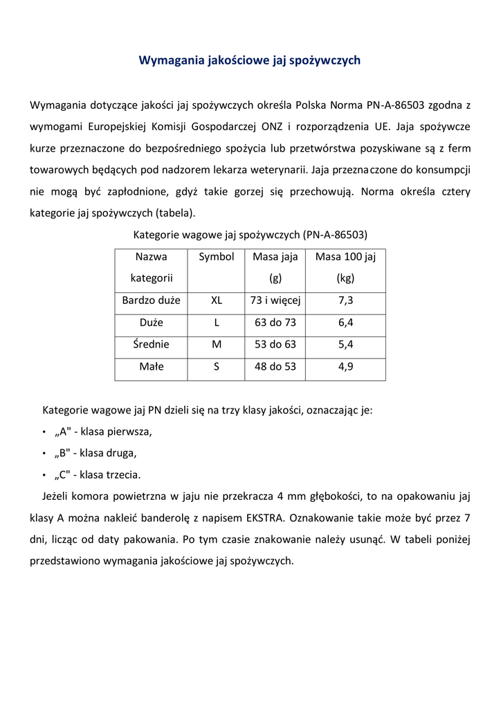 Wymagania jakościowe jaj spożywczych Wymagania dotyczące jakości jaj spożywczych określa Polska Norma PN-A-86503 zgodna z wymogami Europejskiej Komisji Gospodarczej ONZ i rozporządzenia UE. Jaja spożywcze kurze przeznaczone do bezpośredniego spożycia lub przetwórstwa pozyskiwane są z ferm towarowych będących pod nadzorem lekarza weterynarii. Jaja przeznaczone do konsumpcji nie mogą być zapłodnione, gdyż takie gorzej się przechowują. Norma określa cztery kategorie jaj spożywczych (tabela). Kategorie wagowe jaj spożywczych (PN-A-86503) Nazwa Symbol kategorii Masa jaja Masa 100 jaj (g) (kg) Bardzo duże XL 73 i więcej 7,3 Duże L 63 do 73 6,4 Średnie M 53 do 63 5,4 Małe S 48 do 53 4,9 Kategorie wagowe jaj PN dzieli się na trzy klasy jakości, oznaczając je: • „A" - klasa pierwsza, • „B" - klasa druga, • „C" - klasa trzecia. Jeżeli komora powietrzna w jaju nie przekracza 4 mm głębokości, to na opakowaniu jaj klasy A można nakleić banderolę z napisem EKSTRA. Oznakowanie takie może być przez 7 dni, licząc od daty pakowania. Po tym czasie znakowanie należy usunąć. W tabeli poniżej przedstawiono wymagania jakościowe jaj spożywczych. Wymagania jakościowe jaj spożywczych (PN-A-86503) Cecha Wymagania klasa A Skorupa o normalnym kształcie, czysta, nie uszkodzona, nie myta, nie czyszczona o wysokości nie przekraczającej 6 mm, nieruchoma; w jajach Komora powietrzna oznakowanych jako EKSTRA - o wysokości nie przekraczającej 4 mm klasa B nie uszkodzona, dopuszcza się nieco zniekształconą i przybrudzoną klasa C jaja spożywcze nie odpowiadające wymaganiom klas A i B; przeznaczone wyłącznie do przetwórstwa o wysokości nie przekraczającej 9 mm, dopuszcza się ruchomą, z zatoką do 1/2 długości jaja przejrzyste, dopuszcza przejrzyste, gęste, bez się nieco rozrzedzone, ciał obcych bez ciał obcych słabo widoczne, kuliste, widoczne, dopuszcza przy obracaniu jajem się lekko spłaszczone, słabo ruchliwe, powraprzy obracaniu jajem cające do centralnego ruchliwe, bez ciał położenia, bez ciał obcych obcych Białko Żółtko Tarczka zarodkowa niewidoczna Zapach niewidoczna swoisty, bez obcego zapachu Obowiązkowe oznakowanie na skorupie (od 01.05.2004 dotyczy jaj klasy „A") Kod producenta 1. Kod sposobu chowu: 0 chów ekologiczny 1 chów z wolnym wybiegiem 2 chów ściółkowy 3 chów klatkowy 2. Kod pochodzenia - kod Państwa członkowskiego rejestrującego fermę, zawiera dwie litery, np.: BE Belgia DE Niemcy PL Polska 3. Weterynaryjny numer identyfikacyjny: nr fermy + ewentualnie nr kurnika/stada Obowiązkowe elementy oznakowania na opakowaniach (od 01.05.2004 dotyczy jaj klasy „A") • Data minimalnej trwałości lub „najlepiej spożyć przed..." Znakuje się w momencie pakowania jaj. Data nie powinna przekraczać 28 dni od daty zniesienia i powinna być uzupełniona zaleceniem: „jaja po zakupie należy przechowywać w temperaturze chłodziarki". • Nazwa, adres i numer zakładu pakowania PL - weterynaryjny numer identyfikacyjny • Liczba zapakowanych jaj • Klasa jakościowa jaj Klasa „A", może być uzupełniona słowem „świeże" • Metoda chowu dla jaj klasy „A" określona słowami: „jaja z wolnego wybiegu" „jaja z chowu ściółkowego" „jaja z chowu klatkowego" • Klasa wagowa XL, L, M, S. Może być uzupełniona odpowiednim zakresem klasy wagowej.