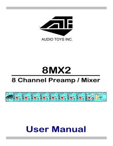 8 M X 2 P r e a m p / M ix e r C o n t e n t s In t r o d u c tio n : 1 .0 S p e c ific a tio n s : 2 .0 B lo c k D ia g r a m : 2 .1 In p u t / L im it e r : 3 .0 M a s t e r S e c t io n : 4 .0 R e a r P a n e l: 5 .0 P e r fo r m a n c e G r a p h s : 6 .0 A c c e s s o r ie s : 7 .0 P r e a m 8 M X 2 p / M ix e r In t r o d u c t io n In t r o d u c tio n : A T I w o u ld lik e to c o n g r a tu la te y o u o n th is 8 M X 2 p u r c h a s e . A T I r e a liz e s th e im p o r ta n c e o f a n y e q u ip m e n t p u r c h a s e a n d w o u ld lik e to a s s u r e y o u th a t s tr o n g p r o d u c t s u p p o r t h a s a lw a y s b e e n a c o m m itm e n t o f A T I. T h e H is t o r y : T h e 8 M X 2 w a s d e v e lo p e d to s p e c ific a lly a d d r e s s a p p lic a tio n s in th e P r o fe s s io n a l A u d io a n d B r o a d c a s t in d u s tr ie s w h e r e c o m p a c t h ig h p e r fo r m a n c e c ir c u itr y is r e q u ir e d . In r e s p o n s e to th e w id e s c a le u s e o f H a r d D is k a n d ta p e b a s e d D ig ita l M u ltitr a c k R e c o r d e r s fo r liv e m u s ic a n d film lo c a tio n s o u n d r e c o r d in g , A T I h a s a p p lie d its a c c la im e d m ic p r e - a m p te c h n o lo g y to th e 8 M X 2 p r e - a m p /m ix e r . T h is s a m e p r e - a m p d e s ig n is fo u n d in A T I s P a r a g o n , th e r e fe r e n c e s ta n d a r d in s o u n d r e in fo r c e m e n t c o n s o le s , a n d th e h ig h ly r e g a r d e d P R O 6 P r o c e s s o r . T h e s o n ic q u a lity o f th e h ig h v o lta g e m ic p r e - a m p m a k e s th e 8 M X 2 a p e r fe c t d e v ic e fo r th e m ix in g e n g in e e r b y in c lu d in g 8 M ic p r e - a m p s in o n e c h a s s is . A d d itio n a l v e r s a tility w a s a d d e d w h ic h a llo w s m ix in g w ith p a n to a s te r e o b u s s o f e ith e r th e m u ltitr a c k fe e d o r th e r e tu r n o f a ll 8 c h a n n e ls . In c lu d e d o n th e m ic in p u t c h a n n e l is a v a r ia b le th r e s h o ld lim ite r w ith a n In fin ity :1 r a tio . In te r - u n it lin k in g w a s a d d e d to p r o v id e S la v e / M a s te r c o u p lin g . T h is d o c u m e n t w ill o u tlin e th e b a s ic b lo c k s o f th e 8 M X 2 a n d s h o w s o m e u n iq u e w a y s in w h ic h th is d e v ic e c o u ld b e u s e d o n y o u r n e x t p r o je c t. O v e r v ie w : T h e r e a r e n in e a u d io b lo c k s th a t m a k e u p th e C h a n n e ls a n d a M a s te r s e c tio n . C h a C h a tw o M ix n n n n d u L e e l e l a l v e fro n / R e c o n l (In t p tu c e n e a n e l s w r n s ig n a n tr ic c o n r ) w ith M M a s te r S e c tio n fr o n ( m o n ito r ) , C h a n n e l s e le c t to P h o n e s ( m th a t c o n tr o ls M ix L e c o n tr o ls P h o n e s ( m a re tw o 1 0 s e g m e n O n p in c a r M o c a n m in th e re D c o n ry th e n ito r s e ith e u s 1 5 % a r n e c h ig n r b itc h l s e tro ix e s in c lu d e le c t fo r M ix ls . In p u t g a P a n (O u te r t p a n e l s w itc h e R e tu rn to P h o n o n ito r ) w h e n In v e l (In n e r) a n d o n ito r ) le v e l. A t m e te rs fo r L e v p a n e l e a c h c to rs a re p r a n n e l o u tp u a ls a r e a ll T e 1 1 8 V A C o to p lu s 1 0 % 8 M X 2 : E ig h t In p u t / O u tp u t / R e tu r n C u e , P h a s e R e v e rs e , 4 8 V P h a n to m P o w e r, le v e l & p a n a n d M ix a s s ig n m e n t. T h e r e a r e in ( In n e r ) w ith L im ite r T h r e s h o ld ( O u te r ) a n d ). s in c lu d e M ix O e s ( m o n ito r ) , C p u t C u e is s e le M ix P a n ( o u te r p h o n e s ja c k is e l a n d G a in R e c h a n n e l s e c tio n o v id e d fo r in te r ts a n d c h a n n e l R S ja c k s . A ll in r 2 4 0 V A C w ith o f n o m in a l. u tp u t / h a n n e l c te d . T ), a n d a p r o v id e d u c tio n M ix 2 T r k R p re / p o s t V h e r e is o n e s in g le s h a d o n th e fro m e te r in g . e tu rn C A s d u a l ft c o n n t p a to P h o n e s ig n a l c o n c e n tr ic tr o l w h ic h n e l. T h e r e h a s in d iv id u a l G r o u n d L ift s w itc h e s u n it lin k in g a n d tw o 2 5 p in D c o n n e c r e tu r n s ig n a ls . M ix , M ix 2 T r k r e tu r n p u ts a n d o u tp u ts a r e fu lly b a la n c e d a m o r e th a n a c c e p ta b le o p e r a tin g r a 1 .0 . T w o 9 to rs a n d . A C in p u t n g e fro m 8 M X 2 P r e a m p / M ix e r O v e r v ie w S ig n a l F lo w T h e p r o p r ie ta r y A T I m ic r o p h o n e p r e a m p lifie r w ill a c c e p t s ig n a l le v e ls fr o m 0 d B to m in u s 6 5 d B . T h is p r e a m p lifie r h a s 4 8 + v e a n d 4 8 - v e p o w e r r a ils a n d p r o d u c e s v e r y lo w T H D e v e n a t h ig h in p u t le v e ls o r g a in . T h e 8 M X 2 is p in 2 h o t. F o llo w in g th e m a in g a in s ta g e th e r e is a p h a s e r e v e r s e s w itc h . T h e o u tp u t o f th e M ic p r e a m p p a s s e s th r o u g h a V C A u s e d fo r h a r d w a ll lim itin g a n d fe e d s th e 2 5 p in D m a c h in e s e n d m u ltip in c o n n e c to r o n th e r e a r p a n e l. T h e In p u t g a in c o n tr o l a n d th e L im ite r th r e s h o ld h a v e 4 1 p o s itio n d e te n ts fo r e a s ily r e s e ttin g le v e ls . T h e C u e s w itc h w h e n d e p r e s s e d a llo w s th e m o n ito r in g o f a ll s ig n a ls in th e c h a n n e l a n d th e r e tu r n p a th s . S e e In p u t / L im it e r . M a c h in e r e tu r n 2 5 p in D c o n n e c to r s ig n a ls fe e d b a la n c e d lin e in p u t a m p lifie r s o n e a c h c h a n n e l. S ig n a l fe e d to th e M ix L e v e l / P a n c a n b e e ith e r th e c h a n n e l o u tp u t s ig n a l o r th e r e tu r n s ig n a l ( R E T ) . T h e M IX a s s ig n s w itc h p la c e s th is s ig n a l o n to th e M ix b u s s . S e e M ix L e v e l / P a n . C h a n n e ls h a v e in d iv id u a l X L R G r o u n d lift, S e e In p u t R e a r P a n e l, a n d 4 8 V P h a n t