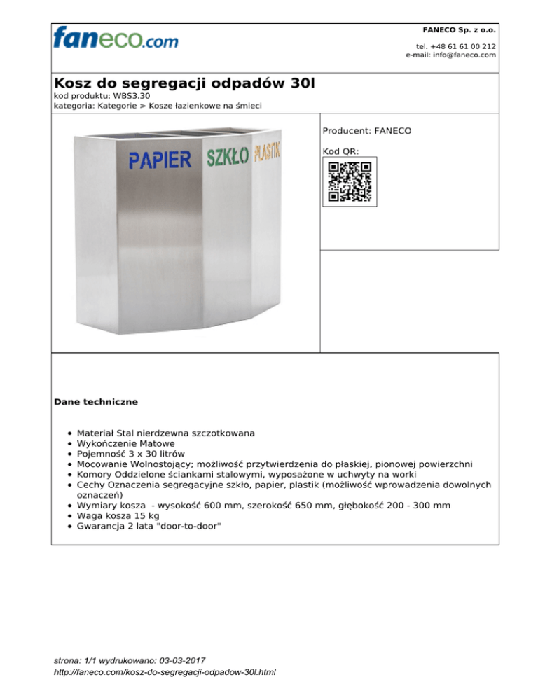 FANECO Sp. z o.o. tel. +48 61 61 00 212 e-mail: [email protected] Kosz do segregacji odpadów 30l kod produktu: WBS3.30 kategoria: Kategorie > Kosze łazienkowe na śmieci Producent: FANECO Kod QR: Dane techniczne Materiał Stal nierdzewna szczotkowana Wykończenie Matowe Pojemność 3 x 30 litrów Mocowanie Wolnostojący; możliwość przytwierdzenia do płaskiej, pionowej powierzchni Komory Oddzielone ściankami stalowymi, wyposażone w uchwyty na worki Cechy Oznaczenia segregacyjne szkło, papier, plastik (możliwość wprowadzenia dowolnych oznaczeń) Wymiary kosza - wysokość 600 mm, szerokość 650 mm, głębokość 200 - 300 mm Waga kosza 15 kg Gwarancja 2 lata "door-to-door" strona: 1/1 wydrukowano: 03-03-2017 http://faneco.com/kosz-do-segregacji-odpadow-30l.html