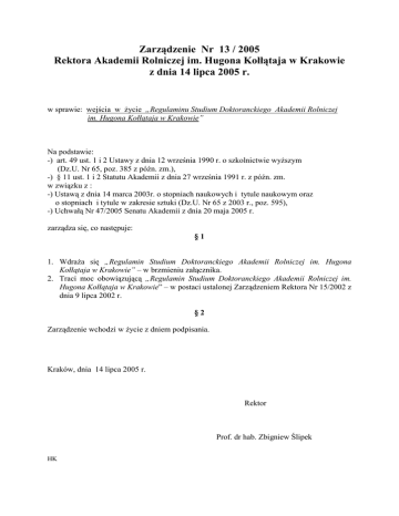 Zarządzenie Nr 13 / 2005 Rektora Akademii Rolniczej im. Hugona Kołłątaja w Krakowie z dnia 14 lipca 2005 r. w sprawie: wejścia w życie „Regulaminu Studium Doktoranckiego Akademii Rolniczej im. Hugona Kołłątaja w Krakowie” Na podstawie: -) art. 49 ust. 1 i 2 Ustawy z dnia 12 września 1990 r. o szkolnictwie wyższym (Dz.U. Nr 65, poz. 385 z późn. zm.), -) § 11 ust. 1 i 2 Statutu Akademii z dnia 27 września 1991 r. z późn. zm. w związku z : -) Ustawą z dnia 14 marca 2003r. o stopniach naukowych i tytule naukowym oraz o stopniach i tytule w zakresie sztuki (Dz.U. Nr 65 z 2003 r., poz. 595), -) Uchwałą Nr 47/2005 Senatu Akademii z dnia 20 maja 2005 r. zarządza się, co następuje: §1 1. Wdraża się „Regulamin Studium Doktoranckiego Akademii Rolniczej im. Hugona Kołłątaja w Krakowie” – w brzmieniu załącznika. 2. Traci moc obowiązującą „Regulamin Studium Doktoranckiego Akademii Rolniczej im. Hugona Kołłątaja w Krakowie” – w postaci ustalonej Zarządzeniem Rektora Nr 15/2002 z dnia 9 lipca 2002 r. §2 Zarządzenie wchodzi w życie z dniem podpisania. Kraków, dnia 14 lipca 2005 r. Rektor Prof. dr hab. Zbigniew Ślipek HK 2 Załącznik do Zarządzenia Rektora Nr 13/2005 z dnia 14 lipca 2005 r. REGULAMIN STUDIUM DOKTORANCKIEGO Akademii Rolniczej im. Hugona Kołłątaja w Krakowie §1 1. Celem studiów doktoranckich jest kształcenie w dziedzinach wymagających wzrostu wysokokwalifikowanej kadry. 2. Studia doktoranckie umożliwiają uzyskanie stopnia naukowego: a) doktora nauk rolniczych w zakresie: agronomii; inżynierii rolniczej; kształtowania środowiska; ogrodnictwa; technologii żywności i żywienia; zootechniki; b) doktora nauk leśnych, w zakresie leśnictwa. §2 1. Zasady działania Studium Doktoranckiego zatwierdza Rektor po zasięgnięciu opinii Senatu. 2. Studium Doktoranckie jako ogólnouczelniana jednostka organizacyjna podlega prorektorowi, któremu w trybie § 12 ust. 3 Statutu AR Rektor powierza nadzór nad rozwojem kadry naukowej. 3. Kierunki, w zakresie których prowadzone są studia doktoranckie oraz liczbę uczestników zatwierdza Rektor na wniosek Rady Programowej. 4. Pod względem merytorycznym studia doktoranckie nadzoruje Rada Programowa, w skład której wchodzą przedstawiciele wydziałów mających uprawnienia nadawania stopnia doktora, powołani przez Rektora spośród osób wskazanych przez właściwe Rady Wydziałów. 5. Kadencja Rady Programowej trwa trzy lata i kończy się z chwilą powołania nowej Rady Programowej. 6. Pracami Rady Programowej kieruje Przewodniczący powołany przez Rektora spośród osób posiadających tytuł naukowy, zatrudnionych w Akademii Rolniczej w Krakowie. 7. Studiami doktoranckimi kieruje Kierownik Studium powołany przez Rektora spośród osób posiadających tytuł naukowy lub stopień naukowy doktora habilitowanego, zatrudnionych w Akademii Rolniczej w Krakowie. §3 1. Studia doktoranckie mają charakter stacjonarny i trwają 4 lata. 2. W uzasadnionych przypadkach uczestnik studiów doktoranckich może uzyskać zgodę Rektora na przedłużenie okresu studiów, nie dłużej jednak niż o jeden rok. 3 3. W przypadku wcześniejszego złożenia egzaminów i ukończenia pracy doktorskiej Rada Programowa skraca poszczególnym uczestnikom czas trwania studiów doktoranckich. 4. Rozpoczęcie i zakończenie semestrów studiów doktoranckich pokrywa się z terminami rozpoczęcia i zakończenia semestrów studiów prowadzonych w Uczelni. §4 1. Do obowiązków Kierownika Studium Doktoranckiego należy: a) kierowanie rekrutacją kandydatów na studia; b) przedkładanie Rektorowi wniosków o przyjęcie i zatwierdzenie listy zakwalifikowanych kandydatów na studia; c) ustalanie opiekunów naukowych dla poszczególnych uczestników studiów w porozumieniu z kierownikami jednostek naukowo-dydaktycznych; d) przedkładanie Radzie Programowej corocznych sprawozdań z przebiegu studiów na podstawie sprawozdań składanych przez doktorantów pod koniec każdego semestru; e) podejmowanie decyzji o skreśleniu z listy studentów. 2. Obsługę administracyjną Studium prowadzi sekretariat Studium, który zajmuje się organizacją spraw związanych z przebiegiem studiów doktoranckich na wszystkich wydziałach Uczeni, a w szczególności: a) obsługą administracyjną Rady Programowej i Kierownika Studium, b) prowadzeniem dokumentacji związanej z rekrutacją i tokiem studiów, c) prowadzeniem rozliczeń finansowych związanych z przebiegiem studiów oraz świadczeniami na rzecz doktorantów łącznie ze stypendiami i składką zdrowotną. §5 1. Program studiów doktoranckich ustala Rada Programowa, określając liczbę godzin zajęć obowiązkowych, liczbę obowiązkowych egzaminów i zaliczeń. 2. Rada Programowa zatwierdza indywidualny plan pracy uczestnika studiów, przedstawiony przez opiekuna naukowego. 3. Uczestnicy studiów doktoranckich mają prawo do corocznej przerwy w okresie wakacji, w wymiarze ośmiu tygodni. §6 1. Opiekunem naukowym uczestnika studiów doktoranckich może być profesor lub doktor habilitowany, przewidywany na promotora przewodu doktorskiego tego uczestnika. 2. Do obowiązków opiekuna naukowego należy: a) udzielanie pomocy w pracy naukowej, szczególnie w doborze problematyki, w ramach której wykonana będzie praca doktorska; b) opracowanie indywidualnego programu studiów i harmonogramu badań; c) sformułowanie tematu pracy doktorskiej; d) prowadzenie konsultacji z doktorantem; e) ocena rozwoju naukowego doktoranta w każdym semestrze i wnioskowanie o zaliczenie semestru; f) pomoc w zorganizowaniu warsztatu pracy doktoranta; g) kierowanie pracą dydaktyczną doktoranta. 4 3. Promotorowi - po pomyślnie obronionej pracy doktorskiej – przysługuje jednorazowe honorarium za opiekę nad doktorantem w wysokości przewidzianej w przepisach ogólnych. §7 1. Na studia doktoranckie może być przyjęta osoba, która spełnia warunki określone w Ustawie z dnia 14 marca 2003r