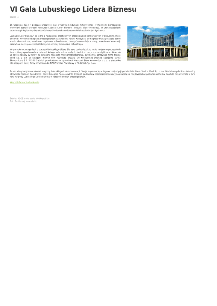 VI Gala Lubuskiego Lidera Biznesu 2014-09-16 15 września 2014 r. podczas uroczystej gali w Centrum Edukacji Artystycznej - Filharmonii Gorzowskiej wyłonieni zostali laureaci konkursu Lubuski Lider Biznesu i Lubuski Lider Innowacji. W uroczystościach uczestniczył Regionalny Dyrektor Ochrony Środowiska w Gorzowie Wielkopolskim Jan Rydzanicz. „Lubuski Lider Biznesu” to jedno z najbardziej prestiżowych przedsięwzięć konkursowych w Lubuskim, które docenia i wyróżnia najlepsze przedsiębiorstwa zachodniej Polski. Kandydaci do nagrody muszą osiągać dobre wyniki ekonomiczne, terminowo regulować zobowiązania, tworzyć nowe miejsca pracy, inwestować w rozwój, działać na rzecz społeczności lokalnych i ochrony środowiska naturalnego. W tym roku w zmaganiach o statuetki Lubuskiego Lidera Biznesu, podobnie jak to miało miejsce w poprzednich latach, firmy rywalizowały w czterech kategoriach: mikro, małych, średnich i dużych przedsiębiorstw. Akces do VI edycji zgłosiły 52 firmy. W kategorii najlepsze mikroprzedsiębiorstwo, zwyciężyła gorzowska firma Starke Wind Sp. z o.o. W kategorii małych firm najlepsza okazała się Kostrzyńsko-Słubicka Specjalna Strefa Ekonomiczna S.A. Wśród średnich przedsiębiorstw tryumfował Meprozet Stare Kurowo Sp. z o.o., a statuetkę dla najlepszej dużej firmy przyznano dla NZOZ Szpital Powiatowy w Słubicach Sp. z o.o. Po raz drugi wręczono również nagrody Lubuskiego Lidera Innowacji. Swoją supremację w tegorocznej edycji potwierdziła firma Starke Wind Sp. z o.o. Wśród małych firm statuetkę otrzymało Centrum Ogrodnicze i Motel Grzegorz Pintal, a wśród średnich podmiotów najbardziej innowacyjna okazała się międzyrzecka spółka Sinus Polska. Kapituła nie przyznała w tym roku nagrody Lubuskiego Lidera Biznesu w kategorii dużych przedsiębiorstw. Więcej informacji o konkursie. ----------------------------Źródło: RDOŚ w Gorzowie Wielkopolskim Fot.: Bartłomiej Nowosielski