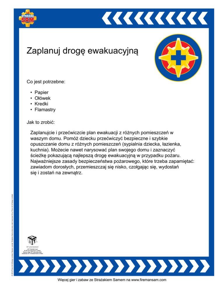 Zaplanuj drogę ewakuacyjną Co jest potrzebne: • • • • Papier Ołówek Kredki Flamastry Jak to zrobić: © 2014 Prism Art & Design Limited. Nazwa i postać Strażaka Sama stanowią znaki towarowe firmy Prism Art & Design Limited. Zaplanujcie i przećwiczcie plan ewakuacji z różnych pomieszczeń w waszym domu. Pomóż dziecku przećwiczyć bezpieczne i szybkie opuszczanie domu z różnych pomieszczeń (sypialnia dziecka, łazienka, kuchnia). Możecie nawet narysować plan swojego domu i zaznaczyć ścieżkę pokazującą najlepszą drogę ewakuacyjną w przypadku pożaru. Najważniejsze zasady bezpieczeństwa pożarowego, które trzeba zapamiętać: zawiadom dorosłych, przemieszczaj się nisko, czołgając się, wydostań się i zostań na zewnątrz. Więcej gier i zabaw ze Strażakiem Samem na www.firemansam.com