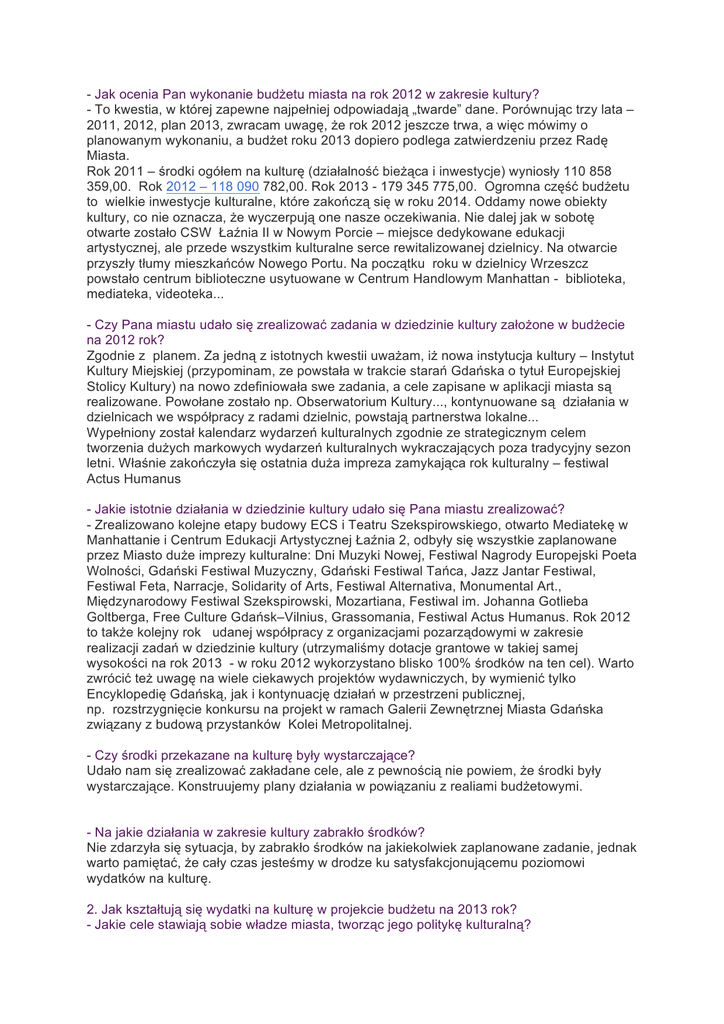 - Jak ocenia Pan wykonanie budżetu miasta na rok 2012 w zakresie kultury? - To kwestia, w której zapewne najpełniej odpowiadają „twarde” dane. Porównując trzy lata – 2011, 2012, plan 2013, zwracam uwagę, że rok 2012 jeszcze trwa, a więc mówimy o planowanym wykonaniu, a budżet roku 2013 dopiero podlega zatwierdzeniu przez Radę Miasta. Rok 2011 – środki ogółem na kulturę (działalność bieżąca i inwestycje) wyniosły 110 858 359,00. Rok 2012 – 118 090 782,00. Rok 2013 - 179 345 775,00. Ogromna część budżetu to wielkie inwestycje kulturalne, które zakończą się w roku 2014. Oddamy nowe obiekty kultury, co nie oznacza, że wyczerpują one nasze oczekiwania. Nie dalej jak w sobotę otwarte zostało CSW Łaźnia II w Nowym Porcie – miejsce dedykowane edukacji artystycznej, ale przede wszystkim kulturalne serce rewitalizowanej dzielnicy. Na otwarcie przyszły tłumy mieszkańców Nowego Portu. Na początku roku w dzielnicy Wrzeszcz powstało centrum biblioteczne usytuowane w Centrum Handlowym Manhattan - biblioteka, mediateka, videoteka... - Czy Pana miastu udało się zrealizować zadania w dziedzinie kultury założone w budżecie na 2012 rok? Zgodnie z planem. Za jedną z istotnych kwestii uważam, iż nowa instytucja kultury – Instytut Kultury Miejskiej (przypominam, ze powstała w trakcie starań Gdańska o tytuł Europejskiej Stolicy Kultury) na nowo zdefiniowała swe zadania, a cele zapisane w aplikacji miasta są realizowane. Powołane zostało np. Obserwatorium Kultury..., kontynuowane są działania w dzielnicach we współpracy z radami dzielnic, powstają partnerstwa lokalne... Wypełniony został kalendarz wydarzeń kulturalnych zgodnie ze strategicznym celem tworzenia dużych markowych wydarzeń kulturalnych wykraczających poza tradycyjny sezon letni. Właśnie zakończyła się ostatnia duża impreza zamykająca rok kulturalny – festiwal Actus Humanus - Jakie istotnie działania w dziedzinie kultury udało się Pana miastu zrealizować? - Zrealizowano kolejne etapy budowy ECS i Teatru Szekspirowskiego, otwarto Mediatekę w Manhattanie i Centrum Edukacji Artystycznej Łaźnia 2, odbyły się wszystkie zaplanowane przez Miasto duże imprezy kulturalne: Dni Muzyki Nowej, Festiwal Nagrody Europejski Poeta Wolności, Gdański Festiwal Muzyczny, Gdański Festiwal Tańca, Jazz Jantar Festiwal, Festiwal Feta, Narracje, Solidarity of Arts, Festiwal Alternativa, Monumental Art., Międzynarodowy Festiwal Szekspirowski, Mozartiana, Festiwal im. Johanna Gotlieba Goltberga, Free Culture Gdańsk–Vilnius, Grassomania, Festiwal Actus Humanus. Rok 2012 to także kolejny rok udanej współpracy z organizacjami pozarządowymi w zakresie realizacji zadań w dziedzinie kultury (utrzymaliśmy dotacje grantowe w takiej samej wysokości na rok 2013 - w roku 2012 wykorzystano blisko 100% środków na ten cel). Warto zwrócić też uwagę na wiele ciekawych projektów wydawniczych, by wymienić tylko Encyklopedię Gdańską, jak i kontynuację działań w przestrzeni publicznej, np. rozstrzygnięcie konkursu na projekt w ramach Galerii Zewnętrznej Miasta Gdańska związany z budową przystanków Kolei Metropolitalnej. - Czy środki przekazane na kulturę były wystarczające? Udało nam się zrealizować zakładane cele, ale z pewnością nie powiem, że środki były wystarczające. Konstruujemy plany działania w powiązaniu z realiami budżetowymi. - Na jakie działania w zakresie kultury zabrakło środków? Nie zdarzyła się sytuacja, by zabrakło środków na jakiekolwiek zaplanowane zadanie, jednak warto pamiętać, że cały czas jesteśmy w drodze ku satysfakcjonującemu poziomowi wydatków na kulturę. 2. Jak kształtują się wydatki na kulturę w projekcie budżetu na 2013 rok? - Jakie cele stawiają sobie władze miasta, tworząc jego politykę kulturalną? Rok 2013 i budżet na ten rok to budżet kontynuacji. - Jakie działania w zakresie kultury są dla Pana miasta priorytetowe? Kultura usytuowana została w pozycji obszaru priorytetowego jako trudny do przecenienia czynnik interwencji w dbałości o zrównoważony rozwój. W najkrótszy sposób definiując założenia strategii Gdańska w obszarze kultura, ujmę je w kilku punktach: - wzmacnianie tożsamości miasta – zachowane dziedzictwo kulturowe i promowanie różnorodności kulturowej; - zwiększenie aktywności kulturalnej mieszkańców, działania zmierzające do uspołecznienia decyzji w sferze kultury i równego dostępu do kultury; – powiązanie projektów artystycznych z tworzeniem nowych, innowacyjnych programów edukacji kulturalnej i rozwój inicjatyw społecznych w poszczególnych dzielnicach miasta ( w tym rozwój programów grantowych i stypendialnych dających organizacjom pozarządowym i indywidualnym twórcom większe możliwości dostępu do środków finansowych, rezydencje artystyczne); - rozwój programów edukacji artystycznej i kulturalnej z wykorzystaniem innowacyjnych technologii; - poprawa jakości zaplecza instytucjonalnego i wzrost efektywności zarządzania w sferze kultury ( w tym inwestycje kulturalne, doskonalenie kadr zarządzających, wyposażenie w odpowiedni sprzęt); - rozwijanie kulturalnej strategii promocyjnej miasta, rozwój przemysłów czasu wolnego, tworzenie produktów turystyki kulturowej i biznesowej opartych na kulturze; – promowanie Gdańska jako miejsca ważnych, ponadlokalnych i międzynarodowych wydarzeń i projektów z dziedziny kultury; - rozwijanie funkcji metropolitalnych miasta w zakresie kultury; prowadzenie badań w zakresie kultury - Co jest najważniejszą dla miasta inwestycją w dziedzinie kultury? Jeśli mówmy o inwestycjach infrastrukturalnych, to dokończenie ECS, Gdańskiego Teatru Szekspirowskiego, podjęcie przygotowania nowych inwestycji. Ale znacznie istotniejsze niż infrastruktura są inwestycje w budowanie kapitału obywatelskiej aktywności i społecznego zaufania i współpracy. Podstawowym atutem miasta są j