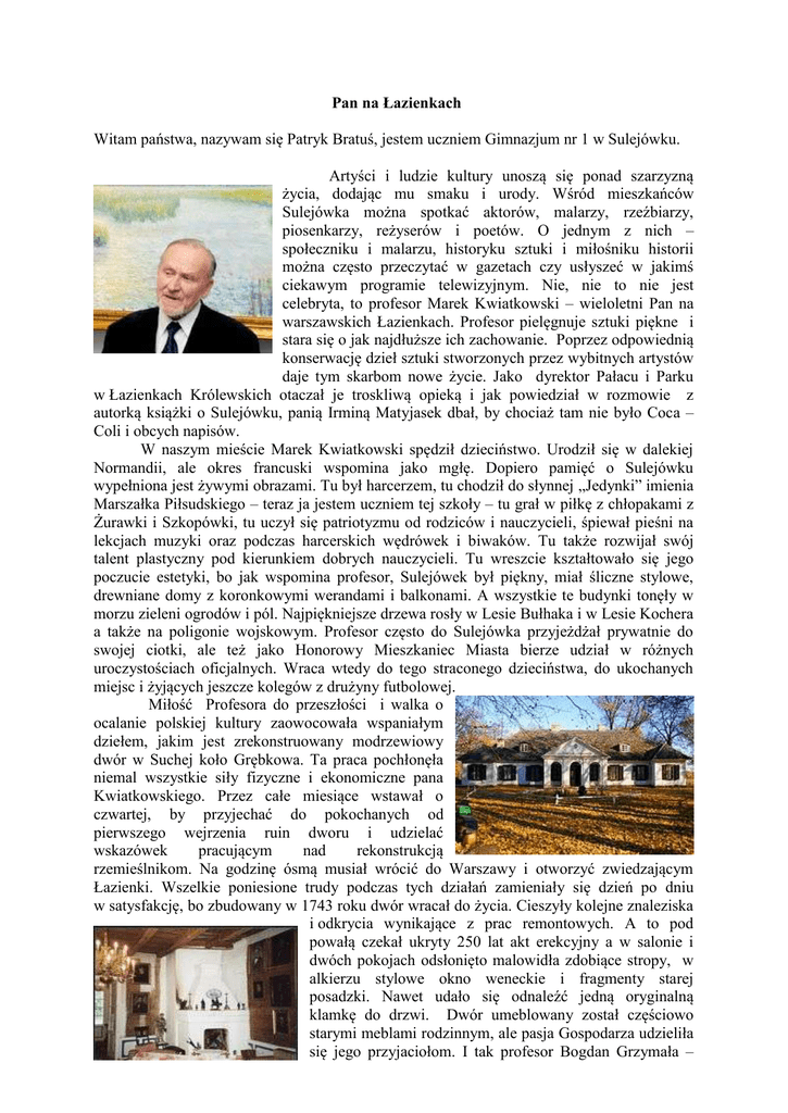 Pan na Łazienkach Witam państwa, nazywam się Patryk Bratuś, jestem uczniem Gimnazjum nr 1 w Sulejówku. Artyści i ludzie kultury unoszą się ponad szarzyzną życia, dodając mu smaku i urody. Wśród mieszkańców Sulejówka można spotkać aktorów, malarzy, rzeźbiarzy, piosenkarzy, reżyserów i poetów. O jednym z nich – społeczniku i malarzu, historyku sztuki i miłośniku historii można często przeczytać w gazetach czy usłyszeć w jakimś ciekawym programie telewizyjnym. Nie, nie to nie jest celebryta, to profesor Marek Kwiatkowski – wieloletni Pan na warszawskich Łazienkach. Profesor pielęgnuje sztuki piękne i stara się o jak najdłuższe ich zachowanie. Poprzez odpowiednią konserwację dzieł sztuki stworzonych przez wybitnych artystów daje tym skarbom nowe życie. Jako dyrektor Pałacu i Parku w Łazienkach Królewskich otaczał je troskliwą opieką i jak powiedział w rozmowie z autorką książki o Sulejówku, panią Irminą Matyjasek dbał, by chociaż tam nie było Coca – Coli i obcych napisów. W naszym mieście Marek Kwiatkowski spędził dzieciństwo. Urodził się w dalekiej Normandii, ale okres francuski wspomina jako mgłę. Dopiero pamięć o Sulejówku wypełniona jest żywymi obrazami. Tu był harcerzem, tu chodził do słynnej „Jedynki” imienia Marszałka Piłsudskiego – teraz ja jestem uczniem tej szkoły – tu grał w piłkę z chłopakami z Żurawki i Szkopówki, tu uczył się patriotyzmu od rodziców i nauczycieli, śpiewał pieśni na lekcjach muzyki oraz podczas harcerskich wędrówek i biwaków. Tu także rozwijał swój talent plastyczny pod kierunkiem dobrych nauczycieli. Tu wreszcie kształtowało się jego poczucie estetyki, bo jak wspomina profesor, Sulejówek był piękny, miał śliczne stylowe, drewniane domy z koronkowymi werandami i balkonami. A wszystkie te budynki tonęły w morzu zieleni ogrodów i pól. Najpiękniejsze drzewa rosły w Lesie Bułhaka i w Lesie Kochera a także na poligonie wojskowym. Profesor często do Sulejówka przyjeżdżał prywatnie do swojej ciotki, ale też jako Honorowy Mieszkaniec Miasta bierze udział w różnych uroczystościach oficjalnych. Wraca wtedy do tego straconego dzieciństwa, do ukochanych miejsc i żyjących jeszcze kolegów z drużyny futbolowej. Miłość Profesora do przeszłości i walka o ocalanie polskiej kultury zaowocowała wspaniałym dziełem, jakim jest zrekonstruowany modrzewiowy dwór w Suchej koło Grębkowa. Ta praca pochłonęła niemal wszystkie siły fizyczne i ekonomiczne pana Kwiatkowskiego. Przez całe miesiące wstawał o czwartej, by przyjechać do pokochanych od pierwszego wejrzenia ruin dworu i udzielać wskazówek pracującym nad rekonstrukcją rzemieślnikom. Na godzinę ósmą musiał wrócić do Warszawy i otworzyć zwiedzającym Łazienki. Wszelkie poniesione trudy podczas tych działań zamieniały się dzień po dniu w satysfakcję, bo zbudowany w 1743 roku dwór wracał do życia. Cieszyły kolejne znaleziska i odkrycia wynikające z prac remontowych. A to pod powałą czekał ukryty 250 lat akt erekcyjny a w salonie i dwóch pokojach odsłonięto malowidła zdobiące stropy, w alkierzu stylowe okno weneckie i fragmenty starej posadzki. Nawet udało się odnaleźć jedną oryginalną klamkę do drzwi. Dwór umeblowany został częściowo starymi meblami rodzinnym, ale pasja Gospodarza udzieliła się jego przyjaciołom. I tak profesor Bogdan Grzymała – Siedlecki podarował stary, pamiątkowy fortepian, który wspaniale osiadł we wnętrzu dworu, ktoś inny przekazał dwa kufry kryte skórą . Pewien rzeźbiarz – fragmenty lapidarialne, które osadzone zostały przed gankiem. Jeden z sąsiadów ofiarował stąd pochodzącą neogotycką rozetę umieszczoną na tympanonie ogrodowym. Kiedy już roboty przy dworze rozkręciły się na dobre, profesor Marek Kwiatkowski ruszył w teren Podlasia i Mazowsza. Marzył bowiem jeszcze o małym skansenie. Organistówkę ściągnął z Mokobód, plebanię z Grębkowa, wiatrak z Ostrówka, a piękną, datowaną na 1880 rok chałupę, aż z Garwolina. Drugą – w której, jak głosi legenda, ukrywał się podczas powstania styczniowego ksiądz Brzóska - aż zza Łukowa. Naprzeciw domu stoją też: karczma plebańska przewieziona ze Skrzeszewa oraz mały dworek przeniesiony z Siedlec. W ten sposób Sucha stała się skansenem, w którym można poznać historię naszego regionu. Na ratunek czekał też zdewastowany park. Na szczęście pozostało sporo starych drzew, trzeba było tylko go uporządkować i nasadzić młode rośliny. Staropolski dwór, zbudowany przez rodzinę Cieszkowskich, wita gości oryginalnym, zachowanym na tympanonie napisem: „Sub veteri tectu, sed parentali”, czyli „Pod starym, lecz ojczystym dachem”. I tak oto, pochodzący z Sulejówka artysta i historyk sztuki, a potem Pan na Łazienkach, odnalazł ukochaną przeszłość i urok dzieciństwa w tym jedynym na ziemi siedleckiej modrzewiowym barokowym dworze i zamieszkał „Pod starym, lecz ojczystym dachem”. Literatura podmiotu: Matyjasek – Jałowiecka Irmina „Historia mojego miasta”, cz. II, Sulejówek 1998 Żyburtowicz Zenon „Szlacheckie gniazda”, wyd. Alfa, Warszawa 1996 Opieka merytoryczna nad uczniem: Krystyna Pachnik, Zespół Szkół nr 1 w Sulejówku.