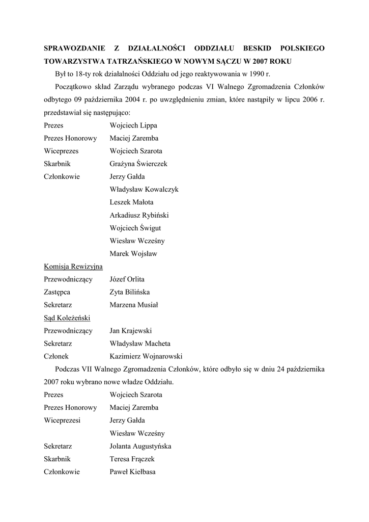 SPRAWOZDANIE Z DZIAŁALNOŚCI ODDZIAŁU BESKID POLSKIEGO TOWARZYSTWA TATRZAŃSKIEGO W NOWYM SĄCZU W 2007 ROKU Był to 18-ty rok działalności Oddziału od jego reaktywowania w 1990 r. Początkowo skład Zarządu wybranego podczas VI Walnego Zgromadzenia Członków odbytego 09 października 2004 r. po uwzględnieniu zmian, które nastąpiły w lipcu 2006 r. przedstawiał się następująco: Prezes Wojciech Lippa Prezes Honorowy Maciej Zaremba Wiceprezes Wojciech Szarota Skarbnik Grażyna Świerczek Członkowie Jerzy Gałda Władysław Kowalczyk Leszek Małota Arkadiusz Rybiński Wojciech Świgut Wiesław Wcześny Marek Wojsław Komisja Rewizyjna Przewodniczący Józef Orlita Zastępca Zyta Bilińska Sekretarz Marzena Musiał Sąd Koleżeński Przewodniczący Jan Krajewski Sekretarz Władysław Macheta Członek Kazimierz Wojnarowski Podczas VII Walnego Zgromadzenia Członków, które odbyło się w dniu 24 października 2007 roku wybrano nowe władze Oddziału. Prezes Wojciech Szarota Prezes Honorowy Maciej Zaremba Wiceprezesi Jerzy Gałda Wiesław Wcześny Sekretarz Jolanta Augustyńska Skarbnik Teresa Frączek Członkowie Paweł Kiełbasa Iwona Kowalczyk Joanna Król Leszek Opara Stanisław Smajdor Marta Treit Komisja Rewizyjna Przewodniczący Józef Orlita Zastępca Arkadiusz Rybiński Sekretarz Marzena Musiał Sąd Koleżeński Przewodniczący Wacław Raczkowski Sekretarz Ryszard Patyk Członek Kazimierz Wojnarowski W dniu 1 lutego 2007 siedziba Oddziału została przeniesiona z Rynku 15 /Przedsiębiorstwo Usług Turystycznych „ Artus-Tourist/ na ul. Lwowską 32 /Biuro Podróży „La Vista”/ gdzie odbywały się zapisy na wycieczki. SPRAWY CZŁONKOWSKIE W trakcie 2007 r. do Oddziału wstąpiło 12 osób, z tego 10 w Nowym, Sączu i 2 do Koła w Tarnobrzegu. Łącznie od czasu reaktywowania Oddziału w 1990 r. wstąpiło do niego 821 osób, w tym 598 w Nowym Sączu, 198 do Koła w Tarnobrzegu i 25 do Koła w Krynicy. W 2007 r. składki opłaciło 111osób, w tym 75 w Nowym Sączu i 41 w Tarnobrzegu. Jednak zgodnie ze statutem PTT, dopuszczającym roczne opóźnienie w ich płaceniu, na dzień 31 grudnia 2007 r. Oddział liczył 227 członków, w tym 113 w Nowym Sączu, 114 w Tarnobrzegu. DZIAŁALNOŚĆ WYCIECZKOWA Jest to podstawowa działalność Oddziału w myśl zasady, że miejsce PTT jest w górach. W Nowym Sączu zorganizowano 64 ogólnodostępne imprezy dla 2.149 osób. W większości były to wycieczki 1-dniowe, i odbyło się ich 52. Ponadto zorganizowano 7 imprez 2-dniowych, po jednej 3 i 4-dniowej oraz 2 wyprawy 6-dniowe i jedną 17-dniową. Najwięcej wycieczek odbyło się w Beskidzie Sądeckim – 9, ponadto w Tatrach, Beskidzie Wyspowym i po Pogórzu po 6, w Pieninach – 4, w Bieszczadach – 3, w Beskidzie Żywieckim i Beskidzie Niskim –po 2 oraz w Gorcach, Górach Słonnych, Górach Świętokrzyskich i po Jurze po 1. Naszą specjalnością stają się wycieczki po innych państwach i regionach europejskich. Doświadczenie, ciekawość poznawcza, kalkulacja non profit sprawia, że cieszą się one rosnącą popularnością. W słowackich Tatrach – 9, w innych słowackich górach – 8. W górach Czech, Austrii, Rumunii, Słowenii i Włoch po 1. Dojazd do gór odbywał się autokarami turystycznymi lub środkami lokomocji publicznej. Dla uatrakcyjnienia imprez, podczas części z nich odbywały się ogniska z pieczeniem kiełbasy. Kilka imprez to tradycyjne znajdujące się w kalendarzu Oddziału: Po raz 18-ty odbyło się przejście historycznej trasy z Piwnicznej przez Radziejową do Rytra, szlakiem pierwszej wycieczki nowosądeckiego ”Beskidu” w 1906 r. Po raz 3- ci w weekend Bożego Ciała zorganizowaliśmy poznawanie gór Rumunii oraz tego pięknego kraju. Z okazji Dnia Dziecka zorganizowaliśmy wycieczkę dla najmłodszych do Skamieniałego Miasta k/Ciężkowic. Trzeci raz z rzędu zorganizowaliśmy kilkudniowy wyjazd na narty, drugi rok z rzędu w Karkonosze w Czechach. Z cyklu „Nocne wędrowanie” oglądano w czerwcu wschód słońca z Babiej Góry. Z cyklu „ Winnym szlakiem” po raz czwarty zorganizowaliśmy wycieczkę, tym razem: szlakiem winnic Słowenii. Po raz 5 zorganizowaliśmy wystawę fotografii uczestników naszych wypraw, tym razem fotografii z Alp, która odbywa się w Restauracji Ratuszowa. Z okazji Święta Narodowego po raz kolejny ( 10-ty) zorganizowano wycieczkę „Szlakiem Legionów”, m.in. na cmentarz w Łowczówku. Wzięto udział w VIII Wielkopiątkowej drodze do Krzyża zorganizowanej przez Oddział w Mielcu. Kolejny raz wzięto udział w góralskiej pasterce na Wiktorówkach. Uczestniczyliśmy po raz 17 w „Noworocznej Mszy Ludzi Gór” na Jaworzynie. Grupa naszych członków uczestniczyła w VIII Dniach Gór PTT, które tym razem odbyły się w Górach Świętokrzyskich. Symboliczne zakończenie sezonu turystycznego odbyło się w Feleczynie. Najatrakcyjniejszą organizowaną przez nas imprezą była sierpniowo-wrześniowa wyprawa we włoskie Alpy. W pierwszym tygodniu wspinaliśmy się najpiękniejszymi ferratami Dolomitów ( Zandonella, Cesare Piazzeta, Vandelli, Bianchi, Lagauzoii). Zdobyto trzytysięczniki Cima di Mezzo 3221 m.npm, Tofana di Mezzo 3244 m npm, Piz Boe 3168 m n.pm. Następnie w Alpach Walijskich zdobyto Punta Gnifetti -4556 m. npm, Piramidę Vincent-4215 m.npm i Breithorn 4165 m. npm. Ponadto zwiedziliśmy Padwę, Aostę, Aronię wraz z Wyspami Boromejskimi na Jeziorze Maggiore. Kontynuowano współpracę z Sądeckim Uniwersytetem III Wieku. W 7 wycieczkach wzięło udział 201 osób. Wszystkie imprezy zorganizował Wiesław Wcześny. Prowadził je on oraz Maciej Zaremba. Ponadto słuchacze uczestniczyli w wielu naszych ogólnodostępnych imprezach. Afisze informujące o imprezach rozwieszane były w gablotach i tablicach umieszczonych w głównych punktach miasta. W związku z dotacją otrzymaną z Urzędu Miasta Nowego Sącza, uczestnicy pokrywali tylko cześć kosztów organizacyjnych, czyli 