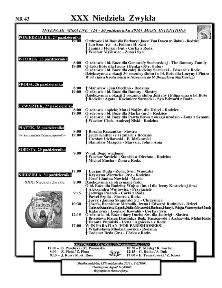 XXX Niedziela Zwykła NR 43 INTENCJE MSZALNE (24 - 30 października 2016) MASS INTENTIONS PONIEDZIAŁEK, 24 października 19:00 WTOREK, 25 października ŚRODA, 26 października 8:00 19:00 O zdrowie i bł. Boże dla Genowefy Suchorskiej - The Ramsay Family O łaski Boże dla Iwony i Benka (35 r. ślubu) O zdrowie i bł. Boże dla całej Rodziny Sarnacki - Edward z Rodz. Dziękczynna z okazji 30 rocznicy ślubu i o bł. Boże dla Lucyny i Piotra W int. chorych polecanych w Nowennie do bł. Bronisława Markiewicza 8:00 19:00 † Stanisław i Jan Olechno - Rodzina O zdrowie i bł. Boże dla Danuty - Siostry Dziękczynna z okazji 2 rocznicy ślubu Justyny i Filipa oraz o bł. Boże † Rodzice: Agata i Kazimierz Sarnacki - Syn Edward z Rodz. CZWARTEK, 27 października PIĄTEK, 28 października Św. Szymona i Judy Tadeusza, Apostołów SOBOTA, 29 października 8:00 19:00 O zdrowie i opiekę Matki Najśw. dla Dzieci - Rodzice O zdrowie i bł. Boże dla Marka (ur.) - Rodzice O zdrowie i bł. Boże dla Pawła Kawa z okazji urodzin - Żona z Synami † Wacław Cisek, Andrzej Niski - Rodzina 8:00 19:00 † Rozalia Rzeszutko - Siostra † Jerzy Knitter (r.) i zmarli z Rodziny † Czesław Idzikowski - E. Idzikowski † Stanisław Mazgola - Marysia, John i Ania 9:00 17:00 NIEDZIELA, 30 października XXXI Niedziela Zwykła O zdrowie i bł. Boże dla Barbary i Jason Van Dusen (r. ślubu) - Rodzice † Jan Szot (r.) - A. Fallon / H. Szot † Janina i Florian Gut - Córka z Rodz. † Wacław Myśliwiec - Żona i Syn 8:00 9:15 10:30 12:15 17:00 W int. Bogu wiadomej † Wacław Sawicki i Stanisław Olechno - Rodzina † Michał Mucha - Żona z Rodz. † Lucjan Duda - Żona, Syn i Wnuczka † Krystyna Wierucka (2r.) - Rodzina † Józef i Janina Nowicki - Maria Dziękczynna za otrzymane łaski O bł. Boże dla Rodziny Wojtas (im.) i dla Ireny Kosteckiej (im.) † Aleksandra Wójtowicz - Przyjaciele † Jadwiga Pisarek - Córki z Rodz. † Paweł Szpila - Siostra z Rodz. † Jurek i Janina Skupiński (r.) - Chrześnica † Józefa, Bronisław Michalik, Irena i Edward Rudnicki - Dzieci † TadeuszSztandera,Eugenia,StefanMrozowski,Barbara,Henryk,Pelagia,WawrzyniecChudy † Katarzyna i Leonard Kowalik - Córka i Syn O zdrowie, bł. Boże i dary Ducha Św. dla Jadwigi - Siostra † Bronisława, Roman Dmytruk, z Rodz. Tomaszewski i Andrzewski, Mishel Radic † Danuta Pupiński - Irena i Agnieszka z Rodz. W IN PARAFIAN (FOR PARISHIONERS) † Władysława Młodzianowska - Rodzina † Tadeusz Reda (2r.) - Córka z Rodz. LEKTORZY / READERS: 29/30 października, 2016r. 17:00 – B. Porębska / M. Pomorska 8:00 – Z. Plota / Z. Plota 9:15 – J. Ross / M.-A. Ross 10:30 – P. Mastej / R. Kochel 12:15 – G. Rutka / S. Duk 17:00 – E. Truszkowski / Z. Kawa Składka niedzielna, 15/16 października, 2016 r.: $ 4,210.00 Thanksgiving Appeal: $ 1,400.00 Bóg zapłać za złożone ofiary!