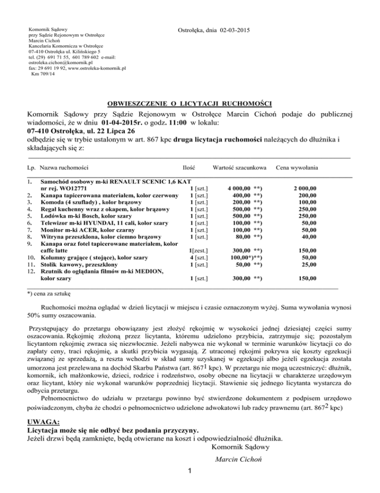 Komornik Sądowy przy Sądzie Rejonowym w Ostrołęce Marcin Cichoń Kancelaria Komornicza w Ostrołęce 07-410 Ostrołęka ul. Kilińskiego 5 tel. (29) 691 71 55, 601 789 602 e-mail: [email protected] fax: 29 691 19 92, www.ostroleka-komornik.pl Km 709/14 Ostrołęka, dnia 02-03-2015 OBWIESZCZENIE O LICYTACJI RUCHOMOŚCI Komornik Sądowy przy Sądzie Rejonowym w Ostrołęce Marcin Cichoń podaje do publicznej wiadomości, że w dniu 01-04-2015r. o godz. 11:00 w lokalu: 07-410 Ostrołęka, ul. 22 Lipca 26 odbędzie się w trybie ustalonym w art. 867 kpc druga licytacja ruchomości należących do dłużnika i składających się z: ____________________________________________________________________________________________________ Lp. Nazwa ruchomości Ilość Wartość szacunkowa Cena wywołania _____________________________________________________________________________________________________ 1. Samochód osobowy m-ki RENAULT SCENIC 1,6 KAT nr rej. WO12771 1 [szt.] 4 000,00 **) 2 000,00 2. Kanapa tapicerowana materiałem, kolor czerwony 1 [szt.] 400,00 **) 200,00 3. Komoda (4 szuflady) , kolor brązowy 1 [szt.] 200,00 **) 100,00 4. Regał kuchenny wraz z okapem, kolor brązowy 1 [szt.] 500,00 **) 250,00 5. Lodówka m-ki Bosch, kolor szary 1 [szt.] 500,00 **) 250,00 6. Telewizor m-ki HYUNDAI, 11 cali, kolor szary 1 [szt.] 100,00 **) 50,00 7. Monitor m-ki ACER, kolor czarny 1 [szt.] 100,00 **) 50,00 8. Witryna przeszklona, kolor ciemno brązowy 1 [szt.] 80,00 **) 40,00 9. Kanapa oraz fotel tapicerowane materiałem, kolor caffe latte 1[zest.] 300,00 **) 150,00 10. Kolumny grające ( stojące), kolor szary 4 [szt.] 100,00*)**) 50,00 11. Stolik kawowy, przeszklony 1 [szt.] 50,00 **) 25,00 12. Rzutnik do oglądania filmów m-ki MEDION, kolor szary 1 [szt.] 300,00 **) 150,00 _______________________________________________________________________________________________________________________ *) cena za sztukę Ruchomości można oglądać w dzień licytacji w miejscu i czasie oznaczonym wyżej. Suma wywołania wynosi 50% sumy oszacowania. Przystępujący do przetargu obowiązany jest złożyć rękojmię w wysokości jednej dziesiątej części sumy oszacowania. Rękojmię złożoną przez licytanta, któremu udzielono przybicia, zatrzymuje się; pozostałym licytantom rękojmię zwraca się niezwłocznie. Jeżeli nabywca nie wykonał w terminie warunków licytacji co do zapłaty ceny, traci rękojmię, a skutki przybicia wygasają. Z utraconej rękojmi pokrywa się koszty egzekucji związanej ze sprzedażą, a reszta wchodzi w skład sumy uzyskanej w egzekucji albo jeżeli egzekucja została umorzona jest przelewana na dochód Skarbu Państwa (art. 8671 kpc). W przetargu nie mogą uczestniczyć: dłużnik, komornik, ich małżonkowie, dzieci, rodzice i rodzeństwo, osoby obecne na licytacji w charakterze urzędowym oraz licytant, który nie wykonał warunków poprzedniej licytacji. Stawienie się jednego licytanta wystarcza do odbycia przetargu. Pełnomocnictwo do udziału w przetargu powinno być stwierdzone dokumentem z podpisem urzędowo poświadczonym, chyba że chodzi o pełnomocnictwo udzielone adwokatowi lub radcy prawnemu (art. 8672 kpc) UWAGA: Licytacja może się nie odbyć bez podania przyczyny. Jeżeli drzwi będą zamknięte, będą otwierane na koszt i odpowiedzialność dłużnika. Komornik Sądowy Marcin Cichoń 1 2