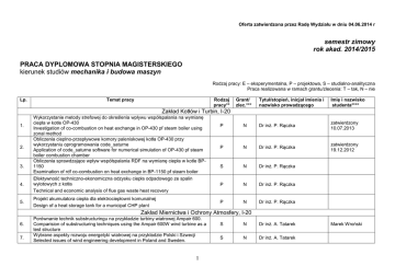 Oferta zatwierdzona przez Radę Wydziału w dniu 04.06.2014 r semestr zimowy rok akad. 2014/2015 PRACA DYPLOMOWA STOPNIA MAGISTERSKIEGO kierunek studiów mechanika i budowa maszyn Rodzaj pracy: E – eksperymentalna, P – projektowa, S – studialno-analityczna Praca realizowana w ramach grantu/zlecenia: T – tak, N – nie Lp. Temat pracy Rodzaj pracy** Grant/ zlec.*** Tytuł/stopień, inicjał imienia i nazwisko prowadzącego Imię i nazwisko studenta**** Zakład Kotłów i Turbin, I-20 1. 2. 3. Wykorzystanie metody strefowej do określenia wpływu współspalania na wymianę ciepła w kotle OP-430 Investigation of co-combustion on heat exchange in OP-430 pf steam boiler using zonal method Obliczenia cieplno-przepływowe komory paleniskowej kotła OP-430 przy wykorzystaniu oprogramowania code_saturne Application of code_saturne software for numerical simulation of OP-430 pf steam boiler combustion chamber Obliczenia sprawdzające wpływ współspalania RDF na wymianę ciepła w kotle BP1150 Examination of rdf co-combustion on heat exchange in BP-1150 pf steam boiler P N Dr inż. P. Rączka zatwierdzony 10.07.2013 P N Dr inż. P. Rączka zatwierdzony 19.12.2012 S N Dr inż. P. Rączka 4. Efektywność techniczno-ekonomiczna odzysku ciepła odpadowego ze spalin wylotowych z kotła Technical and economic analysis of flue gas waste heat recovery P N Dr inż. P. Rączka 5. Projekt akumulatora ciepła dla elektrociepłowni komunalnej Design of a heat storage tank for a municipal CHP plant P N Dr inż. P. Rączka Zakład Miernictwa i Ochrony Atmosfery, I-20 6. 7. Porównanie technik substructuringu na przykładzie turbiny wiatrowej Ampair 600. Comparision of substructuring techniques using the Ampair 600W wind turbine as a test structure Wybrane aspekty rozwoju energetyki wiatrowej na przykładzie Polski i Szwecji Selected issues of wind engineering development in Poland and Sweden. 1 S N Dr inż. A. Tatarek S N Dr inż. A. Tatarek Marek Wroński Zakład Aparatury Procesowej, I-22 8. 9. 10. 11. 12. 13. Porównanie krystalizacji przez chłodzenie pośrednie z krystalizacją próżniową Comparison indirect cooling crystallization and vacuum crystallization Algorytm symetryzacji projekcyjnego obrazu cząstki ciała stałego. Symmetrization algorithm of solid particle projective image. Projekt instalacji do nitryfikacji i denitryfikacji odcieków ze składowisk odpadów Design of the system for nitrification and de-nitrification of landfill leachate Projekt instalacji doświadczalnej do monitorowania gazu wydzielanego ze składowiska odpadów Design of the experimental system for monitoring of landfill gas Wstępne oczyszczanie wycieków ze składowiska odpadów Primary treatment of landfill leachate Badania eksperymentalne wpływu procesu zamrażania na koagulację cząstek Experimental studies on the influence of the freezing process on coagulation of particles zatwierdzony 18.12.2013 Zatwierdzono 29.01.2014 S N Dr inż. S. Misztal P N dr inż. A. Sulkowski P N Dr inż. J. Szpaczyński P N Dr inż. J. Szpaczyński E N Dr inż. J. Szpaczyński E N Dr inż. J. Szpaczyński S N Dr hab. inż. C. Szczepański P N Dr hab. inż. C. Szczepański S N Dr hab. inż. C. Szczepański P N Dr hab. inż. C. Szczepański P N Dr hab. inż. C. Szczepański P N Dr hab. inż. C. Szczepański zatwierdzony 30.11.2011 zatwierdzony 29.01.2014 Zakład Inżynierii Lotniczej, I-22 19. Koncepcja zespołu BSP realizujących zadanie patrolowania strefy granicznej w trybie autonomicznym Concept of UAVs team performing the patrolling of border zone in autonomous mode Projekt koncepcyjny systemu startu i lądowania BSP typu samolotowego bazującego na okręcie Conceptual design of ship based aeroplane UAV take-off and landing system Koncepcja systemu szkolenia operatorów i mechaników obsługujących BSP Concept of UAV operators and mechanics training system Projekt pokładowego wyposażenia nawigacyjnego i rozpoznawczego BSP do patrolowania granicy państwa Design of UAV on-board navigational and reconnaissance equipment dedicated to state boarder Projekt wstępny wyposażenia pilotażowo-nawigacyjnego szybowca Initial design of sail plane navigation and pilot equipment Model matematyczny atmosfery burzliwej dla symulatora lotu Mathematical model of the turbulent atmosphere for the flight simulator 20. Model matematyczny pilota samolotu Mathematical model of the aeroplane pilot S N Dr hab. inż. C. Szczepański zatwierdzony 30.11.2011 21. Koncepcja inercjalnego systemu nawigacji samolotu Concept of the airplane inertial navigation system P N Dr hab. inż. C. Szczepański P N Dr hab. inż. C. Szczepański S N Dr hab. inż. C. Szczepański zatwierdzony 18.05.2011 zatwierdzony 18.05.2011 zatwierdzony 18.05.2011 14. 15. 16. 17. 18. 22. 23. Projekt wstępny autopilota dla samolotu klasy general aviation Initial design of autopilot for the general aviation type aeroplane Badanie autopilota kursu samolotu Aeroplane course autopilot investigation 2 25. Badanie autopilota wysokości lotu samolotu Aeroplane altitude autopilot investigation Koncepcja systemu lądowania BSP w terenie przygodnym Concept of UAV landing system in unprepared terrain 26. Studium projektowe systemu BSP bazujących na okręcie Design study of UAV system based on ship 24. 27. 28. 29. 30. 31. 32. 33. 34. 35. 36. Koncepcja modernizacji awioniki śmigłowca Concept of helicopter avionics modernisation Koncepcja modernizacji awioniki samolotu transportowego Concept of transport aeroplane avionics modernisation Koncepcja modernizacji awioniki samolotu bojowego Concept of combat aeroplane avionics system modernisation Projekt wstępny wyposażenia kokpitu liniowego samolotu pasażerskiego Initial design of airliner cockpit equipment Projekt wstępny wyposażenia kokpitu samolotu turystycznego Initial design of general aviation aeroplane equipment Projekt wstępny wyposażenia kokpitu samolotu bojowego Initial design of combat aeroplane equipment Projekt wstepny wyp
