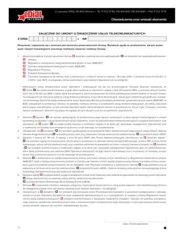 ul. Lwowska 31/102, 56-400 Oleśnica • Tel. 71 722 37 90, 735 400 600, 735 400 800 • FAX 71 722 37 91 Oświadczenia oraz wnioski abonenta ZAŁĄCZNIK DO UMOWY O ŚWIADCZENIE USŁUG TELEKOMUNIKACYJNYCH Z DNIA . . r. NR Otrzymanie i zapoznanie się z wzorcami jest konieczne przed zawarciem Umowy. Wyrażenie zgody na przetwarzanie danych osobowych i danych transmisyjnych warunkuje możliwość zawarcia i realizacji Umowy. 1. Abonent oświadcza, iż przed zawarciem Umowy otrzymał (i zapoznał się oraz zaakceptował) / nie otrzymał (i nie zaakceptował) wzorzec: Umowy, Regulaminu świadczenia usług telekomunikacyjnych w sieci AWB-NET, Cennika usług telekomunikacyjnych w sieci AWB-NET, Regulaminu Promocji, Protokół Przekazania Sprzętu, Formularz odstąpienia od umowy wraz z informacjami, o których mowa w ustawie z 30 maja 2014 r. o prawach konsumenta (Dz. U. z 2014 r. poz. 827), w przypadku umów zawieranych poza lokalem Operatora lub na odległość dotyczących usług świadczonych przez Operatora i zobowiązuje się do ich przestrzegania. Ponadto Abonent oświadcza, że został nie został poinformowany, iż jego dane osobowe w rozumieniu ustawy z dnia 29 sierpnia 1997r. o ochronie danych osobowych (Dz.U. Nr 133 poz 883), a także dane transmisyjne tj. dane przetwarzane do celów przekazywania komunikatów w sieciach telekomunikacyjnych lub naliczania opłat za usługi telekomunikacyjne, w tym dane lokalizacyjne, wskazujące położenie geograficzne urządzenia końcowego Abonenta będą przetwarzanie przez Agnieszkę Barzdo prowadzącą działalność gospodarczą pod nazwą AWB-NET, w BOK, wskazanym w komparycji Umowy, na potrzeby realizacji Umowy o świadczenie usług telekomunikacyjnych, do której załączane jest niniejsze oświadczenie i w tym zakresie Operator będzie administratorem danych w rozumieniu art. 23 ust. 1 pkt. 3 ustawy o ochronie danych osobowych. Abonent ma prawo do wglądu do tych danych oraz ich uzupełnienia i poprawienia. 2. 3. 4. 5. 6. 7. 8. wyraża / nie wyraża zgodę/zgody na przetwarzanie jego danych osobowych, a także danych transmisyjnych w celach prezentacji produktów i usług świadczonych przez Operatora, w tym za pośrednictwem telekomunikacyjnych urządzeń końcowych oraz oświadcza, że został / nie został poinformowany o możliwości wglądu w te dane, jak i pozostałe udostępnione Operatorowi oraz o możliwości ich korekty oraz wniesienia sprzeciwu co do dalszego ich przetwarzania. Oświadczam, że wyrażam / nie wyrażam zgodę/zgody na otrzymywanie faktur elektronicznych dotyczących usług, których dotyczy Umowa drogą elektroniczną na podany przeze mnie przy zawieraniu Umowy adres poczty elektronicznej / za pośrednictwem wBOK. Zgodnie z treścią art. 161 ust. 3 ustawy z dnia 16 lipca 2004 roku Prawo telekomunikacyjne oświadczam, że wyrażam zgodę / nie wyrażam zgody na przetwarzanie moich danych osobowych w zakresie adresu korespondencyjnego, numeru NIP, numeru konta bankowego, adresu poczty elektronicznej, oraz numerów telefonów kontaktowych w celach realizacji Umowy a ponadto, że zostałem / nie zostałem poinformowany o możliwości wglądu w te dane, jak i pozostałe udostępnione Operatorowi jako ich administratorowi, które będą przetwarzane pod adresem BOK Operatora wskazanym na jego stronie internetowej oraz o możliwości ich korekty, uzupełnienia oraz wniesienia sprzeciwu co do dalszego ich przetwarzania. Wnoszę o dostarczanie mi każdej proponowanej zmiany warunków Umowy, w tym określonych w Regulaminie świadczenia usług w AWB-NET także o każdej proponowanej zmianie w Cenniku jak również o treści każdej proponowanej zmiany warunków umowy zawartej za pomocą środków porozumiewania się na odległość oraz informacji związanych z wykonaniem Umowy drogą elektroniczną na wskazany w Umowie adres poczty elektronicznej / za pośrednictwem wBOK, chyba że przepisy powszechnie obowiązującego prawa przewidują zawiadomienia poprzez publiczne ogłoszenie. Wyrażam zgodę na potwierdzanie przyjęcia składanych przeze mnie reklamacji oraz udzielania odpowiedzi na reklamacje przez Operatora: drogą elektroniczną na wskazany adres poczty elektronicznej Abonenta, za pośrednictwem Wirtualnego Biura Obsług Klienta (wBOK), Wnoszę o wykonanie instalacji i aktywacji usług oraz rozpoczęcie świadczenia mi usług przed upływem czternastodniowego terminu do odstąpienia przeze mnie od Umowy zawartej poza lokalem Operatora / na odległość. Oświadczam, iż zostałem / nie zostałem poinstruowany przez Przedstawiciela Operatora o sposobach postępowania z udostępnionym mi przez Operatora Sprzętem w razie wyładowań atmosferycznych, a w szczególności, w związku z treścią Regulaminu świadczenia usług telekomunikacyjnych zostałem poinformowany o obowiązku odłączenia Urządzeń i Sprzętu od zasilania energetycznego podczas wyładowań atmosferycznych oraz o konsekwencjach niedopełnienia tego obowiązku, w tym ewentualnej konieczności zwrotu kosztów naprawy lub wartości uszkodzonego Sprzętu. Abonent DATA I PODPIS ABONENTA 2.3 1