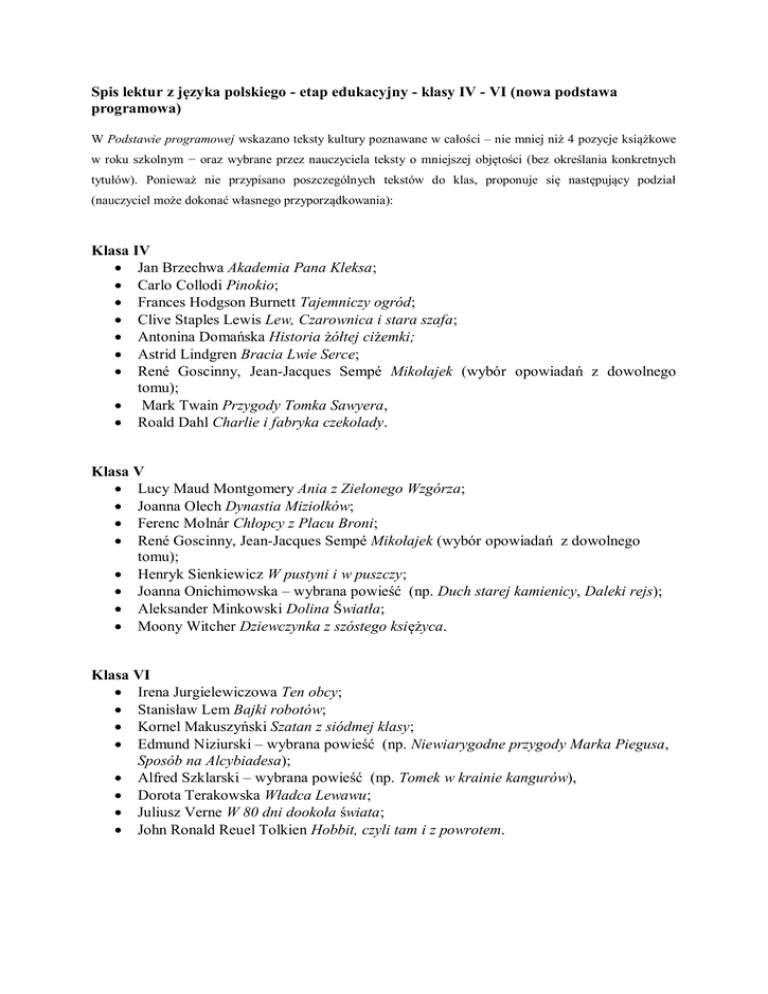 Spis lektur z języka polskiego - etap edukacyjny - klasy IV - VI (nowa podstawa programowa) W Podstawie programowej wskazano teksty kultury poznawane w całości – nie mniej niż 4 pozycje książkowe w roku szkolnym − oraz wybrane przez nauczyciela teksty o mniejszej objętości (bez określania konkretnych tytułów). Ponieważ nie przypisano poszczególnych tekstów do klas, proponuje się następujący podział (nauczyciel może dokonać własnego przyporządkowania): Klasa IV Jan Brzechwa Akademia Pana Kleksa; Carlo Collodi Pinokio; Frances Hodgson Burnett Tajemniczy ogród; Clive Staples Lewis Lew, Czarownica i stara szafa; Antonina Domańska Historia żółtej ciżemki; Astrid Lindgren Bracia Lwie Serce; René Goscinny, Jean-Jacques Sempé Mikołajek (wybór opowiadań z dowolnego tomu); Mark Twain Przygody Tomka Sawyera, Roald Dahl Charlie i fabryka czekolady. Klasa V Lucy Maud Montgomery Ania z Zielonego Wzgórza; Joanna Olech Dynastia Miziołków; Ferenc Molnár Chłopcy z Placu Broni; René Goscinny, Jean-Jacques Sempé Mikołajek (wybór opowiadań z dowolnego tomu); Henryk Sienkiewicz W pustyni i w puszczy; Joanna Onichimowska – wybrana powieść (np. Duch starej kamienicy, Daleki rejs); Aleksander Minkowski Dolina Światła; Moony Witcher Dziewczynka z szóstego księżyca. Klasa VI Irena Jurgielewiczowa Ten obcy; Stanisław Lem Bajki robotów; Kornel Makuszyński Szatan z siódmej klasy; Edmund Niziurski – wybrana powieść (np. Niewiarygodne przygody Marka Piegusa, Sposób na Alcybiadesa); Alfred Szklarski – wybrana powieść (np. Tomek w krainie kangurów), Dorota Terakowska Władca Lewawu; Juliusz Verne W 80 dni dookoła świata; John Ronald Reuel Tolkien Hobbit, czyli tam i z powrotem. Ponadto w Podstawie wymieniono gatunki krótszych utworów, których reprezentatywne i wartościowe tytuły powinny zostać omówione na lekcjach języka polskiego: wybór mitów greckich, baśni i legend; wybór kolęd; wybór pieśni patriotycznych; wybór poezji, w tym utwory dla dzieci i młodzieży; film i widowisko teatralne z repertuaru dziecięcego; wybrane programy telewizyjne.