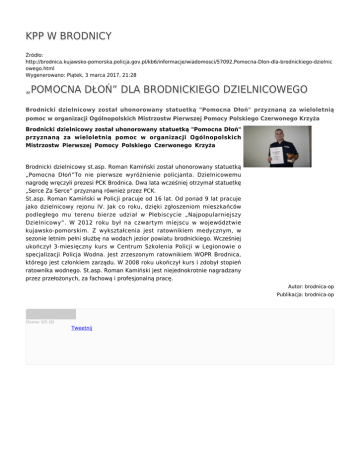 KPP W BRODNICY Źródło: http://brodnica.kujawsko-pomorska.policja.gov.pl/kb6/informacje/wiadomosci/57092,Pomocna-Dlon-dla-brodnickiego-dzielnic owego.html Wygenerowano: Piątek, 3 marca 2017, 21:28 „POMOCNA DŁOŃ” DLA BRODNICKIEGO DZIELNICOWEGO Brodnicki dzielnicowy został uhonorowany statuetką "Pomocna Dłoń" przyznaną za wieloletnią pomoc w organizacji Ogólnopolskich Mistrzostw Pierwszej Pomocy Polskiego Czerwonego Krzyża Brodnicki dzielnicowy został uhonorowany statuetką "Pomocna Dłoń" przyznaną za wieloletnią pomoc w organizacji Ogólnopolskich Mistrzostw Pierwszej Pomocy Polskiego Czerwonego Krzyża Brodnicki dzielnicowy st.asp. Roman Kamiński został uhonorowany statuetką „Pomocna Dłoń”To nie pierwsze wyróżnienie policjanta. Dzielnicowemu nagrodę wręczyli prezesi PCK Brodnica. Dwa lata wcześniej otrzymał statuetkę „Serce Za Serce” przyznaną również przez PCK. St.asp. Roman Kamiński w Policji pracuje od 16 lat. Od ponad 9 lat pracuje jako dzielnicowy rejonu IV. Jak co roku, dzięki zgłoszeniom mieszkańców podległego mu terenu bierze udział w Plebiscycie „Najpopularniejszy Dzielnicowy”. W 2012 roku był na czwartym miejscu w województwie kujawsko-pomorskim. Z wykształcenia jest ratownikiem medycznym, w sezonie letnim pełni służbę na wodach jezior powiatu brodnickiego. Wcześniej ukończył 3-miesięczny kurs w Centrum Szkolenia Policji w Legionowie o specjalizacji Policja Wodna. Jest zrzeszonym ratownikiem WOPR Brodnica, którego jest członkiem zarządu. W 2008 roku ukończył kurs i zdobył stopień ratownika wodnego. St.asp. Roman Kamiński jest niejednokrotnie nagradzany przez przełożonych, za fachową i profesjonalną pracę. Autor: brodnica-op Publikacja: brodnica-op Ocena: 0/5 (0) Tweetnij