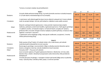 *oz a za, że przepis z ajduje się pod jadłospise Ś iada ie Dzień I kro ki hle a peł oziar istego 9 g , g asła ie iutka warstwa a każdej ka ap e , i / ł żki dże u iskosłodzo ego a trz ka apki , II ś iada ie ał a a i pół szkla ki jagód lu dwie trze ie szkla ki truskawek lu trze ie szkla ki ali w postaj i koktajlu lu ie , jeśli koktajl to z ddatkie wod wedle uz a ia Obiad Podwieczorek Kolacja Róż zki z jed ego rokuła ugotowa e , duż po idor ajs a z iejsz ędzie ali ow , pokrojo w dość duże kawałki , gotowa e jaja kurze, ł żki jogurtu gre kiego z zą ka i zos ku, / ł że zki orega o, / ł że zki az lii, sz z ptą soli i pieprzu, grillowa filet z kur zaka glu s ażo ajlepiej a patel i grillowej, a ł że z e oleju Jaglanka z orzechami i owocami* opakowa ie serka wiejskiego g , ał pę zek rzodkiewek, sz z piorek, kro ka hle a peł oziar isteg g Kcal Ś iada ie II ś iada ie Obiad Podwieczorek Kolacja W T 309,45 9,08 51,34 6,09 196,5 2,82 43,55 1,55 488,62 54,01 22,08 18,56 320,4 8,3 45,5 12,05 210,5 24,56 10,91 7,06 1525,47 Dzień II Płatki owsia e g/ ł żek , / szkla ki leka , %, śred i a a , pół szkla ki ali / orówek/truskawek/lu i t h owo ów Reszta jogurtu gre kiego z w zoraj około g ze szkla ką owo ów dowol e opró z a a a, wi ogro o oże ć, ale jako dodatek do i h owo ów Potrawka hilli* + g r żu / szkla ki Łosoś orweski wędzo g/pół opakowa ia Mari ero z Biedro ki , / i u sałat, ł że zka oliw z oliwek z dowol i prz prawa i, ł żka sło e z ika, kilka po idorów koktajlowych kro ki pie z wa hrupkiego z twarogie hud pół kostki/ g utart a jed olitą asę z ł że zką oliw i odro i ą leka, pieprz, a wierz h po idor B 98,77 173,38 45,31 360,85 11,25 63,92 5,57 164,6 13,05 20,43 3,06 426,5 15,65 73,92 7,06 256,2 20,64 7,86 16,05 243,89 20,82 26,27 6,36 1452,04 81,41 192,4 38,1 Dzień III Ś iada ie II ś iada ie Obiad Podwieczorek Kolacja Ś iada ie II ś iada ie Obiad Podwieczorek Kolacja Jajko sadzo e a ł że z e oleju , kro ki hle a peł oziar istego g , szkla ka soku ar hwiowego z sokowirówki lu jed od iow ez dodaktu ukru p.. arwit g zu ate ł żki płatków owsia h/ew płaskie ł żki usli + i / szkla ki dowol h ow ów opro z a a a, wi ogro o jako dodatek Potrawka hilli* + g r żu / szkla ki Koktajl a a owo-truskawkow a leku duż a a , szkla ka truskawek, pół szkla ki mleka 1,5%) Łosoś orweski wędzo g/pół opakowa ia Mari ero z Biedro ki z w zoraj , / i u sałat z w zoraj, ł że zka oliw z oliwek z dowol i prz prawa i, ł żka sło e z ika, kilka po idorów koktajlow h Dzień IV Płatki owsia e g/ ł żek , / szkla ki leka , %, pół a a a, pół szkla ki ali / orówek/truskawek/lu i t h owo ów Jajko sadzo e a ak s al ie ł że z e oleju , kro ka hle a peł oziar istego g, po idor/ogórek/papr ka dowol e, dla s aku Pół pa zki warz w rożo h, g kur zaka grillowa ego lu s ażo ego ajlepiej a patel i grillowej a ł że z e oleju , pół wore zka r żu / szkla ki Deser owo ow * resztę jogurtu w korz stać azajutrz Potrawka chilli* 343,6 12,99 42,12 11,81 194,7 4,62 35,13 3,18 426,5 15,65 73,92 7,06 270 6,36 51,93 2,89 256,2 20,64 7,86 16,05 1491 60,26 210,96 40,99 360,85 11,25 63,92 5,57 239,2 14,64 11,96 13,76 373,5 32,95 44 7,09 376,4 16,82 41,07 16,83 179,4 10,68 20,16 5,73 1529,35 86,34 181,11 48,98 Dzień V Ś iada ie II ś iada ie Obiad Podwieczorek Kolacja Ka apki kro ki pie z wa peł oziar istego=9 g pos arowa e ie iutką warstwą dowolnymi warzywami wafle r żowe, pos arowa e awokado / owo u z po idora i Spaghetti* + 100 g makarnu tagiatelle/spaghetti/penne Deser owocowy* Serek wiejski lekki (150 g) asła z 268,14 8,96 35,79 8,53 238,9 5,39 32,37 11,03 589 35,7 81 12,5 376,4 16,82 41,07 16,83 121,5 16,5 3,6 4,5 Ś iada ie II ś iada ie Obiad Podwieczorek Kolacja Dzień VI Płatki owsia e g/ ł żek , / szkla ki leka , %, pół a a a, pół szkla ki ali / orówek/truskawek/lu i t h owo ów G dowol h orze hów/ igdałów Spaghetti* + 100 g makaronu tagiatelle/spaghetti/penne g zu ate ł żki płatków owsia h/ew płaskie ł żki usli + i / szkla ki dowol h ow ów opro z a a a, wi ogro o jako dodatek wafle r żowe, pos arowa e awokado / owo u z po idora i 360,85 11,25 63,92 5,57 169,8 4,23 13,56 11,01 589 35,7 81 12,5 194,7 4,62 35,13 3,18 238,9 5,39 32,37 11,03 1553,25 Dzień VII 61,19 225,98 43,29 Jede dzień w t god iu ez ko kret ej rozpiski: je zgod ie z zasada i zdrowego Około k al, o heat ealu ie odż wia ia, a jede z posiłków oże ć zagospodarowa w dowol sposó do k al traktuje jako dodatkow posiłek, a jede p. kawałki pizz , urger z ał i fr tka i, ał lu zależ ie od ki a śred i pop or i z pię iu sta dardow h litr coli w kinie) Przepisy Przepis a trz por je zgod ie z założe ia i jadłospisu, podawać z r że /kaszą/pie zo i zie iaka i: • puszka zerwo ej fasoli około g od edzo ej i opłuka ej lu pół szkla ki su hej fasoli, a o zo ej przez o i ugotowa ej do iękkoś i • puszka po idorów krojo h lu ał h, które póź iej trze a ędzie rozdr ić • ała zerwo a e ula • zerwo a papr ka Potrawka Chilli 1 • alutka ar hewka porcja: KCAL: • pę zek kole dr lu atki pietruszki / ł że zka ielo ego k i u, / ł że zki ostrej papr ki, / ł że zka słodkiej papr ki, / 179,40 B: 10,68 W: ł ze zki wędzo ej papr ki, ł że zka o tu alsa i z ego jeśli asz , sok z połówki li o ki, sól i pieprz wedle uz a ia , pół ł że zki 20,16 T: 5,73 kolendry • Olej kokosow lu i do s aże ia . Prz gotowa ie: do gar ka wrzu ić o ra ą i pokroj ą e ulę, oraz pokrojo ą papr kę i wsz stkie prz praw . Po około i uta h dodać po idor , fasolę, o et alsa i z . Dusić pod prz kr ie około godzi ę. op jo al ie skropić sokie z li o ki przed poda ie . PS. Moż a prz gotować większą ilość, u ieś ić w słoika h, dorzu ić do każdego po ł że z e oliw , u ieś ić w gar ku z wrzą ą wodą i przez i ut gotować a wol og iu. Potrawkę oż a rów ież za rozić. Jaglanka z orzechami i owocami g kasz jag