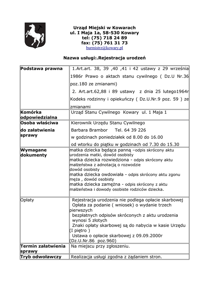 Urząd Miejski w Kowarach ul. I Maja 1a, 58-530 Kowary tel: (75) 718 24 89 fax: (75) 761 31 73 [email protected] Nazwa usługi:.Rejestracja urodzeń Podstawa prawna 1.Art.art. 38, 39 ,40 ,41 i 42 ustawy z 29 września 1986r Prawo o aktach stanu cywilnego ( Dz.U Nr.36 poz.180 ze zmianami) 2. Art.art.62,88 i 89 ustawy z dnia 25 lutego1964r Kodeks rodzinny i opiekuńczy ( Dz.U.Nr.9 poz. 59 ) ze Komórka odpowiedzialna Osoba właściwa do załatwienia sprawy Wymagane dokumenty zmianami Urząd Stanu Cywilnego Kowary ul. 1 Maja 1 Kierownik Urzędu Stanu Cywilnego Barbara Brambor Tel. 64 39 226 w godzinach poniedziałek od 8.00 do 16.00 od wtorku do piątku w godzinach od 7.30 do 15.30 matka dziecka będąca panną –odpis skrócony aktu urodzenia matki, dowód osobisty matka dziecka rozwiedziona - odpis skrócony aktu małżeństwa z adnotacją o rozwodzie dowód osobisty matka dziecka owdowiała - odpis skrócony aktu zgonu męża , dowód osobisty matka dziecka zamężna - odpis skrócony z aktu małżeństwa i dowody osobiste rodziców dziecka. Opłaty Rejestracja urodzenia nie podlega opłacie skarbowej Opłata za podanie ( wniosek) o wydanie trzech pierwszych bezpłatnych odpisów skróconych z aktu urodzenia wynosi 5 złotych Znaki opłaty skarbowej są do nabycia w kasie Urzędu (I piętro ) Ustawa o opłacie skarbowej z 09.09.2000r (Dz.U.Nr.86 poz.960) Termin załatwienia Na miejscu przy zgłoszeniu. sprawy Tryb odwoławczy Realizacja usługi zgodna z żądaniem stron. Opis usługi Formularze do pobrania Uwagi Opracował Barbara Brambor 25.11.2005 r. Rejestracji urodzenia w USC należy dokonać w terminie do 14 dni od dnia urodzenia dziecka na podstawie wyżej wymienionych dokumentów w zależności od stanu cywilnego matki dziecka. data Sprawdził Czesław Mikicki 25.11.2005 r. data Zatwierdził data Burmistrz Miasta Kowary 25.11.2005 r.