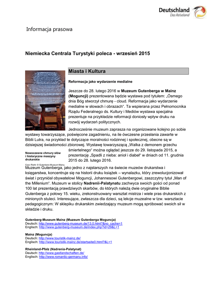 Informacja prasowa Incoming styczeńCentrala – maj 2015 Turystyki poleca - wrzesień 2015 Niemiecka Miasta i Kultura Reformacja jako wydarzenie medialne Jeszcze do 28. lutego 2016 w Muzeum Gutenberga w Mainz (Moguncji) prezentowana będzie wystawa pod tytułem: „Ósmego dnia Bóg stworzył chmurę - cloud. Reformacja jako wydarzenie medialne w słowach i obrazach“. Ta wspierana przez Pełnomocnika Rządu Federalnego ds. Kultury i Mediów wystawa specjalna prezentuje na przykładzie reformacji doniosły wpływ druku na rozwój wydarzeń politycznych. Jednocześnie muzeum zaprasza na organizowane kolejno po sobie wystawy towarzyszące, poświęcone zagadnieniu, na ile ówczesne przesłania zawarte w Biblii Lutra, na przykład te dotyczące moralności rodzinnej i społecznej, obecne są w dzisiejszej świadomości zbiorowej. Wystawę towarzyszącą „Walka z demonem grzechu śmiertelnego“ można oglądać jeszcze do 29. listopada 2015, a Nowoczesne chmury słów prezentację „Spadli z nieba: anioł i diabeł“ w dniach od 11. grudnia i historyczne maszyny drukarskie 2015 do 28. lutego 2016. Copy Right: © Gutenberg-Museum Mainz, Foto: Bernd Eßling Muzeum Gutenberga, jako jedno z najstarszych na świecie muzeów drukarstwa i księgarstwa, koncentruje się na historii druku książek – wynalazku, który zrewolucjonizował świat i przyniósł obywatelowi Moguncji, Johannesowi Gutenbergowi, zaszczytny tytuł „Man of the Millenium“. Muzeum w stolicy Nadrenii-Palatynatu zachwyca swoich gości od ponad 100 lat prezentacją prawdziwych skarbów, do których należą dwie oryginalne Biblie Gutenberga z połowy 15. wieku, zrekonstruowany warsztat mistrza i wiele pras drukarskich z minionych stuleci. Interesujące, zwłaszcza dla dzieci, są lekcje muzealne w tzw. warsztacie pedagogicznym: W sklepiku drukarskim zwiedzający muzeum mogą spróbować swoich sił w składzie i druku. Gutenberg-Museum Mainz (Muzeum Gutenberga Moguncja) Deutsch: http://www.gutenberg-museum.de/13.0.html?&no_cache=1 Englisch: http://www.gutenberg-museum.de/index.php?id=29&L=1 Mainz (Moguncja) Deutsch: http://www.touristik-mainz.de/ Englisch: http://www.touristik-mainz.de/startseite0.html?&L=1 Rheinland-Pfalz (Nadrenia-Palatynat) Deutsch: http://www.gastlandschaften.de/ Englisch: http://www.romantic-germany.info/ Jazz, funk i soul na bałtyckiej plaży Jesienią 2015 festiwal „Jazzville“ świętuje swoją premierę: Od 30. października do 1. listopada 2015 plaża ‚Weissenhäuser Strand‘ na bałtyckim wybrzeżu Szlezwiku-Holsztynu zamieni się w Mekkę miłośników muzyki. Artystów międzynarodowego formatu reprezentujących jazz, funk i soul będzie można zobaczyć na żywo w trakcie festiwalu - indoor. Interesująco zapowiada się także bogaty program ramowy w postaci imprez towarzyszących – odczytów i warsztatów. Legenda jazzu Klaus Doldinger będzie jednym z wykonawców na „Jazzville“ Na żywo wystąpią między innymi Incognito, China Moses, Y’akoto, grupa Marilyn Mazur i legenda jazzu Klaus Doldinger ze swoją kapelą Passport. Świętowanie trwać będzie do późnej nocy, gdyż po koncertach znani didżeje muzyki funk i soul zaproszą gości festiwalu Jazzville na parkiety. Obok samego line-up’u festiwal „Jazzville“ zachwyci także wkomponowaniem scen muzycznych w malowniczy krajobraz Copy Right/Foto: © Coco Concerts zatoki ‚Hohwachter Bucht’ w Szwajcarii Holsztyńskiej, słynącej z rozległych piaszczystych plaż, pagórków i położonych na ich zboczach zameczków i pałacyków. Jest to także kraina lasów i jezior oraz iddyllicznych wiosek i posiadłości ziemskich, gdzie można będzie oko w oko spotkać znanych i lubianych muzyków. Jazzville Deutsch: http://www.jazzville.de/de/info/festival/ Englisch: http://www.jazzville.de/info/festival/ Region Ostsee/Holsteinische Schweiz (Region Bałtycki / Szwajcaria Holsztyńska) Deutsch / International: http://www.ostsee-schleswig-holstein.de/ Schleswig-Holstein (Szlezwik-Holsztyn) Deutsch: http://www.sh-tourismus.de/de/index Englisch: http://www.sh-tourismus.de/en/index Rekreacja i wypoczynek Jesienny spektakl w przyrodzie: Odpoczynek żurawi nad Bałtykiem Każdego roku jesienią nizinne tereny nadbałtyckich jezior Meklenburgii-Przedpomorza stają się sceną dla muzycznego spektaklu natury: Na trasie przelotu z letnich do zimowych kwater dziesiątki tysięcy żurawi zatrzymują się na odpoczynek nad Morzem Bałtyckim – jest ich tak wiele jak w żadnym innym miejscu Europy Środkowej. Żurawie w Parku Narodowym Boddenlandschaft Copy Right/Foto: © Tourismusverband Fischland-Darß-Zingst Ich przejmujące, podobne do dźwięku trąbki nawoływania o wschodzie słońca są sygnałem do wyruszenia na poszukiwanie pokarmu – wracają dopiero wieczorem, niemniej hałaśliwie, udając się do swoich legowisk w chronionych strefach nadbrzeżnych. Do końca października można obserwować te majestatyczne ptaki – na przykład w punkcie obserwacyjnym, na rozległych białych wydmach Ostzingst, będących częścią półwyspu Fischland-Darß-Zingst. Kolejnymi miejscami, w których można prowadzić obserwację „ptaków szczęścia“ są jezioro Rederang-See w Parku Narodowym Müritz, jezioro Schaalsee w zachodniej Meklenburgii, podmokłe łąki Langhägener Seewiesen niedaleko Parchim a także park przyrodniczy Szwajcaria Mecklenburska. Fotograficy – amatorzy mogą robić zdjęcia płochliwym ptakom ukryci w punktach obserwacyjnych lub w specjalnych budkach fotograficznych – nie zakłócając odpoczynku żurawi. Parki Narodowe w Meklenburgii-Przedpomorzu oferują swoim gościom na przykład wędrówki z lokalnym strażnikiem (rangerem). W Parku Narodowym Müritz funkcjonuje tzw. „żurawi bilet“ z przejazdem busem oraz wieczorną wedrówką z przewodnikiem do legowisk ptaków nad jeziorem Rederangsee, podczas gdy w Parku Narodowym Vorpommersche Boddenlandschaft można wybrać także opcję wycieczki statk