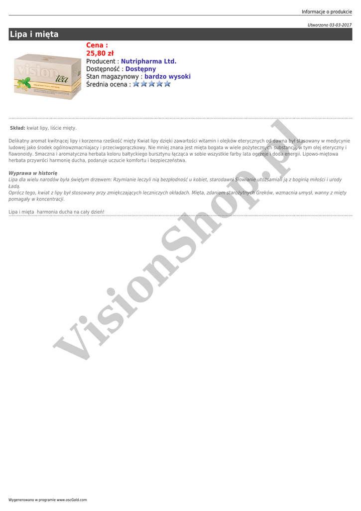 Informacje o produkcie Utworzono 03-03-2017 Lipa i mięta Cena : 25,80 zł Producent : Nutripharma Ltd. Dostępność : Dostępny Stan magazynowy : bardzo wysoki Średnia ocena : Skład: kwiat lipy, liście mięty. .p l Delikatny aromat kwitnącej lipy i korzenna rześkość mięty Kwiat lipy dzięki zawartości witamin i olejków eterycznych od dawna był stosowany w medycynie ludowej jako środek ogólnowzmacniajacy i przeciwgorączkowy. Nie mniej znana jest mięta bogata w wiele pożytecznych substancji, w tym olej eteryczny i flawonoidy. Smaczna i aromatyczna herbata koloru bałtyckiego bursztynu łącząca w sobie wszystkie farby lata ogrzeje i doda energii. Lipowo-miętowa herbata przywróci harmonię ducha, podaruje uczucie komfortu i bezpieczeństwa. Vi si on Sh Lipa i mięta harmonia ducha na cały dzień! op Wyprawa w historię Lipa dla wielu narodów była świętym drzewem: Rzymianie leczyli nią bezpłodność u kobiet, starodawni Słowianie utożsamiali ją z boginią miłości i urody Ładą. Oprócz tego, kwiat z lipy był stosowany przy zmiękczających leczniczych okładach. Mięta, zdaniem starożytnych Greków, wzmacnia umysł, wanny z mięty pomagały w koncentracji. Wygenerowano w programie www.oscGold.com