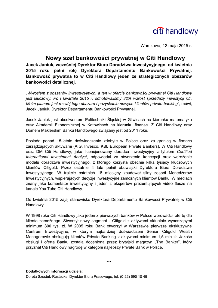 Warszawa, 12 maja 2015 r. Nowy szef bankowości prywatnej w Citi Handlowy Jacek Janiuk, wcześniej Dyrektor Biura Doradztwa Inwestycyjnego, od kwietnia 2015 roku pełni rolę Dyrektora Departamentu Bankowości Prywatnej. Bankowość prywatna to w Citi Handlowy jeden ze strategicznych obszarów bankowości detalicznej. „Wyrosłem z obszarów inwestycyjnych, a ten w ofercie bankowości prywatnej Citi Handlowy jest kluczowy. Po I kwartale 2015 r. odnotowaliśmy 32% wzrost sprzedaży inwestycji r./r. Moim planem jest rozwój tego obszaru i pozyskanie nowych klientów private banking”, mówi, Jacek Janiuk, Dyrektor Departamentu Bankowości Prywatnej. Jacek Janiuk jest absolwentem Politechniki Śląskiej w Gliwicach na kierunku matematyka oraz Akademii Ekonomicznej w Katowicach na kierunku finanse. Z Citi Handlowy oraz Domem Maklerskim Banku Handlowego związany jest od 2011 roku. Posiada ponad 15-letnie doświadczenie zdobyte w Polsce oraz za granicą w firmach zarządzających aktywami (AIG, Invesco, KBL European Private Bankers). W Citi Handlowy oraz DM Citi Handlowy, jako licencjonowany doradca inwestycyjny z tytułem Certified International Investment Analyst, odpowiadał za stworzenie koncepcji oraz wdrożenie modelu doradztwa inwestycyjnego, z którego korzysta obecnie kilka tysięcy kluczowych klientów Citigold. Przez ostatnie 4 lata pełnił obowiązki Dyrektora Biura Doradztwa Inwestycyjnego. W trakcie ostatnich 18 miesięcy zbudował silny zespół Menedżerów Inwestycyjnych, wspierających decyzje inwestycyjne zamożnych klientów Banku. W mediach znany jako komentator inwestycyjny i jeden z ekspertów prezentujących video flesze na kanale You Tube Citi Handlowy. Od kwietnia 2015 zajął stanowisko Dyrektora Departamentu Bankowości Prywatnej w Citi Handlowy. W 1998 roku Citi Handlowy jako jeden z pierwszych banków w Polsce wprowadził ofertę dla klienta zamożnego. Stworzył nowy segment - Citigold z aktywami aktualnie wynoszącymi minimum 300 tys. zł. W 2005 roku Bank otworzył w Warszawie pierwsze ekskluzywne Centrum Inwestycyjne, w którym najbardziej doświadczeni Senior Citigold Wealth Managerowie obsługują klientów Private Banking z aktywami minimum 1,5 mln zł. Jakość obsługi i oferta Banku została doceniona przez brytyjski magazyn „The Banker”, który przyznał Citi Handlowy nagrodę w kategorii najlepszy Private Bank w Polsce. *** Dodatkowych informacji udziela: Dorota Szostek-Rustecka, Dyrektor Biura Prasowego, tel. (0-22) 690 10 49 E-mail: [email protected] Marta Zalewska-Naser, Specjalista ds.kontaktów z mediami, tel. (0-22) 692 94 16 E-mail: [email protected] Marta Wiszniewska, Specjalista ds.kontaktów z mediami, tel. (0-22) 692 90 52 E-mail: [email protected] Bank Handlowy w Warszawie SA to jedna z największych instytucji finansowych w Polsce, oferująca pod marką Citi Handlowy bogaty i nowoczesny asortyment produktów i usług bankowości korporacyjnej, inwestycyjnej i detalicznej. Bank Handlowy obsługuje 7,4 tys. klientów korporacyjnych i ok. 760 tys. klientów indywidualnych poprzez nowoczesne kanały dystrybucji oraz sieć 60 oddziałów. W skład grupy kapitałowej Banku wchodzą takie podmioty jak: Dom Maklerski Banku Handlowego i Handlowy Leasing. Przynależność do Citigroup, największej na świecie instytucji finansowej, zapewnia klientom Banku Handlowego dostęp do usług finansowych w ponad 100 krajach. Citi (NYSE:C) to wiodąca globalna instytucja finansowa, mająca około 200 milionów klientów w ponad 140 krajach. Poprzez swoje dwie odrębne jednostki operacyjne: Citicorp i Citi Holdings, Citi obsługuje klientów indywidualnych, korporacyjnych, rządowych i instytucjonalnych zapewniając im bogaty wachlarz produktów i usług finansowych w zakresie bankowości detalicznej, bankowości korporacyjnej i inwestycyjnej, usług maklerskich i zarządzania aktywami. Dodatkowe informacje można uzyskać na stronie internetowej www.citigroup.com lub www.citi.com.