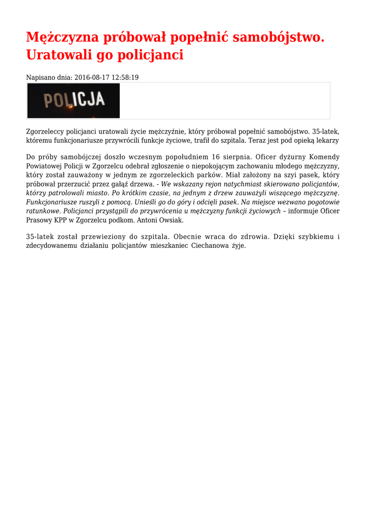 Mężczyzna próbował popełnić samobójstwo. Uratowali go policjanci Napisano dnia: 2016-08-17 12:58:19 Zgorzeleccy policjanci uratowali życie mężczyźnie, który próbował popełnić samobójstwo. 35-latek, któremu funkcjonariusze przywrócili funkcje życiowe, trafił do szpitala. Teraz jest pod opieką lekarzy Do próby samobójczej doszło wczesnym popołudniem 16 sierpnia. Oficer dyżurny Komendy Powiatowej Policji w Zgorzelcu odebrał zgłoszenie o niepokojącym zachowaniu młodego mężczyzny, który został zauważony w jednym ze zgorzeleckich parków. Miał założony na szyi pasek, który próbował przerzucić przez gałąź drzewa. - We wskazany rejon natychmiast skierowano policjantów, którzy patrolowali miasto. Po krótkim czasie, na jednym z drzew zauważyli wiszącego mężczyznę. Funkcjonariusze ruszyli z pomocą. Unieśli go do góry i odcięli pasek. Na miejsce wezwano pogotowie ratunkowe. Policjanci przystąpili do przywrócenia u mężczyzny funkcji życiowych – informuje Oficer Prasowy KPP w Zgorzelcu podkom. Antoni Owsiak. 35-latek został przewieziony do szpitala. Obecnie wraca do zdrowia. Dzięki szybkiemu i zdecydowanemu działaniu policjantów mieszkaniec Ciechanowa żyje.