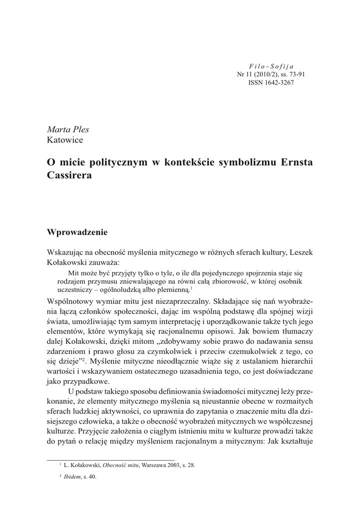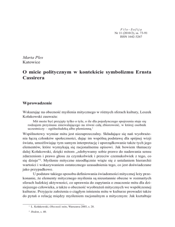 Filo–Sofija Nr 11 (2010/2), ss. 73-91 ISSN 1642-3267 Marta Ples Katowice O micie politycznym w kontekście symbolizmu Ernsta Cassirera Wprowadzenie Wskazując na obecność myślenia mitycznego w różnych sferach kultury, Leszek Kołakowski zauważa: Mit może być przyjęty tylko o tyle, o ile dla pojedynczego spojrzenia staje się rodzajem przymusu zniewalającego na równi całą zbiorowość, w której osobnik uczestniczy – ogólnoludzką albo plemienną.1 Wspólnotowy wymiar mitu jest niezaprzeczalny. Składające się nań wyobrażenia łączą członków społeczności, dając im wspólną podstawę dla spójnej wizji świata, umożliwiając tym samym interpretację i uporządkowanie także tych jego elementów, które wymykają się racjonalnemu opisowi. Jak bowiem tłumaczy dalej Kołakowski, dzięki mitom „zdobywamy sobie prawo do nadawania sensu zdarzeniom i prawo głosu za czymkolwiek i przeciw czemukolwiek z tego, co się dzieje”2. Myślenie mityczne nieodłącznie wiąże się z ustalaniem hierarchii wartości i wskazywaniem ostatecznego uzasadnienia tego, co jest doświadczane jako przypadkowe. U podstaw takiego sposobu definiowania świadomości mitycznej leży przekonanie, że elementy mitycznego myślenia są nieustannie obecne w rozmaitych sferach ludzkiej aktywności, co uprawnia do zapytania o znaczenie mitu dla dzisiejszego człowieka, a także o obecność wyobrażeń mitycznych we współczesnej kulturze. Przyjęcie założenia o ciągłym istnieniu mitu w kulturze prowadzi także do pytań o relację między myśleniem racjonalnym a mitycznym: Jak kształtuje 1 L. Kołakowski, Obecność mitu, Warszawa 2003, s. 28. 2 Ibidem, s. 40. 74 MARTA PLES się ta relacja? Czy jest ona obecna w całej ludzkiej działalności czy też tylko w jej wybranych obszarach? Czy można powiedzieć, że jeden z członów tej relacji jest głębiej zakorzeniony w kulturze, a jeśli tak – to który? Czy i jak wskazane elementy wzajemnie na siebie wpływają? Podobnych pytań można postawić znacznie więcej, co niestety nie prowadzi wprost do rozwiązania podstawowego problemu, pozwala jednak nakreślić wielość problematycznych kwestii związanych z pytaniem o myślenie mityczne i jego (nie)obecność w kulturze. Jednym z wielu współczesnych badaczy podejmujących tę problematykę był Ernst Cassirer (1874–1945). W jego twórczości można odnaleźć perspektywę podobną do tej przedstawionej przez Kołakowskiego, odnajdującego przejawy mitycznej wyobraźni w wielu aspektach kultury, także współczesnej. Cassirer, wywodzący się ze szkoły neokantyzmu marburskiego, rozpatruje mit w kontekście swojego projektu filozofii form symbolicznych – koncepcji badań kulturotwórczej świadomości inspirowanej Kantowską krytyką rozumu. Pytanie o mit jest dla niego pytaniem o funkcje mitotwórczego myślenia, które początkowo pojmuje jako rudymentarną formę świadomości, stanowiącą podłoże, na którym wykształciły się inne formy opisu rzeczywistości, by w późniejszym okresie swojej twórczości uznać, że poszczególne formy kultury – w tym myślenie mityczne – współistnieją, tworząc strukturę ludzkiego świata.3 Ta druga perspektywa przenika ostatnią książkę napisaną przez Ernsta Cassirera – Mit państwa4. Zawarte w niej rozważania wypływają w dużej mierze z emocjonalnego zaangażowania samego Cassirera i muszą być rozpatrywane w świetle wydarzeń lat 30. i 40. XX w. Rozgoryczenie niemieckiego filozofa przejawia się m.in. w ujęciu mitu jako mrocznej siły, ukrytej pod racjonalnym aspektem ludzkiego życia, zawsze gotowej, by wyjść na powierzchnię: We wszystkich krytycznych momentach społecznego życia człowieka siły racjonalne, opierające się presji dawnych koncepcji mitycznych tracą swoją pewność siebie. W tych chwilach powraca na nowo epoka mitu. Mit bowiem nie został naprawdę pokonany i opanowany. Trwa, stale obecny, kryjąc się w mrokach, czekając swojej godziny i odpowiedniej okazji, przyczajony w cieniu.5 Tak pojęty mit, będąc nieredukowalnym elementem kultury, jest jednocześnie stale w niej obecnym zagrożeniem dla człowieczeństwa. Uproszczeniem byłoby jednak stwierdzenie, że do tej konkluzji sprowadzają się rozważania przeprowadzone na stronach Mitu państwa. Korzystając z wcześniej wypracowanych przez siebie interpretacji myślenia mitycznego, niemiecki filozof przeprowadza błyskotliwe rozważania, w których analizuje znaczenie i specyfikę mitu w teorii polityki i życiu politycznym na przestrzeni dziejów, poczynając od źródeł racjonalnej teorii państwa w filozofii presokratejskiej, na nowoczesnych, 3 Por.: M. Bal-Nowak, Mit jako forma symboliczna w ujęciu Ernsta Cassirera, Kraków 1996, s. 63. 4 E. Cassirer, Mit państwa, przeł. A. Staniewska, IFiS PAN, Warszawa 2006. 5 Ibidem, s. 310. 75 O MICIE POLITYCZNYM W KONTEKŚCIE SYMBOLIZMU ERNSTA CASSIRERA dwudziestowiecznych mitach politycznych kończąc. Te rozważania będą istotnym punktem odniesienia dla niniejszego artykułu, którego celem jest podjęcie próby rekonstrukcji Cassirerowskiej koncepcji świadomości mitycznej jako elementu myśli politycznej. Zagadnienie to należy przedstawić na tle szerszego kontekstu, jakim jest Cassirerowska filozofia kultury, wskazując także na istotne dla niej inspiracje filozoficzne, które wpłynęły na teorię mitu sformułowaną przez niemieckiego myśliciela. Tytuł wspomnianej książki Cassirera nasuwa pytanie o miejsce i znaczenie racjonalnej refleksji w myśleniu człowieka o państwie – o jego fundamentach, funkcjach, znaczeniu dla jednostki i rozmaitych wspólnot, o wartościach, które powinny wyznaczać kierunki działań wszystkich, składających się na nie instytucji. Tytułowe sformułowanie – „mit państwa” – sugeruje, że przyjęto perspektywę akcentującą w tej dziedzinie aktywność – a może nawet dominację – sił innych niż racjonalne. Wszak mi