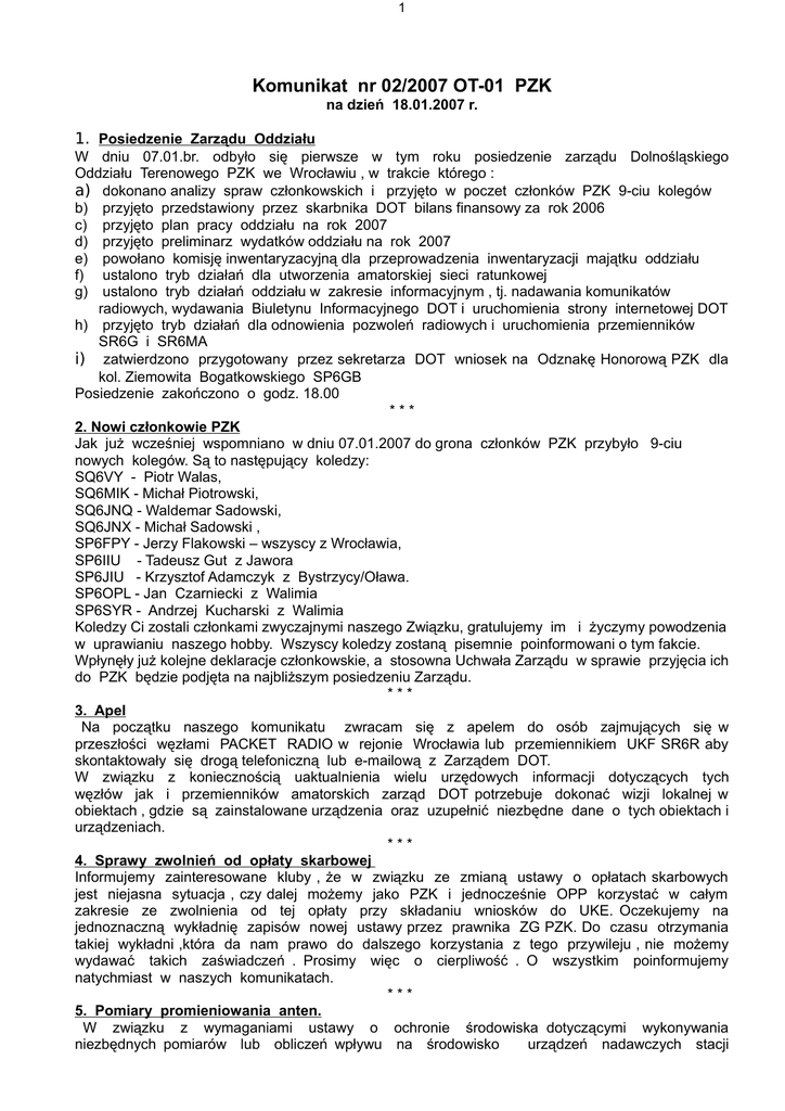 1 Komunikat nr 02/2007 OT-01 PZK na dzień 18.01.2007 r. 1. Posiedzenie Zarządu Oddziału W dniu 07.01.br. odbyło się pierwsze w tym roku posiedzenie zarządu Dolnośląskiego Oddziału Terenowego PZK we Wrocławiu , w trakcie którego : a) dokonano analizy spraw członkowskich i przyjęto w poczet członków PZK 9-ciu kolegów b) przyjęto przedstawiony przez skarbnika DOT bilans finansowy za rok 2006 c) przyjęto plan pracy oddziału na rok 2007 d) przyjęto preliminarz wydatków oddziału na rok 2007 e) powołano komisję inwentaryzacyjną dla przeprowadzenia inwentaryzacji majątku oddziału f) ustalono tryb działań dla utworzenia amatorskiej sieci ratunkowej g) ustalono tryb działań oddziału w zakresie informacyjnym , tj. nadawania komunikatów radiowych, wydawania Biuletynu Informacyjnego DOT i uruchomienia strony internetowej DOT h) przyjęto tryb działań dla odnowienia pozwoleń radiowych i uruchomienia przemienników SR6G i SR6MA i) zatwierdzono przygotowany przez sekretarza DOT wniosek na Odznakę Honorową PZK dla kol. Ziemowita Bogatkowskiego SP6GB Posiedzenie zakończono o godz. 18.00 *** 2. Nowi członkowie PZK Jak już wcześniej wspomniano w dniu 07.01.2007 do grona członków PZK przybyło 9-ciu nowych kolegów. Są to następujący koledzy: SQ6VY - Piotr Walas, SQ6MIK - Michał Piotrowski, SQ6JNQ - Waldemar Sadowski, SQ6JNX - Michał Sadowski , SP6FPY - Jerzy Flakowski – wszyscy z Wrocławia, SP6IIU - Tadeusz Gut z Jawora SP6JIU - Krzysztof Adamczyk z Bystrzycy/Oława. SP6OPL - Jan Czarniecki z Walimia SP6SYR - Andrzej Kucharski z Walimia Koledzy Ci zostali członkami zwyczajnymi naszego Związku, gratulujemy im i życzymy powodzenia w uprawianiu naszego hobby. Wszyscy koledzy zostaną pisemnie poinformowani o tym fakcie. Wpłynęły już kolejne deklaracje członkowskie, a stosowna Uchwała Zarządu w sprawie przyjęcia ich do PZK będzie podjęta na najbliższym posiedzeniu Zarządu. *** 3. Apel Na początku naszego komunikatu zwracam się z apelem do osób zajmujących się w przeszłości węzłami PACKET RADIO w rejonie Wrocławia lub przemiennikiem UKF SR6R aby skontaktowały się drogą telefoniczną lub e-mailową z Zarządem DOT. W związku z koniecznością uaktualnienia wielu urzędowych informacji dotyczących tych węzłów jak i przemienników amatorskich zarząd DOT potrzebuje dokonać wizji lokalnej w obiektach , gdzie są zainstalowane urządzenia oraz uzupełnić niezbędne dane o tych obiektach i urządzeniach. *** 4. Sprawy zwolnień od opłaty skarbowej Informujemy zainteresowane kluby , że w związku ze zmianą ustawy o opłatach skarbowych jest niejasna sytuacja , czy dalej możemy jako PZK i jednocześnie OPP korzystać w całym zakresie ze zwolnienia od tej opłaty przy składaniu wniosków do UKE. Oczekujemy na jednoznaczną wykładnię zapisów nowej ustawy przez prawnika ZG PZK. Do czasu otrzymania takiej wykładni ,która da nam prawo do dalszego korzystania z tego przywileju , nie możemy wydawać takich zaświadczeń . Prosimy więc o cierpliwość . O wszystkim poinformujemy natychmiast w naszych komunikatach. *** 5. Pomiary promieniowania anten. W związku z wymaganiami ustawy o ochronie środowiska dotyczącymi wykonywania niezbędnych pomiarów lub obliczeń wpływu na środowisko urządzeń nadawczych stacji 2 amatorskich zarząd DOT tworzy zespół konsultantów służących pomocą przy sporządzaniu dokumentów wymaganych obowiązującymi przepisami ustawy o ochronie środowiska . Prosimy wszystkich chętnych kolegów posiadających odpowiednią wiedzę z tego zakresu ,aby skontaktowali się z zarządem DOT w celu włączenia się do tego zespołu. Będzie on miał zadanie udzielenia pomocy innym kolegom w wypełnieniu obowiązku wynikającego ze wspomnianej Ustawy , wszak jako krótkofalowcy jesteśmy ludźmi o różnych zawodach i nie każdy będzie mógł samodzielnie sprostać nowym wymaganiom. *** 6. Kurs przygotowawczy W najbliższym czasie Zarząd DOT wspólnie z klubem SP6PRT zamierza zorganizować kurs przygotowujący do egzaminu na świadectwo operatora w służbie radiokomunikacyjnej amatorskiej .Termin rozpoczęcia kursu wstępnie ustalono na początek marca . Ostateczny termin będzie podany po załatwieniu sprawy egzaminu. Obecnie oczekujemy na informacje z UKE. Chętni do udziału w tym kursie mogą już zgłaszać się do zarządu oddziału. Więcej informacji na ten temat podamy w następnym komunikacie za dwa tygodnie. *** 7. Sprawy klubowe W prowadzonej przez oddział ewidencji Terenowych Klubów PZK jest aktualnie wpisanych 21 klubów krótkofalowców z terenu Dolnego Śląska . Ewidencja ta jest na bieżąco uzupełniana na podstawie dostarczanych nam przez kluby wypełnionych formularzy INFORMACJA O KLUBIE PZK. Kluby Krótkofalowców działające na terenie Dolnego Śląska i zainteresowane „członkostwem” w PZK prosimy o zgłaszanie się do ewidencji prowadzonej przez oddział. Potrzebne formularze możemy dostarczyć pocztą zwykła lub elektroniczną. Prosimy o kontakt w tej sprawie z członkami Zarządu DOT. Kluby wpisane do rejestru PZK mogą korzystać z wszystkich praw przysługującym klubom terenowym PZK i otrzymywać teksty komunikatów radiowych oraz inne informacje za pośrednictwem internetu , oczywiście po podaniu swego adresu e-mailowego . Kluby zainteresowane wsparciem finansowym oddziału przy realizacji swoich działań technicznych proszone są o składanie wniosków pisemnych podając rodzaj działalności wymagającej dofinansowania i przybliżony koszt realizacji całego zadania. Po zebraniu wniosków zarząd podejmie decyzje stosowne do możliwości finansowych oddziału. Wnioski należy składać w nieprzekraczalnym terminie do końca lutego br. Do klubów też kierujemy nasze zapytanie , czy byłyby zainteresowane otrzymaniem urządzeń z demobilu pracujących w paśmie 150 MHz , a konkretnie radiotelefonów RADMOR FM 315 , FM 3001, FM 3206. Zarząd jest w stanie uzys