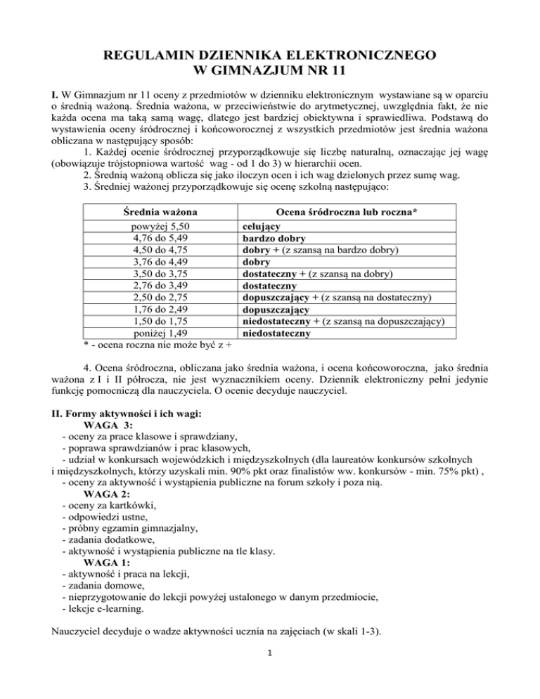 REGULAMIN DZIENNIKA ELEKTRONICZNEGO W GIMNAZJUM NR 11 I. W Gimnazjum nr 11 oceny z przedmiotów w dzienniku elektronicznym wystawiane są w oparciu o średnią ważoną. Średnia ważona, w przeciwieństwie do arytmetycznej, uwzględnia fakt, że nie każda ocena ma taką samą wagę, dlatego jest bardziej obiektywna i sprawiedliwa. Podstawą do wystawienia oceny śródrocznej i końcoworocznej z wszystkich przedmiotów jest średnia ważona obliczana w następujący sposób: 1. Każdej ocenie śródrocznej przyporządkowuje się liczbę naturalną, oznaczając jej wagę (obowiązuje trójstopniowa wartość wag - od 1 do 3) w hierarchii ocen. 2. Średnią ważoną oblicza się jako iloczyn ocen i ich wag dzielonych przez sumę wag. 3. Średniej ważonej przyporządkowuje się ocenę szkolną następująco: Średnia ważona powyżej 5,50 4,76 do 5,49 4,50 do 4,75 3,76 do 4,49 3,50 do 3,75 2,76 do 3,49 2,50 do 2,75 1,76 do 2,49 1,50 do 1,75 poniżej 1,49 * - ocena roczna nie może być z + Ocena śródroczna lub roczna* celujący bardzo dobry dobry + (z szansą na bardzo dobry) dobry dostateczny + (z szansą na dobry) dostateczny dopuszczający + (z szansą na dostateczny) dopuszczający niedostateczny + (z szansą na dopuszczający) niedostateczny 4. Ocena śródroczna, obliczana jako średnia ważona, i ocena końcoworoczna, jako średnia ważona z I i II półrocza, nie jest wyznacznikiem oceny. Dziennik elektroniczny pełni jedynie funkcję pomocniczą dla nauczyciela. O ocenie decyduje nauczyciel. II. Formy aktywności i ich wagi: WAGA 3: - oceny za prace klasowe i sprawdziany, - poprawa sprawdzianów i prac klasowych, - udział w konkursach wojewódzkich i międzyszkolnych (dla laureatów konkursów szkolnych i międzyszkolnych, którzy uzyskali min. 90% pkt oraz finalistów ww. konkursów - min. 75% pkt) , - oceny za aktywność i wystąpienia publiczne na forum szkoły i poza nią. WAGA 2: - oceny za kartkówki, - odpowiedzi ustne, - próbny egzamin gimnazjalny, - zadania dodatkowe, - aktywność i wystąpienia publiczne na tle klasy. WAGA 1: - aktywność i praca na lekcji, - zadania domowe, - nieprzygotowanie do lekcji powyżej ustalonego w danym przedmiocie, - lekcje e-learning. Nauczyciel decyduje o wadze aktywności ucznia na zajęciach (w skali 1-3). 1 W dzienniku elektronicznym stosujemy następującą kolorystykę zapisu ocen według ich wagi: 3 - czerwony, 2 – zielony, 1 - niebieski. Skróty stosowane w dzienniku elektronicznym określające formy aktywności uczniów: S - sprawdzian, PS - poprawa sprawdzianu, PK - praca klasowa, KW - konkurs wojewódzki, KM - konkurs międzyszkolny, K - kartkówka, O - odpowiedź, EG - egzamin gimnazjalny próbny, ZD - zadanie dodatkowe, A - aktywność, PL - praca na lekcji, PD - praca domowa, EL - e-learning, NP - nieprzygotowanie. III. Szczegółowy podział form aktywności, dostosowany do specyfiki przedmiotu, został opracowany przez nauczycieli poszczególnych przedmiotów i znajduje się w wymaganiach i kryteriach oceniania w teczkach przedmiotowych. IV. Podstawą do wystawienia oceny końcoworocznej ze wszystkich przedmiotów jest średnia arytmetyczna, obliczana na podstawie ocen semestralnych uzyskanych przez ucznia w II półroczu oraz oceny za I półrocze. Ostateczna decyzja w tej kwestii należy do nauczyciela. Dopuszcza się uwzględnienie indywidualnej pracy ucznia (widocznej poprawy wyników, dopuszcza się też możliwość podniesienia oceny o maksymalnie 2 stopnie). V. Jeżeli uczeń opuścił obowiązkową pracę klasową, sprawdzian, test, kartkówkę (nieobecność usprawiedliwiona), to powinien napisać ją w wyznaczonym przez nauczyciela terminie. Nieobecność odnotowana jest jako „nb” w tej kategorii w dniu pisania pracy pisemnej. „nb” nie jest oceną, a jedynie informacją dla nauczyciela i rodzica o nieobecności ucznia na sprawdzianie. Po napisaniu przez ucznia zaległej pracy w miejscu „nb” nauczyciel wpisuje otrzymaną ocenę. Jeżeli uczeń z przyczyn losowych nie może pisać sprawdzianu z całą klasą, powinien to uczynić w terminie tygodnia po przyjściu do szkoły. Jeżeli uczeń nie napisze sprawdzianu w tym terminie, otrzymuje ocenę niedostateczną. VI. Uczeń może poprawiać ocenę z prac pisemnych (poprawa oceny niedostatecznej jest obowiązkowa) w wyznaczonym przez nauczyciela terminie. Ocena z poprawy jest sumowana z oceną z pracy pisemnej uzyskaną w pierwszym terminie, oblicza się wówczas średnią arytmetyczną. 2