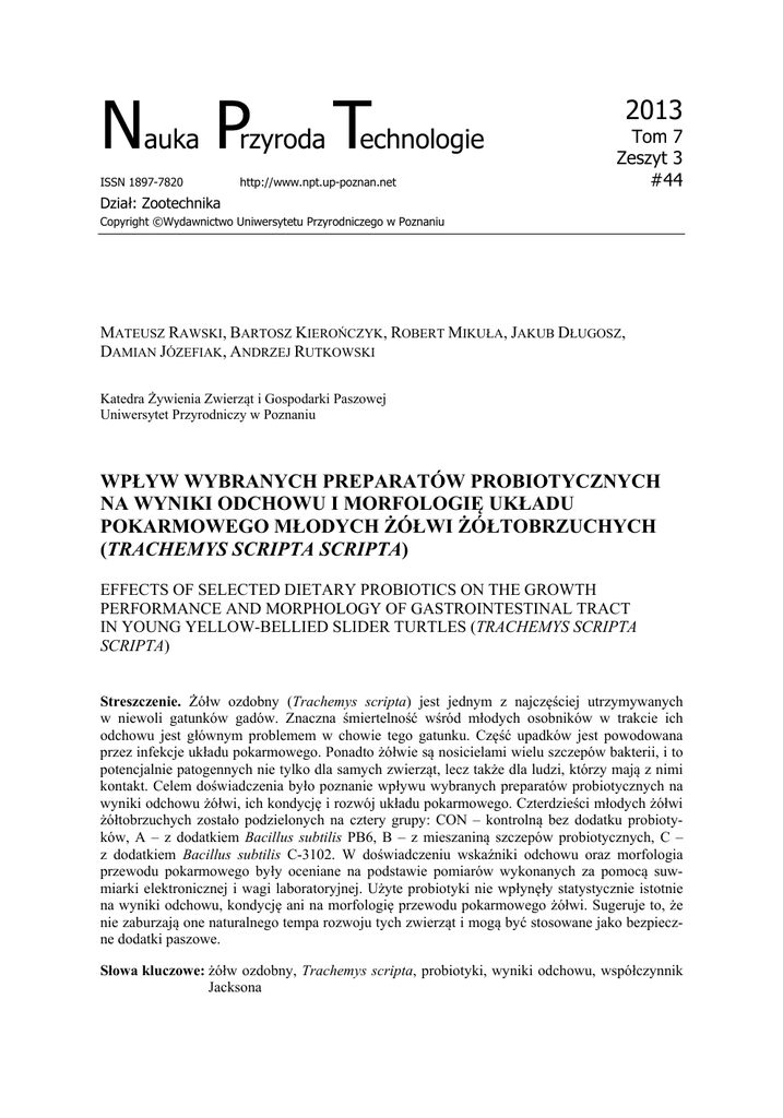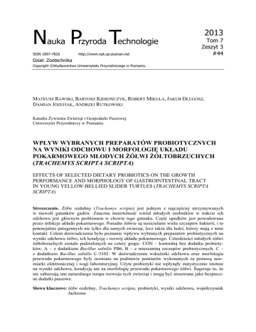 Nauka Przyroda Technologie ISSN 1897-7820 http://www.npt.up-poznan.net 2013 Tom 7 Zeszyt 3 #44 Dział: Zootechnika Copyright ©Wydawnictwo Uniwersytetu Przyrodniczego w Poznaniu MATEUSZ RAWSKI, BARTOSZ KIEROŃCZYK, ROBERT MIKUŁA, JAKUB DŁUGOSZ, DAMIAN JÓZEFIAK, ANDRZEJ RUTKOWSKI Katedra Żywienia Zwierząt i Gospodarki Paszowej Uniwersytet Przyrodniczy w Poznaniu WPŁYW WYBRANYCH PREPARATÓW PROBIOTYCZNYCH NA WYNIKI ODCHOWU I MORFOLOGIĘ UKŁADU POKARMOWEGO MŁODYCH ŻÓŁWI ŻÓŁTOBRZUCHYCH (TRACHEMYS SCRIPTA SCRIPTA) EFFECTS OF SELECTED DIETARY PROBIOTICS ON THE GROWTH PERFORMANCE AND MORPHOLOGY OF GASTROINTESTINAL TRACT IN YOUNG YELLOW-BELLIED SLIDER TURTLES (TRACHEMYS SCRIPTA SCRIPTA) Streszczenie. Żółw ozdobny (Trachemys scripta) jest jednym z najczęściej utrzymywanych w niewoli gatunków gadów. Znaczna śmiertelność wśród młodych osobników w trakcie ich odchowu jest głównym problemem w chowie tego gatunku. Część upadków jest powodowana przez infekcje układu pokarmowego. Ponadto żółwie są nosicielami wielu szczepów bakterii, i to potencjalnie patogennych nie tylko dla samych zwierząt, lecz także dla ludzi, którzy mają z nimi kontakt. Celem doświadczenia było poznanie wpływu wybranych preparatów probiotycznych na wyniki odchowu żółwi, ich kondycję i rozwój układu pokarmowego. Czterdzieści młodych żółwi żółtobrzuchych zostało podzielonych na cztery grupy: CON – kontrolną bez dodatku probiotyków, A – z dodatkiem Bacillus subtilis PB6, B – z mieszaniną szczepów probiotycznych, C – z dodatkiem Bacillus subtilis C-3102. W doświadczeniu wskaźniki odchowu oraz morfologia przewodu pokarmowego były oceniane na podstawie pomiarów wykonanych za pomocą suwmiarki elektronicznej i wagi laboratoryjnej. Użyte probiotyki nie wpłynęły statystycznie istotnie na wyniki odchowu, kondycję ani na morfologię przewodu pokarmowego żółwi. Sugeruje to, że nie zaburzają one naturalnego tempa rozwoju tych zwierząt i mogą być stosowane jako bezpieczne dodatki paszowe. Słowa kluczowe: żółw ozdobny, Trachemys scripta, probiotyki, wyniki odchowu, współczynnik Jacksona 2 Rawski M., Kierończyk B., Mikuła R., Długosz J., Józefiak D., Rutkowski A., 2013. Wpływ wybranych preparatów probiotycznych na wyniki odchowu i morfologię układu pokarmowego młodych żółwi żółtobrzuchych (Trachemys scripta scripta). Nauka Przyr. Technol. 7, 3, #44. Wstęp Żółw ozdobny (Trachemys scripta) jest prawdopodobnie najpowszechniej na świecie występującym gatunkiem gada, do czego przyczyniła się olbrzymia skala jego utrzymania w niewoli (SILVA i IN. 2010). Mimo to wciąż notuje się znaczną śmiertelność osobników młodych. Część z tych upadków jest wynikiem infekcji układu pokarmowego (WEESE i STAEMPFLI 2000, GABRICH i ZWART 2009). Ponadto kontakt z gadami może stanowić zagrożenie zdrowotne dla ludzi. Ocenia się, że w Polsce około 40% żółwi ozdobnych (T. scripta) i niemalże 19% żółwi stepowych (Agrionemys horsfieldi) jest zakażonych bakteriami z rodzaju Salmonella (ZAJĄCZKOWSKI 2001, NOWAKIEWICZ i IN. 2012). Zdaniem HARRISA i IN. (2010) gady są najczęściej bezobjawowymi nosicielami wymienionego patogenu, dlatego też mogą stanowić zagrożenie zdrowotne dla ludzi, szczególnie dzieci. Dodatkowo patogen ten może być przyczyną nie tylko szeroko opisywanych infekcji zoonotycznych (HARRIS i IN. 2010, INVESTIGATION... 2010), lecz także powodować bakteryjne zapalenie jelit u żółwi (KEYMER i IN. 1968, ZWART 1970). U żółwi czerwonolicych (T. s. elegans) utrzymywanych w Polsce, odnotowano obecność Escherichia coli serotyp O:157:H7 (RAWSKI i IN. 2012), który jest uznawany za przyczynę około 70 tysięcy zachorowań rocznie na terenie USA (MEAD i IN. 1999). W chowie i hodowli zwierząt coraz większą uwagę przykłada się do homeostazy mikroflory przewodu pokarmowego. Uważa się, że wraz z prawidłowo funkcjonującą florą bakteryjną przewód pokarmowy może być uznany za „największy organ immunologiczny organizmu”. Za znaczący uznaje się fakt korzystnego oddziaływania szczepów probiotycznych w procesie kształtowania jego homeostazy (KRAEHENBUHL i NEUTRA, 1992). Probiotyki są definiowane jako drobnoustroje, które podawane w odpowiednich ilościach mogą wywierać korzystny efekt prozdrowotny (FULLER 1991, GUIDELINES... 2002). Kultury probiotyczne są stosowane w żywieniu wielu gatunków zwierząt gospodarskich i amatorskich, jako czynniki stymulujące wzrost, zmniejszające śmiertelność, a także mające pozytywne oddziaływanie na budowę histologiczną układu pokarmowego (ŚLIŻEWSKA i IN. 2006). W dostępnej literaturze brakuje jednak informacji na temat efektów podawania probiotyków na wzrost i rozwój żółwi. Celem doświadczenia było określenie wpływu wybranych preparatów probiotycznych podawanych per os na wyniki odchowu i morfologię układu pokarmowego żółwi żółtobrzuchych (T. s. scripta). Materiał i metody Czterdzieści młodych żółwi żółtobrzuchych podzielono losowo na cztery grupy po 10 osobników traktowanych jako indywidualne powtórzenia. Wykorzystano zwierzęta w wieku około 25 tygodni, nie wykazujące dymorfizmu płciowego. Dieta grupy kontrolnej (CON) nie zawierała dodatku probiotyków. W pozostałych grupach zastosowano dodatek preparatów probiotycznych do paszy. Grupa A otrzymywała Bacillus subtilis PB6 (2·109 w 1 g). Zwierzętom z grupy B podawano mieszaninę probiotyków (Lactobacillus plantarum – 1,26·107, L. delbruecki subsp. bulgaricus – 2,06·107, L. acidophi- 3 Rawski M., Kierończyk B., Mikuła R., Długosz J., Józefiak D., Rutkowski A., 2013. Wpływ wybranych preparatów probiotycznych na wyniki odchowu i morfologię układu pokarmowego młodych żółwi żółtobrzuchych (Trachemys scripta scripta). Nauka Przyr. Technol. 7, 3, #44. lus – 2,06·107, L. rhamnosus – 2,06·107, Bifidobacterium bifidum – 2,00·107, S