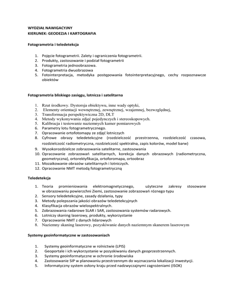 WYDZIAŁ NAWIGACYJNY KIERUNEK: GEODEZJA I KARTOGRAFIA Fotogrametria i teledetekcja 1. 2. 3. 4. 5. Pojęcie fotogrametrii. Zalety i ograniczenia fotogrametrii. Produkty, zastosowanie i podział fotogrametrii Fotogrametria jednoobrazowa. Fotogrametria dwuobrazowa Fotointerpretacja, metodyka postępowania fotointerpretacyjnego, cechy rozpoznawcze obiektów Fotogrametria bliskiego zasięgu, lotnicza i satelitarna 1. 2. 3. 4. 5. 6. 7. 8. 9. 10. 11. 12. Rzut środkowy. Dystorsja obiektywu, inne wady optyki, Elementy orientacji wewnętrznej, zewnętrznej, wzajemnej, bezwzględnej, Transformacja perspektywiczna 2D, DLT Metody wykonywania zdjęć pojedynczych i stereoskopowych. Kalibracja i testowanie naziemnych kamer pomiarowych Parametry lotu fotogrametrycznego. Opracowanie ortofotomapy ze zdjęć lotniczych Cyfrowe obrazy teledetekcyjne (rozdzielczość przestrzenna, rozdzielczość czasowa, rozdzielczość radiometryczna, rozdzielczość spektralna, zapis kolorów, model barw) Wysokorozdzielcze zobrazowania satelitarne, zastosowania Opracowanie zobrazowań satelitarnych, korekcja danych obrazowych (radiometryczna, geometryczna), ortorektyfikacja, ortoforomapa, ortoobraz Mozaikowanie obrazów satelitarnych i lotniczych. Opracowanie NMT metodą fotogrametryczną Teledetekcja 1. Teoria promieniowania elektromagnetycznego, użyteczne zakresy stosowane w obrazowaniu powierzchni Ziemi, zastosowanie zobrazowań róznego typu 2. Sensory teledetekcyjne, zasady działania, typy 3. Metody polepszania jakości obrazów teledetekcyjnych 4. Klasyfikacja obrazów wielospektralnych. 5. Zobrazowania radarowe SLAR i SAR, zastosowania systemów radarowych. 6. Lotniczy skaning laserowy, produkty, wykorzystanie 7. Opracowanie NMT z danych lidarowych 8. Naziemny skaning laserowy, pozyskiwanie danych naziemnym skanerem laserowym Systemy geoinformatyczne w zastosowaniach 1. 2. 3. 4. 5. Systemy geoinformatyczne w rolnictwie (LPIS) Geoportale i ich wykorzystanie w pozyskiwaniu danych geoprzestrzennych. Systemy geoinformatyczne w ochronie środowiska Zastosowanie SIP w planowaniu przestrzennym do wyznaczania lokalizacji inwestycji. Informatyczny system osłony kraju przed nadzwyczajnymi zagrożeniami (ISOK) Geowizualizacja 1. 2. 3. 4. 5. 6. Zasady/etapy redakcji map tematycznych, makieta mapy Hipermapa Metody wizualizacji NMT CityGML, obszar zastosowań, poziomy szczegółowości, wymagania dokładnościowe Zastosowanie serwisów GIS do wizualizacji danych geograficznych. Zmienne graficzne, barwy w kartografii Modelowanie geodanych 1. Podstawowe modele danych przestrzennych, modele proste, modele złożone, Obiekty wieloczęściowe, dane o charakterze ciągłym, dyskretnym 2. Geobaza, funkcjonalność geobazy, typy geobaz, podstawowa i rozszerzona struktura geobazy, topologia, budowa geobazy danych, rozdzielczość , domeny, podtypy, relacje, SQL 3. Modele siatki kwadratów, modele nieregularnej siatki trójkątów, ocena metod pod kątem optymalizacji parametrów, ocena metod na podstawie rozkładu przestrzennego danych, interpolacja przestrzenna, wykorzystanie metod interpolacyjnych z odniesieniu do gęstości danych 4. Generalizacja danych, typy generalizacji (ilościowa, jakościowa), wady generalizacji, algorytmy punktów sąsiednich, algorytm Langa, algorytm Reumanna – Witkama, algorytm Douglasa-Peuckera, wygładzanie a generalizacja 5. Metody konwersji danych wektorowych/rastrowych Systemy informacji geograficznej 1. Wdrażanie i zarządzanie projektem SIG ( struktura SIG, strategia wdrożenia SIG, analiza, projekt, implementacja, analiza SWOT, etapy i fazy projektowania i wdrażania, podstawy PRINCE2 i studium wykonalności) 2. Metody pozyskiwania danych dla SIG 3. Etapy projektowania geobazy danych w SIG 4. Porównanie modelu rastrowego i wektorowego. 5. Analizy przestrzenne na danych wektorowych i rastrowych. Podstawy hydrografii: 1. Echosondy hydrograficzne - rodzaje, zasada działania, różnice. 2. Sonary - klasyfikacja, przeznaczenie, podstawowe różnice oraz zalety i wady poszczególnych rozwiązań. 3. Kalibracja echosondy wielowiązkowej. 4. Zasady planowania profili w pomiarach batymetrycznych. 5. Sonarowe przeszukania dna - 100%, 200% i 400% pokryciem Systemy informacji przestrzennej: 1. Model wektorowy prosty, topologiczny i model rastrowy. 2. Etapy projektowania systemów GIS. 3. Triangulacja w budowie DTM. 4. Metody budowy siatki kwadratów. 5. Metody redukcji siatki kwadratów, siatki trójkątów i redukcji danych pomiarowych. Podstawy geoinformacji: 1. Dane przestrzenne, infrastruktura informacji przestrzennej, interoperacyjność. 2. Komponenty jakości danych. 3. Definicja, przeznaczenie i funkcje metadanych. 4. Źródła błędów danych geograficznych. 5. Metody pozyskiwania geodanych Metody analiz przestrzennych: 1. Analizy przestrzenne: definicja, podział, przegląd analiz stosowanych w geoinformatyce. 2. Algorytmy optymalnych ścieżek. 3. Sztuczne sieci neuronowe w budowie DTM. 4. Filtrowanie przestrzenne. 5. Metody eksploracji danych. Zarządzanie systemami geoinformatycznymi: 1. Wstępna i szczegółowa specyfikacja systemu geoinformatycznego. 2. Rola i elementy studium wykonalności projektu geoinformatycznego. 3. Cechy oprogramowania geoinformatycznego, metody i etapy tworzenia oprogramowania. 4. Pryncypia metodyki PRINCE2. 5. Tematy metodyki PRINCE2. Hydrograficzne przyrządy i systemy pomiarowe: 1. Systemy i techniki inne niż hydroakustyczne w pozyskiwaniu danych batymetrycznych. 2. Rozróżnialność i zniekształcenia geometryczne obrazu sonaru bocznego. 3. AUV - definicja, podział, koncepcja działania, zastosowania. 4. ROV - definicja, podział, zastosowania. 5. Magnetometr – podział, zasada działania, gradiometr, zastosowania. Pomiary hydrograficzne: 1. Standaryzacja w pracach hydrograficznych. 2. Sprawozdanie z pomiarów batymetrycznych i z sonarowych. 3. System profili pomiarowych i jego elementy. 4. Pomiary uzupełniające wykonane za pomocą ROV. 5. Gromadzenie 
