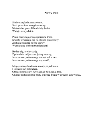 Nowy świt Słońce zagląda przez okno, Świt przeciera zamglone oczy; Nieśmiało, powoli budzi się świat. Wstaje nowy dzień. Ptaki zaczynają swoje poranne trele, Kwiaty otwierają się na słońca pieszczoty; Znikają ostatnie nocne zjawy, Wymiatane słońca promieniami. Budzę się, a więc żyję. Życie dało mi jeszcze jedną szansę; Jeszcze wszystko mogę zacząć od nowa, Jeszcze wszystko mogę naprawić; Mogę zacząć budować mosty pojednania, I jeszcze raz pokochać. Otrzeć komuś łzy, wyciągnąć pomocną dłoń, Okazać miłosierdzie bratu i ujrzeć Boga w drugim człowieku.