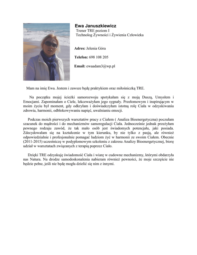 Ewa Januszkiewicz Trener TRE poziom I Technolog Żywności i Żywienia Człowieka Adres: Jelenia Góra Telefon: 698 108 205 Email: [email protected] Mam na imię Ewa. Jestem i zawsze będę praktykiem oraz miłośniczką TRE. Na początku mojej ścieżki samorozwoju spotykałam się z moją Duszą, Umysłem i Emocjami. Zapominałam o Ciele, lekceważyłam jego sygnały. Przełomowym i inspirującym w moim życiu był moment, gdy odkryłam i doświadczyłam istotną rolę Ciała w odzyskiwaniu zdrowia, harmonii, odblokowywaniu napięć, uwalnianiu emocji. Podczas moich pierwszych warsztatów pracy z Ciałem ( Analiza Bioenergetyczna) poczułam szacunek do mądrości i do mechanizmów samoregulacji Ciała. Jednocześnie jednak przeżyłam pewnego rodzaju zawód, że tak mało osób jest świadomych potencjału, jaki posiada. Zdecydowałam się na kształcenie w tym kierunku, by nie tylko z pasją, ale również odpowiedzialnie i profesjonalnie pomagać ludziom żyć w harmonii ze swoim Ciałem. Obecnie (2011-2015) uczestniczę w podyplomowym szkoleniu z zakresu Analizy Bioenergetycznej, biorę udział w warsztatach związanych z terapią poprzez Ciało. Dzięki TRE odzyskuję świadomość Ciała i wiarę w cudowne mechanizmy, którymi obdarzyła nas Natura. Na drodze samodoskonalenia nabieram również pewności, że moje szczęście nie będzie pełne, jeśli nie będę mogła dzielić się nim z innymi.