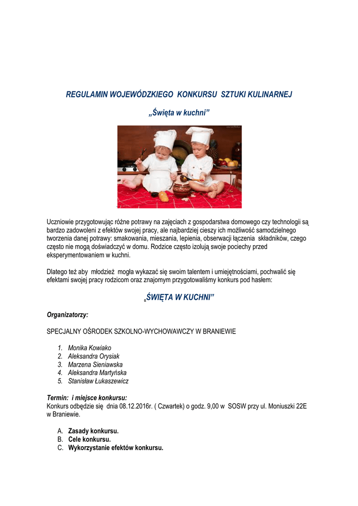 REGULAMIN WOJEWÓDZKIEGO KONKURSU SZTUKI KULINARNEJ „Święta w kuchni” - Uczniowie przygotowując różne potrawy na zajęciach z gospodarstwa domowego czy technologii są bardzo zadowoleni z efektów swojej pracy, ale najbardziej cieszy ich możliwość samodzielnego tworzenia danej potrawy: smakowania, mieszania, lepienia, obserwacji łączenia składników, czego często nie mogą doświadczyć w domu. Rodzice często izolują swoje pociechy przed eksperymentowaniem w kuchni. Dlatego też aby młodzież mogła wykazać się swoim talentem i umiejętnościami, pochwalić się efektami swojej pracy rodzicom oraz znajomym przygotowaliśmy konkurs pod hasłem: „ŚWIĘTA W KUCHNI” Organizatorzy: SPECJALNY OŚRODEK SZKOLNO-WYCHOWAWCZY W BRANIEWIE 1. 2. 3. 4. 5. Monika Kowiako Aleksandra Orysiak Marzena Sieniawska Aleksandra Martyńska Stanisław Łukaszewicz Termin: i miejsce konkursu: Konkurs odbędzie się dnia 08.12.2016r. ( Czwartek) o godz. 9,00 w SOSW przy ul. Moniuszki 22E w Braniewie. A. Zasady konkursu. B. Cele konkursu. C. Wykorzystanie efektów konkursu. Ad. A. Zasady konkursu: 1. Konkurs jest przeznaczony dla uczniów zasadniczej szkoły zawodowej oraz przysposabiającej do pracy. 2. Liczba uczestników jest dowolna, grupy trzyosobowe. 3. Uczniowie biorący udział w konkursie: - znają potrawy najczęściej przygotowywane z okazji Świąt Bożonarodzeniowych - potrafią przygotować samodzielnie według przepisu dowolną potrawę świąteczną, - potrafią współpracować w grupie - przestrzegają podstawowych zasad higieny, - zaprezentują produkt komisji konkursowej; 4. Każda grupa powinna przywieźć produkty na wcześniej zgłoszoną do konkursu potrawę i dowolną techniką wykona zaplanowane danie z zachowaniem zasad higieny. 5. Trzy najlepsze grupy ze szkoły zawodowej oraz trzy najlepsze ze szkoły przysposabiającej do pracy, które przygotują najsmaczniejsze dania i estetycznie je zaprezentują otrzymają nagrody rzeczowe i dyplomy. 6. Zgłoszenia drużyny należy dokonać do 15 listopada 2016r. Ad. B. Cele konkursu: 1. 2. 3. 4. 5. Kultywowanie tradycji kulinarnych. Wzbogacenie wiedzy z zakresu potraw świątecznych Propagowanie zdrowego stylu życia. Doskonalenie umiejętności manualnych. Organizowanie i porządkowanie stanowiska pracy oraz umiejętność funkcjonowania w grupie. Ad. C. Wykorzystanie efektów konkursu: 1. Omówienie przebiegu i wyników konkursowych następuje na lekcjach z gospodarstwa domowego i technologii gastronomii dzięki czemu inni uczniowie mają szansę zdobyć wiedzę na temat produkcji technologicznej regionalnych przysmaków oraz tradycji tych potraw na Warmii i Mazurach. 2. Innym sposobem może być prezentacja wygranej potrawy na forum klasy przez wspólne przygotowanie takiego dania i omówienie jego walorów smakowych. Nagrody 1. Trzy najlepsze grupy ze szkoły zawodowej oraz trzy najlepsze ze szkoły przysposabiającej do pracy, które przygotują najsmaczniejsze dania i estetycznie je zaprezentują otrzymają puchary, nagrody rzeczowe i dyplomy. 2. Wszyscy uczestnicy konkursu zostaną nagrodzeni 3. Każdy opiekun otrzyma podziękowanie za przygotowanie uczniów do konkursu. Organizatorzy zapewniają słodki poczęstunek i napoje dla wszystkich uczestników konkursu. Karta zgłoszeniowa do Wojewódzkiego Konkursu Sztuki Kulinarnej „ŚWIĘTA W KUCHNI” Lp. Nazwa szkoły Imię i nazwisko uczestnika klasa Imię i nazwisko opiekuna klasy ZSZ……………………………………………………………… … Imię i nazwisko opiekuna klasy PDP……………………………………………………………… Tel. kontaktowy opiekunów…………………………………………………………………………….. Nazwa wybranej potrawy ZSZ……………………………………………………………………………. Sprzęt potrzebny do wykonania dania…………………………………………………………… Nazwa wybranej potrawy PDP……………………………………………………………………… Sprzęt potrzebny do wykonania dania…………………………………………………………… Placówka, która zamierza skorzystać z posiłku obiadowego w naszym ośrodku zobowiązana jest do podania stosownych danych w celu wystawienia faktury. Zgłoszenia należy dokonać do dnia 15.11.2016r na adres: Specjalny Ośrodek Szkolno –Wychowawczy w Braniewie Ul. Moniuszki 22E, 14-500 Braniewo Lub mailem: [email protected] W celu uzyskania dodatkowych informacji proszę o kontakt z organizatorem: Monika Kowiako tel. kontaktowy 510 459 229 lub 0556208300
