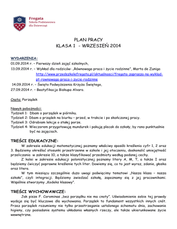 PLAN PRACY KLASA 1 - WRZESIEŃ 2014 WYDARZENIA: 01.09.2014 r. – Pierwszy dzień zajęć szkolnych, 13.09.2014 r. – Wykład dla rodziców: „Równowaga praca i życie rodzinne”, Marta de Zuniga http://www.przedszkolefregata.pl/aktualnosci/fregata-zaprasza-na-wykladpt-rownowaga-praca-i-zycie-rodzinne 14.09.2014 r. – Święto Podwyższenia Krzyża Świętego, 27.09.2014 r. – Beatyfikacja Biskupa Alvaro. Cnota: Porządek Nawyk pobożności: Tydzień 1: Dbam o porządek w piórniku. Tydzień 2: Dbam o prządek na biurku – przed, w trakcie i po skończonej pracy. Tydzień 3: Odrabiam lekcje o stałej porze. Tydzień 4: Wieczorem przygotowuję mundurek i pakuję plecak do szkoły, by rano punktualnie być na zajęciach. TREŚCI EDUKACYJNE: W zakresie edukacji matematycznej poznamy właściwy sposób kreślenia cyfr 1, 2 oraz 3. Będziemy określać stosunki przestrzenne w szkole i jej otoczeniu, doskonalić umiejętność przeliczania w zakresie 10, a także klasyfikować przedmioty według podanej cechy. Z kolei w zakresie edukacji polonistycznej poznamy litery A, M, T, a także I oraz będziemy ćwiczyć poprawne kreślenie tych liter. Dowiemy się, co to jest wyraz, zdanie, głoska oraz litera. W tym miesiącu szczególnie dużo uwagi poświęcimy tematowi „Nasza klasa – nasza szkoła”, czyli integracji. Będziemy zwiedzać szkołę, zapoznamy się z jej pracownikami. Wspólnie stworzymy „Kodeks klasowy”. TREŚCI WYCHOWAWCZE: Jak pisze F. Corominas „bez porządku nie ma cnoty”. Uświadomienie sobie tej prawdy wydaje się być kluczowe dla wychowania. Porządek to fundament wszystkich innych cnót. Przez porządek rozumiemy nie tylko przestrzeganie ustalonego schematu dnia, zachowanie higieny, czy posiadanie systemu układania własnych rzeczy, ale także ukierunkowane życie wewnętrzne. Porządek jest nie tylko cnotą, ale i dobrem. Dzięki niemu rozumiemy wartości, wyrażamy szacunek wobec innych ludzi. Porządek jest gwarantem poczucia bezpieczeństwa i spokoju – jeżeli wszystko jest na swoim miejscu, w każdej chwili dostępne, nie marnujemy czasu na nerwowe poszukiwanie kluczy na 3 minuty przed wyjściem, czy też szukanie książki niezbędnej na pierwszej lekcji w szkole. Musimy pamiętać, że człowiek, który potrafi utrzymać porządek wokół siebie, będzie także dobrze zorganizowany, wydajniej zaplanuje swój dzień i pracę, dotrzyma terminów. Porządek zwiększa skuteczność i pomaga osiągać wyznaczone cele. Nowy rok szkolny jest świetną okazją do rozwijania właśnie tej cnoty. Rozpoczynając naukę w Szkole dziewczynki dostają plan zajęć – uporządkowany i przewidywalny, każda czynność ma swój czas. Otrzymane książki wymagają obłożenia i podpisania oraz starannego zaplanowania, gdzie będę trzymała podręczniki, jak będzie wyglądać moje biurko, gdzie postawić lampkę, a gdzie kosz na śmieci? O której godzinie będę odrabiać lekcje? Gdzie powieszę kalendarz, w którym będę zapisywać zadania i terminy sprawdzianów? W którym miejscu będzie leżał przygotowany na rano mundurek? Nowy rok szkolny to dobry pretekst, żeby dziecko otrzymało budzik – będzie mogła budzić się rano sama, a po południu będzie uczyć się kontrolować czas przeznaczony na odrabianie pracy domowej. Przy pracy nad rozwijaniem cnoty porządku musimy pamiętać o trzech podstawowych sprawach: 1. Każda rzecz powinna mieć swoje miejsce – musimy zorganizować przestrzeń na nowe rzeczy. 2. Dobry przykład jest podstawą dobrego wychowania – rodzice dają przykład swoją postawą, jak należy porządkować rzeczy wokół siebie. 3. Najlepszy przykład to starać się być lepszym – na zmianę nawyku potrzebne jest 21 dni, a potem jeszcze pół roku utrwalania! Takie zmiany nie zachodzą od razu, niemniej trzeba się starać i każdego dnia być trochę bardziej uporządkowanym niż wczoraj. W opanowaniu tej cnoty mogą pomóc tak zwane łańcuszki zdarzeń: np. myję ręce, odmawiam modlitwę, zjadam posiłek, dziękuję Bogu za posiłek, odkładam naczynia do zmywarki, myję ręce lub: wracam do domu, witam się z domownikami, odkładam wierzchnie ubranie i buty na miejsce, przebieram się w strój domowy, sprawdzam stan mundurka, brudne rzeczy wkładam do prania, czyste odwieszam na miejsce. Drugim pomysłem godnym uwagi, jest wspólne sprzątanie. Zaproszenie córek do pomocy w sprzątaniu pozwoli im uczyć się samodzielności, a jednocześnie powinno stać się okazją do rozmowy na temat porządku i kryteriów, jakimi się kierujemy porządkując własne rzeczy. W kształtowaniu cnoty porządku nie chodzi o to, aby narzucać dziewczynkom sposób porządkowania rzeczy – niech utrzymują porządek według własnego kryterium, tak, aby korzystanie z uporządkowanych rzeczy, było dla nich wygodne. Więcej o cnocie porządku w książkach: F. Corominas „Wychowywać dziś” M. T. Galiana, A. Gonzales „Twoja córka w wieku 6 – 7 lat” B. Nadolna „Przygotowanie przedszkolaka do szkoły”