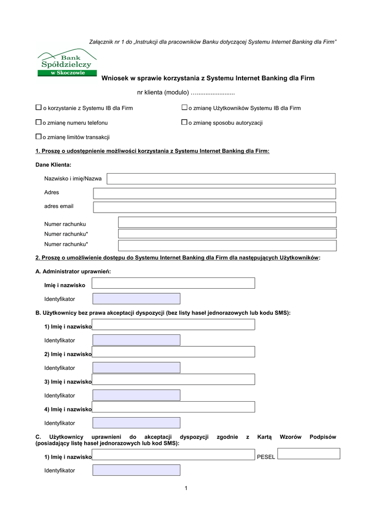Załącznik nr 1 do „Instrukcji dla pracowników Banku dotyczącej Systemu Internet Banking dla Firm” Wniosek w sprawie korzystania z Systemu Internet Banking dla Firm nr klienta (modulo) …...................... o korzystanie z Systemu IB dla Firm o zmianę Użytkowników Systemu IB dla Firm o zmianę numeru telefonu o zmianę sposobu autoryzacji o zmianę limitów transakcji 1. Proszę o udostępnienie możliwości korzystania z Systemu Internet Banking dla Firm: Dane Klienta: Nazwisko i imię/Nazwa Adres adres email Numer rachunku Numer rachunku* Numer rachunku* 2. Proszę o umożliwienie dostępu do Systemu Internet Banking dla Firm dla następujących Użytkowników: A. Administrator uprawnień: Imię i nazwisko Identyfikator B. Użytkownicy bez prawa akceptacji dyspozycji (bez listy haseł jednorazowych lub kodu SMS): 1) Imię i nazwisko Identyfikator 2) Imię i nazwisko Identyfikator 3) Imię i nazwisko Identyfikator 4) Imię i nazwisko Identyfikator C. Użytkownicy uprawnieni do akceptacji dyspozycji (posiadający listę haseł jednorazowych lub kod SMS): 1) Imię i nazwisko zgodnie z Kartą PESEL Identyfikator 1 Wzorów Podpisów Autoryzacja za pomocą: Listy haseł jednorazowych w formie papierowej Haseł przesyłanych w formie wiadomości SMS Numer telefonu komórkowego do autoryzacji przelewów Hasło: drukowane w formie papierowej przesłane na numer tel komórkowego 2) Imię i nazwisko PESEL Identyfikator Autoryzacja za pomocą: Listy haseł jednorazowych w formie papierowej Haseł przesyłanych w formie wiadomości SMS Numer telefonu komórkowego do autoryzacji przelewów Hasło: drukowane w formie papierowej przesłane na numer tel komórkowego 3) Imię i nazwisko PESEL Identyfikator Autoryzacja za pomocą: Listy haseł jednorazowych w formie papierowej Haseł przesyłanych w formie wiadomości SMS Numer telefonu komórkowego do autoryzacji przelewów Hasło: drukowane w formie papierowej przesłane na numer tel komórkowego 4) Imię i nazwisko PESEL Identyfikator Autoryzacja za pomocą: Listy haseł jednorazowych w formie papierowej Haseł przesyłanych w formie wiadomości SMS Numer telefonu komórkowego do autoryzacji przelewów Hasło: drukowane w formie papierowej przesłane na numer tel komórkowego 2 3. Limity transakcji (maksymalne kwoty wypłat): Proszę o udostępnienie niżej wymienionych rachunków: Numer rachunku bez limitów transakcji z limitami transakcji max. kwota jednorazowego przelewu max. kwota dzienna wszystkich przelewów Numer rachunku bez limitów transakcji z limitami transakcji max. kwota jednorazowego przelewu max. kwota dzienna wszystkich przelewów Numer rachunku bez limitów transakcji z limitami transakcji max. kwota jednorazowego przelewu max. kwota dzienna wszystkich przelewów ................................................................ ...................................................... pieczęć firmowa Klienta i podpisy osób upoważnionych stempel i podpis pracownika Banku ................................................................ miejscowość, data * niepotrzebne skreślić □ zaznaczyć właściwe □ pola szare wypełnia Bank □ pola białe wypełnia Klient 3