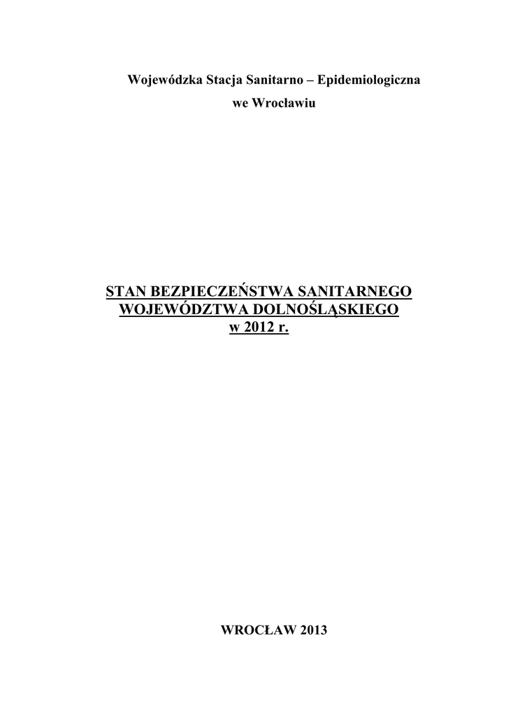 Wojewódzka Stacja Sanitarno – Epidemiologiczna we Wrocławiu STAN BEZPIECZEŃSTWA SANITARNEGO WOJEWÓDZTWA DOLNOŚLĄSKIEGO w 2012 r. WROCŁAW 2013 Stan bezpieczeństwa sanitarnego województwa dolnośląskiego w 2012 r. SPIS TREŚCI: 1 WPROWADZENIE ____________________________________________________ 7 2 ANALIZA ZAGROśEŃ EPIDEMIOLOGICZNYCH ________________________ 8 2.1 ZAKAśENIA HIV I AIDS ________________________________________________ 8 2.2 CHOROBY SZERZĄCE SIĘ DROGĄ PŁCIOWĄ_____________________________ 8 2.3 RÓśYCZKA ___________________________________________________________ 9 2.4 KRZTUSIEC ___________________________________________________________ 9 2.5 NAGMINNE ZAPALENIE PRZYUSZNIC _________________________________ 10 2.6 WIRUSOWE ZAPALENIE WĄTROBY TYPU A, B i C _______________________ 10 2.7 BAKTERYJNE ZATRUCIA POKARMOWE________________________________ 12 2.8 GRUŹLICA ___________________________________________________________ 13 2.9 CHOROBA MENINGOKOKOWA ________________________________________ 14 2.10 BORELIOZA _________________________________________________________ 14 2.11 GRYPA I PODEJRZENIA ZACHOROWAŃ NA GRYPĘ______________________ 15 2.12 ODRA _______________________________________________________________ 16 2.13 OGNISKA EPIDEMICZNE W SZPITALACH _______________________________ 16 3 OCENA ZAOPATRZENIA W WODĘ DO SPOśYCIA PRZEZ LUDZI _______ 18 3.1 WODOCIĄGI W PRZEDZIALE PRODUKCJI 10 001 – 100 000 M3/DOBĘ _______ 18 3.2 WODOCIĄGI W PRZEDZIALE PRODUKCJI 1 001 – 10 000 M3/DOBĘ _________ 19 3.3 WODOCIĄGI W PRZEDZIALE PRODUKCJI 101 – 1 000 M3/DOBĘ ___________ 19 3.4 WODOCIĄGI W PRZEDZIALE PRODUKCJI < 100 M3/DOBĘ ________________ 19 3.5 INNE PODMIOTY ZAOPATRUJĄCE W WODĘ ____________________________ 26 3.6 PRZEKROCZENIA PARAMETRÓW W WODOCIĄGACH ZBIOROWEGO ZAOPATRZENIA W WODĘ ___________________________________________________ 26 3.7 INFORMACJE NT. ZWODOCIĄGOWANIA MIEJSCOWOŚCI NA OBSZARZE WOJEWÓDZTWA DOLNOŚLĄSKIEGO ________________________________________ 26 3.8 OCENA JAKOŚCI WODY UJMOWANEJ DO CELÓW WODOCIĄGOWYCH ___ 27 2/98 Stan bezpieczeństwa sanitarnego województwa dolnośląskiego w 2012 r. 3.9 POSTĘPOWANIE ADMINISTRACYJNE ZWIĄZANE Z NADZOREM NAD JAKOŚCIĄ WODY __________________________________________________________ 27 3.10 OCENA JAKOŚCI WODY W KĄPIELISKACH I MIEJSCACH WYKORZYSTYWANYCH DO KĄPIELI ________________________________________ 28 4 POMIARY NATĘśENIA HAŁASU WEWNĄTRZ POMIESZCZEŃ __________ 29 5 OCENA ZANIECZYSZCZENIA CHEMICZNEGO POWIETRZA WEWNĄTRZ POMIESZCZEŃ ____________________________________________________________ 29 6 STAN SANITARNY MIAST I TERENÓW WIEJSKICH ____________________ 29 6.1 MIASTA I TERENY WIEJSKIE __________________________________________ 29 6.2 TERENY REKREACYJNE ______________________________________________ 29 6.3 PŁYWALNIE KRYTE __________________________________________________ 30 6.4 PŁYWALNIE ODKRYTE _______________________________________________ 31 6.5 PŁYWALNIE MIESZANE (KRYTO-ODKRYTE) ___________________________ 31 6.6 PARKI WODNE _______________________________________________________ 32 6.7 KĄPIELISKA _________________________________________________________ 32 6.8 MIEJSCA WYKORZYSTYWANE DO KĄPIELI ____________________________ 33 6.9 DOMY POMOCY SPOŁECZNEJ _________________________________________ 34 6.10 INNE JEDNOSTKI ORGANIZACYJNE POMOCY SPOŁECZNEJ ______________ 35 6.11 PLACÓWKI ZAPEWNIAJĄCE CAŁODOBOWĄ OPIEKĘ ____________________ 35 6.12 NOCLEGOWNIE ______________________________________________________ 35 6.13 HOTELE, MOTELE I PENSJONATY _____________________________________ 36 6.14 DOMY WYCIECZKOWE _______________________________________________ 36 6.15 KEMPINGI, SCHRONISKA I POLA BIWAKOWE __________________________ 37 6.16 INNE OBIEKTY, W KTÓRYCH ŚWIADCZONE SĄ USŁUGI HOTELARSKIE ___ 37 6.17 ZAKŁADY FRYZJERSKIE ______________________________________________ 37 6.18 ZAKŁADY KOSMETYCZNE ____________________________________________ 38 6.19 ZAKŁADY TATUAśU _________________________________________________ 38 6.20 ZAKŁADY ODNOWY BIOLOGICZNEJ ___________________________________ 38 3/98 Stan bezpieczeństwa sanitarnego województwa dolnośląskiego w 2012 r. 6.21 ZAKŁADY, W KTÓRYCH ŚWIADCZONE SĄ ŁĄCZNIE USŁUGI UPIĘKSZAJĄCE CIAŁO _____________________________________________________________________ 39 6.22 USTĘPY PUBLICZNE __________________________________________________ 39 6.23 CMENTARZE, DOMY PRZEDPOGRZEBOWE, EKSHUMACJE _______________ 39 7 PODMIOTY LECZNICZE _____________________________________________ 41 7.1 SZPITALE ___________________________________________________________ 41 7.2 SZPITALE UZDROWISKOWE __________________________________________ 42 7.3 SANATORIA I PREWENTORIA _________________________________________ 42 7.4 PRZYCHODNIE, OŚRODKI, PORADNIE, AMBULATORIA __________________ 43 7.5 STACJE DIALIZ ______________________________________________________ 44 7.6 PRAKTYKI LEKARSKIE, PRAKTYKI PIELĘGNIAREK I POŁOśNYCH _______ 44 7.7 ZAKŁADY OPIEKUŃCZO-LECZNICZE I PIELĘGNACYJNO-OPIEKUŃCZE ___ 45 7.8 HOSPICJA ___________________________________________________________ 46 8 STAN SANITARNY OBIEKTÓW I ŚRODKÓW TRANSPORTU ____________ 47 8.1 PRZEJŚCIA GRANICZNE ______________________________________________ 47 8.2 DWORCE I STACJE KOLEJOWE ________________________________________ 47 8.3 DWORCE AUTOBUSOWE______________________________________________ 47 8.4 WIATY PRZYSTANKOWE _____________________________________________ 47 8.5 PORTY LOTNICZE ____________________________________________________ 48 8.6 PRZYSTANIE ________________________________________________________ 48 8.7 ŚRODKI TRANSPORTU PASAśERSKIEGO _______________________________ 48 9 OCHRONA PRZED PROMIENIOWNIEM JONIZUJĄCYM I NIEJONIZUJĄCYM ________________________________________________________ 50 9.1 PRACOWNIE RENTGENOWSKIE ______________________________________