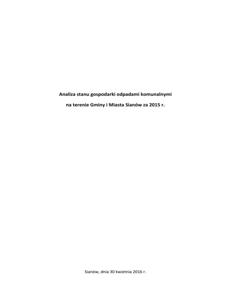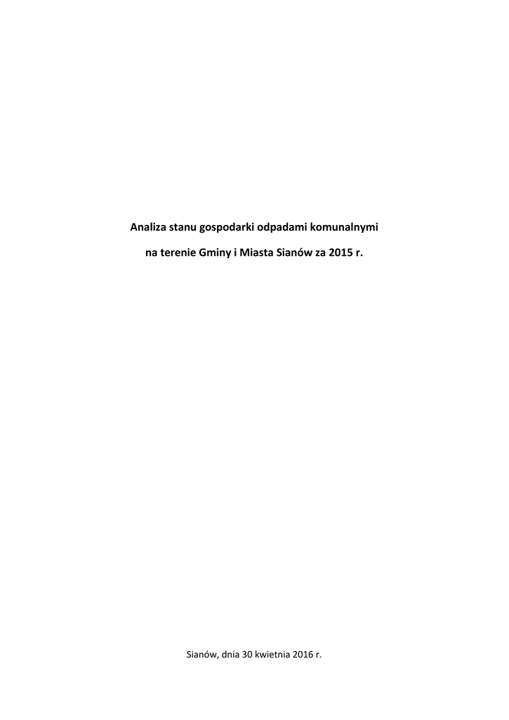 Analiza stanu gospodarki odpadami komunalnymi na terenie Gminy i Miasta Sianów za 2015 r. Sianów, dnia 30 kwietnia 2016 r. I Wstęp Zgodnie z art. 3 ust. 2 pkt. 10 ustawy z dnia 13 września 1996 r. o utrzymaniu czystości i porządku w gminach (t. j. Dz. U. z 2016 r. poz. 250) zadaniem gminy jest dokonanie corocznej analizy stanu gospodarki odpadami komunalnymi, w celu weryfikacji możliwości technicznych i organizacyjnych gminy w zakresie gospodarowania odpadami komunalnymi obejmującą w szczególności: 1) możliwości przetwarzania zmieszanych odpadów komunalnych, odpadów zielonych oraz pozostałości z sortowania i pozostałości z mechaniczno-biologicznego przetwarzania odpadów komunalnych przeznaczonych do składowania; 2) potrzeby inwestycyjne związane z gospodarowaniem odpadami komunalnymi; 3) koszty poniesione w związku z odbieraniem, odzyskiem, recyklingiem i unieszkodliwianiem odpadów komunalnych; 4) liczbę mieszkańców; 5) liczbę właścicieli nieruchomości, którzy nie zawarli umowy, o której mowa w art. 6 ust. 1, w imieniu których gmina powinna podjąć działania, o których mowa w art. 6 ust. 6-12; 6) ilość odpadów komunalnych wytwarzanych na terenie gminy; 7) ilość zmieszanych odpadów komunalnych, odpadów zielonych odbieranych z terenu gminy oraz powstających z przetwarzania odpadów komunalnych pozostałości z sortowania i pozostałości z mechaniczno-biologicznego przetwarzania odpadów komunalnych przeznaczonych do składowania. II Ogólna charakterystyka gminy Gmina Sianów położona jest w północno – wschodniej części województwa zachodniopomorskiego w powiecie koszalińskim przy drodze krajowej Nr 6. Od zachodu graniczy z Koszalinem, od strony południowej z gminą Polanów i Manowo, od północy z gminami Mielno i Darłowo, a od wschodu z gminą Malechowo. Od północy naturalne granice gminy stanowią przybrzeżne jeziora Jamno i Bukowo, od zachodu szerokie i płaskie dno doliny rzeki Unieść. Południe gminy otacza kompleks lasów Góry Chełmskiej oraz lasów nadleśnictwa Manowo, a od wschodu kompleks lasów nadleśnictwa Karnieszewice. W skład gminy wchodzi miasto Sianów oraz 24 sołectwa. Ogólna powierzchnia gminy Sianów wynosi 226,78 km2 i jest zamieszkiwana przez 13.480 mieszkańców (stan na dzień 31.12.2015 r.). III System gospodarowania odpadami w gminie Sianów Odbiór i zagospodarowanie odpadów komunalnych od właścicieli nieruchomości zamieszkałych realizowane jest przez Przedsiębiorstwo Gospodarki Komunalnej Sp. z o. o. w Koszalinie. W postępowaniu przetargowym została złożona tylko jedna oferta. Firma wyłoniona została w trybie przetargu nieograniczonego. Umowa zawarta została na okres czterech lat to jest do 31.12.2016 r. Na terenie Gminy Sianów funkcjonuje, w granicach administracyjnych miasta Sianowa, regionalna instalacja do przetwarzania odpadów. Właścicielem instalacji jest Przedsiębiorstwo Gospodarki Komunalnej Sp. z o. o. z siedzibą w Koszalinie, ul. Komunalna 5. Zgodnie z „Planem Gospodarki Odpadami dla Województwa Zachodniopomorskiego na lata 2012 – 2017 z uwzględnieniem perspektywy na lata 2018-2023” w skład regionu koszalińskiego, do którego należy także gmina Sianów, wchodzą następujące gminy: Będzino, Białogard (M), Białogard (W), Biesiekierz, Bobolice, Darłowo (M), Darłowo (W), Dygowo, Gościno, Karlino, Kołobrzeg (W), Koszalin, Malechowo, Manowo, Mielno, Polanów, Postomino, Siemyśl, Sławno (M), Sławno (W), Świeszyno, Tychowo, Ustronie Morskie. Odpady odbierane z terenu gminy Sianów kierowane są do instalacji w Sianowie. Oprócz odpadów z terenu naszej gminy na instalacje w Sianowie kierowane są także odpady z miasta Koszalina i okolicznych gmin: Będzino, Biesiekierz, Mielno, Polanów i Malechowo. Na terenie gminy Sianów zorganizowano przy ul. Tylnej 34 w Sianowie Punkt Selektywnej Zbiórki Odpadów Komunalnych (PSZOK) oraz Mobilny Punkt Zbiórki. PSZOK czynny jest w każdą sobotę od godz. 8:00 do godz. 16:00, a Mobilny Punkt Zbiórki odbiera odpady, z ustalonych na terenie gminy punktów, cztery razy w roku. Do PSZOK mieszkańcy całej gminy mogą nieodpłatnie dostarczać odpady „problemowe”, m.in. meble i inne odpady wielkogabarytowe, przeterminowane leki, zużyty sprzęt elektryczny i elektroniczny, zużyte opony, lampy fluorescencyjne i inne odpady zawierające rtęć, w tym świetlówki, termometry, przełączniki, zużyte kartridże i tonery (vide Zał. nr 1). Odpady biodegradowalne (w tym zielone) z nieruchomości zamieszkałych odbierane są, bez dodatkowych opłat, z częstotliwością raz na dwa tygodnie w okresie od 15 marca do 15 listopada. Gmina prowadzi działalność informacyjną i edukacyjną w zakresie prawidłowego postępowania mieszkańców z odpadami komunalnymi. Do wykorzystanych w tym celu form komunikowania się z mieszkańcami gminy należały m.in.: - informacje wywieszane na tablicach ogłoszeń w poszczególnych miejscowościach, - artykuły zamieszczane na stronie internetowej w aktualnościach, - zakładka „Odpady komunalne” na stronie www.sianow.pl, - gra edukacyjna „EKO-GRA” na stronie www.sianow.pl, Ponadto mieszkańcy w celu uzyskania dalszych informacji dotyczących zasad funkcjonowania nowego systemu gospodarki odpadami mogą kontaktować się bezpośrednio z Urzędem Gminy i Miasta w Sianowie osobiście (oficyna, I piętro, pokój nr 2), telefonicznie – pod nr (94) 346 95 39 lub poprzez pocztę elektroniczną – pod adresem [email protected]. W ramach systemu, nieruchomości wielorodzinne wyposażono w pojemniki a nieruchomości jednorodzinne – w pojemniki i worki do gromadzenia odpadów komunalnych. IV Ocena możliwości technicznych i organizacyjnych Gminy w zakresie gospodarowania odpadami komunalnymi 1. Możliwości przetwarzania zmieszanych odpadów komunalnych, odpadów zielonych oraz pozostałości z sortowania odpadów komunalnych przeznaczonych do składowania. Wszystkie ww. o