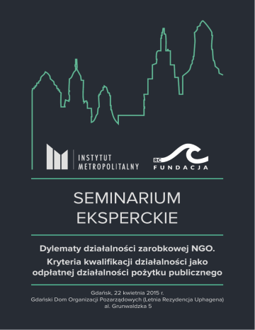 SEMINARIUM EKSPERCKIE Dylematy działalności zarobkowej NGO. Kryteria kwalifikacji działalności jako odpłatnej działalności pożytku publicznego Gdańsk, 22 kwietnia 2015 r. Gdański Dom Organizacji Pozarządowych (Letnia Rezydencja Uphagena) al. Grunwaldzka 5 PRZEDMIOT Organizacje pozarządowe potrzebują środków finansowych. Jakże inaczej mogłyby osiągać cele statutowe? Zgodnie z obowiązującymi przepisami prawa mogą one wykonywać działalność zarobkową i pobierać wynagrodzenie za świadczone usługi. Mogą one prowadzić zarówno działalność gospodarczą – z zastrzeżeniem wpisu w rejestrze przedsiębiorców, jak i tzw. odpłatną działalność pożytku publicznego. Odpłatna działalność pożytku publicznego jest nową formą aktywności przeznaczoną jedynie dla organizacji pozarządowych i niektórych innych podmiotów prawa (np. kościelnych osób prawnych). Stanowi ona wyjątek od zasady. Zasadą jest bowiem, że działalność zarobkowa odbywa się w formie działalności gospodarczej. Działalność odpłatna jest więc ukłonem prawodawcy w kierunku NGOsów, zachętą do podejmowania przez nie działalności zarobkowej. W praktyce pojawiają się jednak liczne wątpliwości. Istnieje poważna trudność z delimitacją działalności gospodarczej i odpłatnej działalności pożytku publicznego. Organizacje pozarządowe, działające w dobrej wierze, często bez fachowego wykształcenia, mylą wskazane pojęcia lub mieszają zakresy ich desygnatów narażając się tym samym na uchybienia prawa i sankcje administracyjne. Celem seminarium eksperckiego – w którym wezmą udział przedstawiciele administracji publicznej, organizacji pozarządowych i nauki – jest wypracowanie jasnych i klarownych kryteriów kwalifikacji działalności jako odpłatnej działalności pożytku publicznego. Chodzi o wypracowanie takich kryteriów ocennych, które po zestawieniu z określoną działalnością NGOsów pozwolą ustalić sposób jej kwalifikacji prawnej. ZAPISY Seminarium jest otwarte i bezpłatne. Dla celów organizacyjnych wymagane jest jednak zgłoszenie chęci uczestnictwa na adres: [email protected] PROGRAM • • • • • 15.00-15.10 – otwarcie spotkania i powitanie gości; 15.10-15.20 – referat wprowadzający; 15.20-17.00 – dyskusja; 17.00-17.20 – przerwa kawowa; 17.20-19.00 – dyskusja. ORGANIZATORZY Regionalne Centrum Informacji i Wspomagania Organizacji Pozarządowych to pionierska organizacja pozarządowa o ponad 22-letnim stażu działalności. Jako jedna z pierwszych po transformacji ustrojowej podjęła trud wspierania rozwoju sektora organizacji pozarządowych i przedsiębiorstw ekonomii społecznej. Instytut Metropolitalny to organizacja ekspercka (think tank) integrująca reprezentantów różnych dyscyplin naukowych (prawa, administracji, urbanistyki), jak i profesji (prawników, urzędników) i pasji (działaczy społecznych, wolontariuszy). Prowadzi badania naukowe i prace koncepcyjne w zakresie polityk metropolitalnych. KONTAKT Koordynatorzy projektu Jakub H. Szlachetko T: +48 726 307 011 M: [email protected] Agata Broniewska T: +48 513 969 799 M: [email protected]