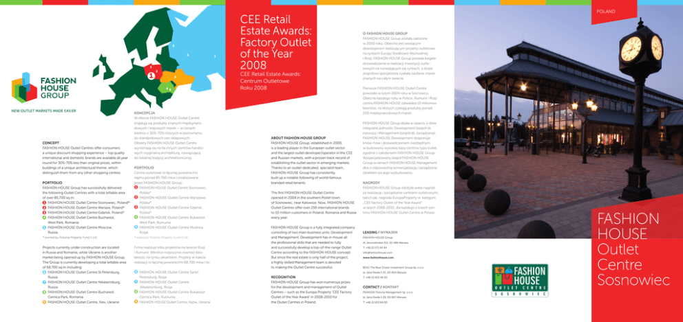 6 5 3 1 2 9 48 CONCEPT FASHION HOUSE Outlet Centres offer consumers a unique discount shopping experience – top quality international and domestic brands are available all year round for 30%-70% less than original prices, within buildings of a unique architectural theme, which distinguish them from any other shopping centres. KONCEPCJA W ofercie FASHION HOUSE Outlet Centre znajdują się produkty znanych międzynarodowych i krajowych marek – w cenach średnio o 30%-70% niższych w porównaniu do standardowych cen sklepowych. Obiekty FASHION HOUSE Outlet Centre wyróżniają się na tle innych centrów handlowych oryginalną architekturą, nawiązującą do lokalnej tradycji architektonicznej. PORTFOLIO FASHION HOUSE Group has successfully delivered the following Outlet Centres with a total lettable area of over 85,700 sq m: 1 FASHION HOUSE Outlet Centre Sosnowiec, Poland* 2 FASHION HOUSE Outlet Centre Warsaw, Poland* 3 FASHION HOUSE Outlet Centre Gdańsk, Poland* 4 FASHION HOUSE Outlet Centre Bucharest, West Park, Romania 5 FASHION HOUSE Outlet Centre Moscow, Russia PORTFOLIO Centra outletowe (o łącznej powierzchni najmu ponad 85 700 mkw.) zrealizowane przez FASHION HOUSE Group: 1 FASHION HOUSE Outlet Centre Sosnowiec, Polska* 2 FASHION HOUSE Outlet Centre Warszawa, Polska* 3 FASHION HOUSE Outlet Centre Gdańsk, Polska* 4 FASHION HOUSE Outlet Centre Bukareszt West Park, Rumunia 5 FASHION HOUSE Outlet Centre Moskwa, Rosja * owned by Polonia Property Fund II Ltd * własność Polonia Property Fund II Ltd Projects currently under construction are located in Russia and Romania, while Ukraine is another market being opened up by FASHION HOUSE Group. The Group is currently developing a total lettable area of 68,700 sq m including: 6 FASHION HOUSE Outlet Centre St Petersburg, Russia 7 FASHION HOUSE Outlet Centre Yekaterinburg, Russia 8 FASHION HOUSE Outlet Centre Bucharest, Cernica Park, Romania 9 FASHION HOUSE Outlet Centre, Kiev, Ukraine Firma realizuje kilka projektów na terenie Rosji i Rumunii. Wkrótce rozpocznie również działalność na rynku ukraińskim. Projekty w trakcie realizacji (o łącznej powierzchni 68 700 mkw.) to: 7 CEE Retail Estate Awards: Factory Outlet of the Year 2008 CEE Retail Estate Awards: Centrum Outletowe Roku 2008 ABOUT FASHION HOUSE GROUP FASHION HOUSE Group, established in 2000, is a leading player in the European outlet sector and the largest outlet developer/operator in the CEE and Russian markets, with a proven track record of establishing the outlet sector in emerging markets. Thanks to an outlet-dedicated, specialist team, FASHION HOUSE Group has consistently built up a notable following of world-famous branded retail tenants. The first FASHION HOUSE Outlet Centre opened in 2004 in the southern Polish town of Sosnowiec, near Katowice. Now, FASHION HOUSE Outlet Centres offer over 250 international brands to 10 million customers in Poland, Romania and Russia every year. FASHION HOUSE Group is a fully integrated company consisting of two main business units: Development and Management. Development has in-house all the professional skills that are needed to fully and successfully develop a top-of-the-range Outlet Centre according to the FASHION HOUSE concept. But since the real estate is only half of the project, a highly skilled Management team is devoted to making the Outlet Centre successful. 6 FASHION HOUSE Outlet Centre Sankt Petersburg, Rosja 7 FASHION HOUSE Outlet Centre Jekaterynburg, Rosja 8 FASHION HOUSE Outlet Centre Bukareszt Cernica Park, Rumunia 9 FASHION HOUSE Outlet Centre, Kijów, Ukraina POLAND O FASHION HOUSE GROUP FASHION HOUSE Group została założona w 2000 roku. Obecnie jest wiodącym deweloperem realizującym projekty outletowe na rynkach Europy Środkowo-Wschodniej i Rosji. FASHION HOUSE Group posiada bogate doświadczenie w realizacji inwestycji outletowych na rozwijających się rynkach, a dzięki zespołowi specjalistów zyskała zaufanie marek znanych na całym świecie. Pierwsze FASHION HOUSE Outlet Centre powstało w lutym 2004 roku w Sosnowcu. Obecnie każdego roku w Polsce, Rumunii i Rosji centra FASHION HOUSE odwiedza 10 milionów klientów, na których czekają produkty ponad 250 międzynarodowych marek. FASHION HOUSE Group działa w oparciu o dwie integralne jednostki: Development (zespół ds. rozwoju) i Management (zespół ds. zarządzania). FASHION HOUSE Development dysponuje know-how i doświadczeniem niezbędnym w budowaniu wysokiej klasy centrów typu outlet, zgodnie z założeniami FASHION HOUSE Group. Wyspecjalizowany zespół FASHION HOUSE Group w ramach FASHION HOUSE Management dba o odpowiednią komercjalizację i zarządzanie obiektem po jego wybudowaniu. NAGRODY FASHION HOUSE Group zdobyła wiele nagród za realizację i zarządzanie centrami outletowymi, takich jak. nagroda EuropaProperty w kategorii „CEE Factory Outlet of the Year Award” w latach 2008-2010, dla każdego z trzech centrów FASHION HOUSE Outlet Centre w Polsce. FASHION HOUSE Outlet Centre Sosnowiec LEASING / WYNAJEM FASHION HOUSE Group Al. Jerozolimskie 212, 02-486 Warsaw T: +48 22 571 44 44 [email protected] www.fashionhouse.com BOIG The Blue Ocean Investment Group Sp. z o.o. al. Jana Pawła II 25, 00-854 Warsaw RECOGNITION FASHION HOUSE Group has won numerous prizes for the development and management of Outlet Centres – such as the Europa Property ‘CEE Factory Outlet of the Year Award’ in 2008-2010 for the Outlet Centres in Poland. T: +48 22 653 46 20 CONTACT / КОNТАКT PEAKSIDE Polonia Management Sp. z o.o. al. Jana Pawła II 29, 00-867 Warsaw T: +48 22 653 69 00 S O S N O W I E C POLSKA FASHION HOUSE OUTLET CENTRE SOSNOWIEC The first Outlet Centre under the FASHION HOUSE brand in Poland, FASHION HOUSE Outlet Centre Sosnowiec boasts a prime location in one of the most densely populated regions of the country and a unique architectural theme, making it a very successful outlet venture. Jest to pierwsze centrum outletowe 