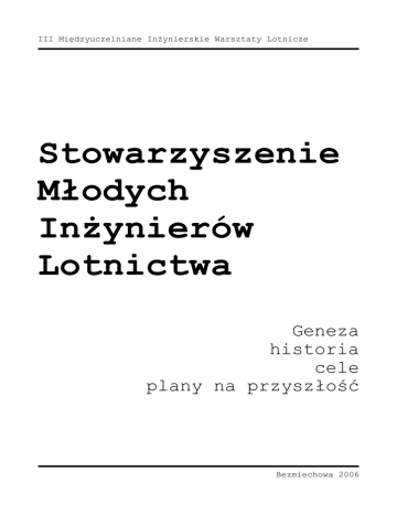 III Międzyuczelniane Inżynierskie Warsztaty Lotnicze Stowarzyszenie Młodych Inżynierów Lotnictwa Geneza historia cele plany na przyszłość Bezmiechowa 2006 III Międzyuczelniane Inżynierskie Warsztaty Lotnicze Geneza SMIL Stowarzyszenie Młodych Inżynierów Lotnictwa powstało jako wynik potrzeby. W 2001 roku wybieraliśmy się na wyprawę naukową będącą częścią przedmiotu "Laboratorium przemysłowe", odrabianego w ramach ścieżki "Lotnictwo" na Wydziale Mechanicznym Energetyki i Lotnictwa PW. Uświadomiliśmy sobie po jakimś czasie, że uzyskanie wsparcia finansowego takiej imprezy jest praktycznie niemożliwe. SMIL powstał jako narzędzie ułatwiające nawiązywanie kontaktu z potencjalnymi pracodawcami i sponsorami przedsięwzięć statutowych. Dzięki działaniu w SMIL coraz więcej młodych ludzi zainteresowanych inżynierską pracą w lotnictwie spotyka swojego pracodawcę. Bezmiechowa 2006 III Międzyuczelniane Inżynierskie Warsztaty Lotnicze Cele Statutowe Stowarzyszenie Młodych Inżynierów Lotnictwa posiada osobowość prawną. Nasz statut przewiduje realizację następujących celów: • • • • Popularyzacja lotnictwa Prowadzenie szeroko zakrojonej działalności mającej na celu podwyższenie kwalifikacji zawodowych członków SMIL Organizacja i udział w imprezach popularno-naukowych, sportowch i popularyzatorskich Nawiązywanie kontaktu z potencjalnymi pracodawcami w branży lotniczej, organizacja studenckich praktyk dyplomowych Bezmiechowa 2006 III Międzyuczelniane Inżynierskie Warsztaty Lotnicze Krótka historia 2001 Laboratorium Przemysłowe MEiL PW 2002 Grudzień. Zebranie założycielskie SMIL 2003 SMIL otrzymuje do użytku siedzibę w Starej Hamowni Instytutu Lotnictwa Maj. Ekspozycja na VIII Międzynarodowym Pikniku Loticzym w Góraszce Czerwiec. Program pokazów na VII Pikniku Naukowym Polskiego Radia Bis Listopad. Seminarium okolicznościowe "Polscy inżynierowie w Stulecie Lotnictwa" 2004 Maj. Członkowie SMIL uczestniczą w organizacji IX Międzynarodowego Pikniku Lotniczego w Góraszce Czerwiec. Program pokazów na VII Pikniku Naukowym Polskiego Radia Bis Listopad. I Międzyuczelniane Inżynierskie Warsztaty Lotnicze w Bezmiechowej 2005 Czerwiec. Członkowie SMIL uczestniczą w organizacji IX Międzynarodowego Pikniku Lotniczego w Góraszce Lipiec. II Międzyuczelniane Inżynierskie Warsztaty Lotnicze w Bezmiechowej Listopad. Wybory do władz SMIL 2006 Tu jesteśmy... Bezmiechowa 2006 III Międzyuczelniane Inżynierskie Warsztaty Lotnicze Plany SMIL zakończył właśnie pierwszą kadencję zarządu. Dzięki swej aktywności staliśmy się organizacją rozpoznawalną w środowisku lotniczym. Nasze plany na przyszłość to ciągła realizacja zadań statutowych Stowarzyszenia, a przede wszystkim: • • • Kontynuacja rozpoczętych projektów, a więc organizacja corocznych Międzyuczelnianych Inżynierskich Warsztatów Lotniczych, udział naszych członków w Międzynarodowym Pikniku Lotniczym w Góraszce, organizacja pokazów podzas Pikniku Naukowego Polskiego Radia i doinwestowywanie naszej siedziby Działanie na rzecz młodych inżynierów, rozpoczynających swe życie zawodowe: organizacja praktyk dyplomowych i poszukiwanie miejsc pracy w zawodzie Działania na rzecz integracji naszego środowiska: jest nas przecież niewiele, a spędzanie czasu wśród ludzi o tych samych zainteresowaniach sprawia nam tyle przyjemności. Dlatego też SMIL planuje rozpoczęcie organizacji imprez integracyjnych, takich jak wyjazdy czy ogniska, po to tylko, aby mile spędzać czas. Integracja środowiska to przecież również nasz cel statutowy... Bezmiechowa 2006 III Międzyuczelniane Inżynierskie Warsztaty Lotnicze SMIL w liczbach 35 32,5 30 27,5 25 22,5 20 17,5 15 12,5 10 7,5 5 2,5 0 2 1 1 3 1 22 30 25 23 1 1 1 1 2002 2003 2004 2005 Członkowie honorowi Członkowie zwyczajni 26 Członkowie wspierający PL PRZ PW PWR Potencjałem Stowarzyszenia są jego członkowie. Jakkolwiek na początku SMIL tworzyli jedynie ludzie związani z Politechniką Warszawską, zainteresowanie naszą organizacją przejawiają przedstawiciele innych ośrodków akademickich (stan na grudzień 2005) 20800 20000 5436 3757 2003 2004 2005 2006 (prognoza) Budżet SMIL. Celem Stowarzyszenia jest prowadzenie zróżnicowanej działalności bez nadmiernego zwiększania budżetu. Chcemy rozwijać swe umiejętności zawodowe, a nie księgowość Bezmiechowa 2006