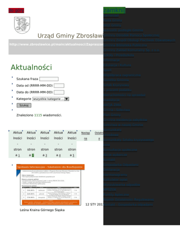 zamknij do góry Samorząd Rada Gminy Wójt Gminy Jednostki podległe Gminie Gminny Ośrodek Pomocy Społecznej Urząd Gminy Zbrosławice Gminny Zespół Obsługi Placówek Oświatowych http://www.zbroslawice.pl/main/aktualnosci/Zapraszamy-na-wyjatkowe-koncerty-Stacja-Dzw Gminna Biblioteka Publiczna ieku/i/printpdf/st:2 Gminny Zakład Komunalny Sp. z o.o. Szkoły i Przedszkola Informacje Aktualności Edukacja i Kultura Sport Współpraca zagraniczna Szukana fraza Gazetka Gminna Data od (RRRR-MM-DD) Sztab Kryzysowy 1 procent podatku Data do (RRRR-MM-DD) Nieruchomości na sprzedaż Kategorie wszystkie kategorie ... ▼ Inwestycje AKCJA ZIMA Szukaj Gmina i Sołectwa Plan Gminy Znaleziono 1115 wiadomości. Gminna ewidencja zabytków Sołectwa w naszej Gminie Komunikaty Aktua Aktua Aktua Aktua Aktua Następ Ostatni lności lności lności lności lności na a - - - - - stron stron stron stron stron a3 a4 a5 a1 a 2 Urzędowe Komunikaty Sztabu kryzysowego Inne Konsultacje społeczne Akcje wyborcze Kontakt Gospodarka Odpadami Deklaracja Harmonogramy Kalkulator opłat Wyszukiwarka odpadów MPSZOK Punkty Apteczne Rejestr Działalności Regulowanej 12 STY 2017Kontakt - Gospodarka odpadami Leśna Kraina Górnego Śląska kategoria: Aktualności Informacja o spotkaniach informacyjno - szkoleniowych dla beneficjentów 12 STY 2017 kategoria: Finał WOŚP Aktualności W niedzielę w Wieszowie odbędzię się 25 finał Wielkiej Orkiestry Świątecznej Pomocy 11 STY 2017 Informacja o wykazach nieruchomości do sprzedaży oraz na wynajem kategoria: Aktualności Informacja o wykazach nieruchomości do sprzedaży (Księży Las) oraz lokali do oddania w najem 11 STY 2017 kategoria: Zebranie Wiejskie w Czekanowie Aktualności 18 stycznia br. w Czekanowie odbędzie się Zebranie Wiejskie, którego głównym celem będzie wybór nowego Sołysa 04 STY 2017 Bezpłatne porady prawne kategoria: Aktualności Od pierwszego stycznia w Gminie Zbrosławice działa punkt nieodpłatnej pomocy prawnej. Mieści się w Gminnym Ośrodku Pomocy Społecznej ul. Tarnogórska 4a w Kamieńcu. 30 GRU 2016 Informacja o wspieraniu kobiet w ciąży i rodzin kategoria: Aktualności Z dniem 1 stycznia 2017 r. Gmina Zbrosławice przystępuje do realizacji zadania wynikającego z ustawy z dnia 4 listopada 2016 r. o wspieraniu kobiet w ciąży i rodzin „Za życiem”. 29 GRU 2016 Informacja o wydaniu decyzji środowiskowych kategoria: Aktualności WÓJT GMINY ZBROSŁAWICE INFORMUJE O PRZYSTĄPIENIU DO PRZEPROWADZENIA OCENY ODDZIAŁYWANIA NA ŚRODOWISKO 23 GRU 2016 Otwarty Konkurs Ofert w zakresie wspierania i upowszechniania kultury fizycznej kategoria: Aktualności Ogłoszenie 21 GRU 2016 OGŁOSZENIE Starosty Powiatowego kategoria: Aktualności Informujemy o rozpoczęciu prac geodezyjnych w związku z wszczęciem postępowania w sprawie modernizacji ewidencji gruntów i budynków w obrębach ewidencyjnych Czekanów, Przezchlebie, Szałsza, Świętoszowice i Ziemięcice 20 GRU 2016 Funkcjonowanie komunikacji autobusowej w okresie Świąt Bożego Narodzenia kategoria: Aktualności Zmiany w funkcjonowaniu komunikacji autobusowej w okresie Świąt Bożego Narodzenia i Nowego Roku Aktua Aktua Aktua Aktua Aktua Następ Ostatni lności lności lności lności lności na a - - - - - stron stron stron stron stron a3 a4 a5 a1 a 2