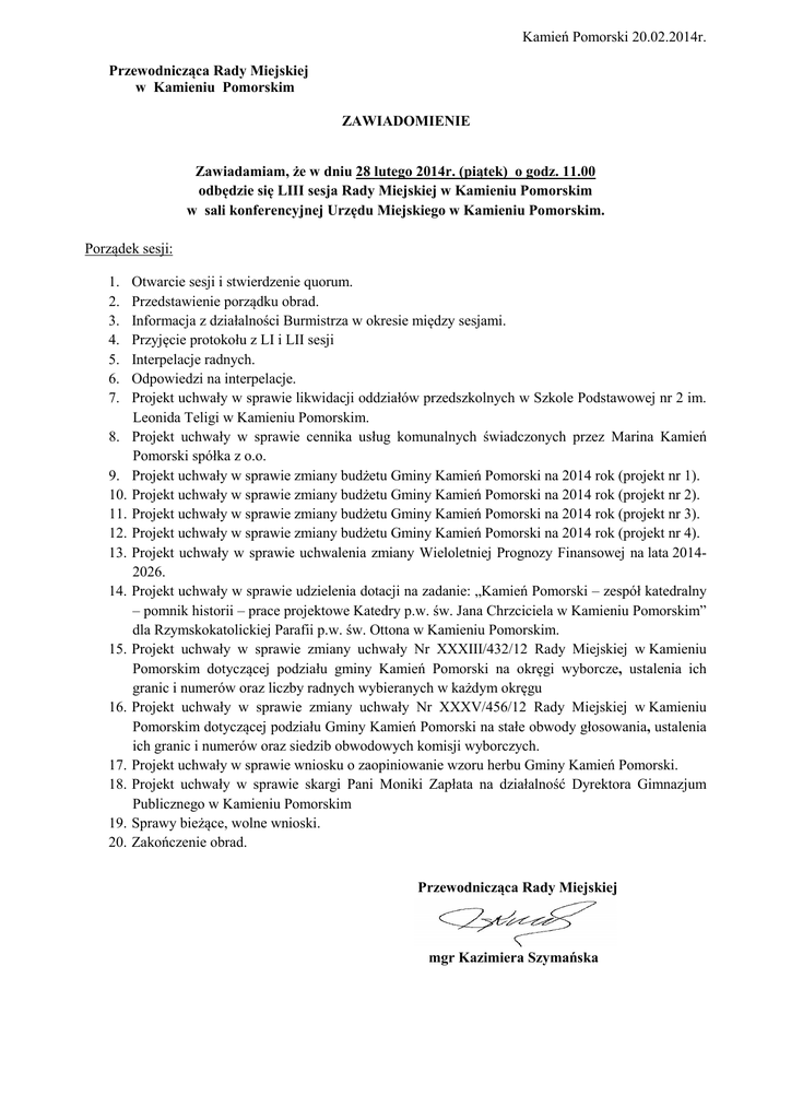 Kamień Pomorski 20.02.2014r. Przewodnicząca Rady Miejskiej w