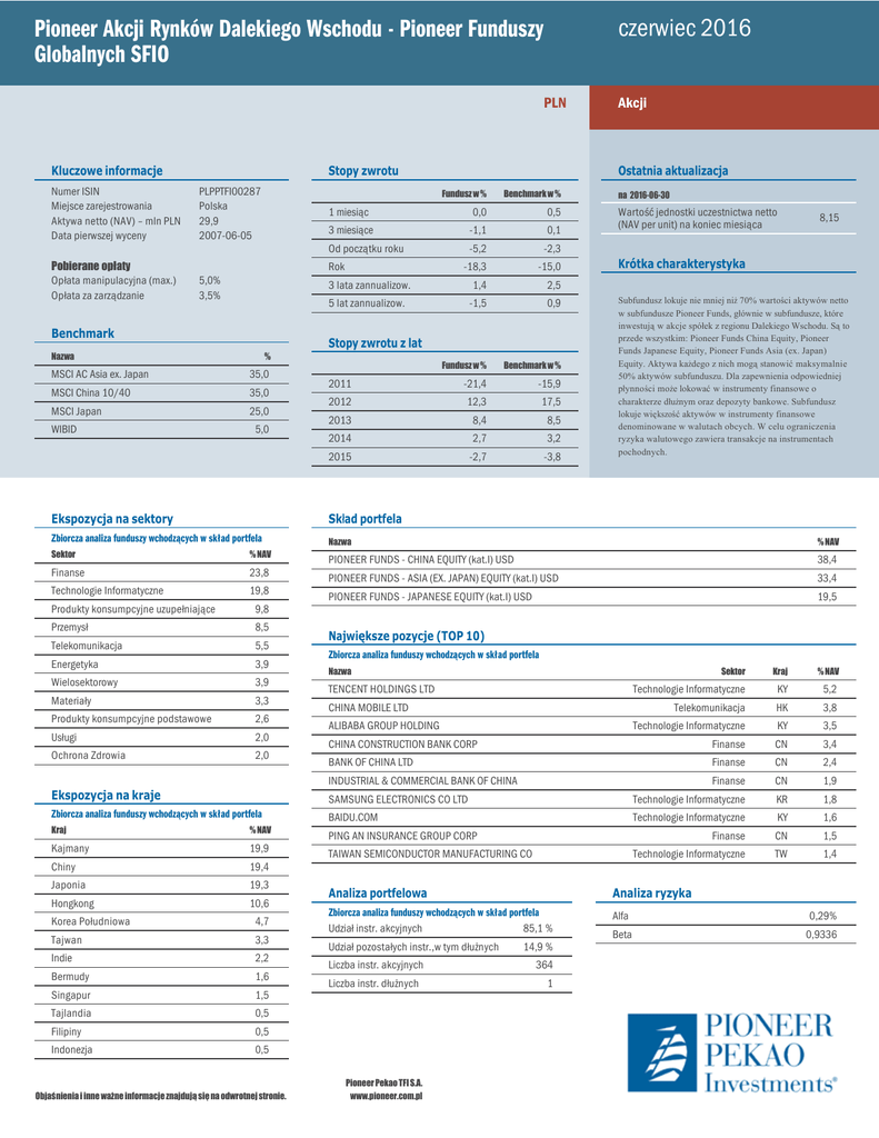 czerwiec 2016 Pioneer Akcji Rynków Dalekiego Wschodu - Pioneer Funduszy Globalnych SFIO PLN Kluczowe informacje Numer ISIN Miejsce zarejestrowania Aktywa netto (NAV) – mln PLN Data pierwszej wyceny Pobierane opłaty Opłata manipulacyjna (max.) Opłata za zarządzanie Stopy zwrotu PLPPTFI00287 Polska 29,9 2007-06-05 5,0% 3,5% Benchmark % MSCI AC Asia ex. Japan 35,0 MSCI China 10/40 35,0 25,0 WIBID 5,0 Ekspozycja na sektory Sektor % NAV Finanse 23,8 19,8 Produkty konsumpcyjne uzupełniające Przemysł Telekomunikacja Energetyka Benchmark w % 0,0 0,5 3 miesiące -1,1 0,1 Od początku roku -5,2 -2,3 -18,3 -15,0 3 lata zannualizow. 1,4 2,5 5 lat zannualizow. -1,5 0,9 Fundusz w % Benchmark w % 2011 -21,4 -15,9 2012 12,3 17,5 2013 8,4 8,5 2014 2,7 3,2 2015 -2,7 -3,8 Krótka charakterystyka Subfundusz lokuje nie mniej niż 70% wartości aktywów netto w subfundusze Pioneer Funds, głównie w subfundusze, które inwestują w akcje spółek z regionu Dalekiego Wschodu. Są to przede wszystkim: Pioneer Funds China Equity, Pioneer Funds Japanese Equity, Pioneer Funds Asia (ex. Japan) Equity. Aktywa każdego z nich mogą stanowić maksymalnie 50% aktywów subfunduszu. Dla zapewnienia odpowiedniej płynności może lokować w instrumenty finansowe o charakterze dłużnym oraz depozyty bankowe. Subfundusz lokuje większość aktywów w instrumenty finansowe denominowane w walutach obcych. W celu ograniczenia ryzyka walutowego zawiera transakcje na instrumentach pochodnych. 9,8 8,5 5,5 3,9 PIONEER FUNDS - CHINA EQUITY (kat.I) USD PIONEER FUNDS - ASIA (EX. JAPAN) EQUITY (kat.I) USD 38,4 33,4 PIONEER FUNDS - JAPANESE EQUITY (kat.I) USD 19,5 Największe pozycje (TOP 10) Zbiorcza analiza funduszy wchodzących w skład portfela Nazwa Sektor Kraj % NAV Technologie Informatyczne KY Telekomunikacja HK 5,2 3,8 Technologie Informatyczne KY CHINA CONSTRUCTION BANK CORP Finanse CN BANK OF CHINA LTD Finanse CN INDUSTRIAL & COMMERCIAL BANK OF CHINA Finanse CN 2,4 1,9 ALIBABA GROUP HOLDING Usługi 2,6 2,0 Ochrona Zdrowia 2,0 Produkty konsumpcyjne podstawowe 8,15 % NAV TENCENT HOLDINGS LTD Materiały Wartość jednostki uczestnictwa netto (NAV per unit) na koniec miesiąca Nazwa 3,9 3,3 Wielosektorowy na 20160630 Skład portfela Zbiorcza analiza funduszy wchodzących w skład portfela Technologie Informatyczne Fundusz w % Stopy zwrotu z lat Nazwa MSCI Japan Ostatnia aktualizacja 1 miesiąc Rok Akcji CHINA MOBILE LTD 3,5 3,4 Ekspozycja na kraje SAMSUNG ELECTRONICS CO LTD Technologie Informatyczne KR 1,8 Zbiorcza analiza funduszy wchodzących w skład portfela BAIDU.COM Technologie Informatyczne KY Kraj % NAV PING AN INSURANCE GROUP CORP Finanse CN 1,6 1,5 Kajmany Technologie Informatyczne TW 1,4 Chiny 19,9 19,4 Japonia 19,3 Hongkong 10,6 4,7 Korea Południowa Tajwan Indie Bermudy Singapur 3,3 2,2 1,6 1,5 Filipiny 0,5 0,5 Indonezja 0,5 Tajlandia Objaśnienia i inne ważne informacje znajdują się na odwrotnej stronie. TAIWAN SEMICONDUCTOR MANUFACTURING CO Analiza portfelowa Analiza ryzyka Zbiorcza analiza funduszy wchodzących w skład portfela Udział instr. akcyjnych 85,1 % Udział pozostałych instr.,w tym dłużnych 14,9 % Alfa 0,29% Beta 0,9336 Liczba instr. akcyjnych Liczba instr. dłużnych Pioneer Pekao TFI S.A. www.pioneer.com.pl 364 1 Pioneer Akcji Rynków Dalekiego Wschodu - Pioneer Funduszy Globalnych SFIO czerwiec 2016 Wzrost wartości 10 000 PLN Komentarz Proporcja między lokatami subfunduszu w tytuły uczestnictwa funduszy zagranicznych koncentrujących swoje lokaty w Chińskiej Republice Ludowej oraz w tytuły uczestnictwa funduszy zagranicznych koncentrujących swoje lokaty na rynku japońskim oraz w tytuły uczestnictwa funduszy zagranicznych koncentrujących swoje lokaty w azjatyckich krajach rozwijających się może ulegać zmianie w zależności od oceny potencjału wzrostowego i dochodowości poszczególnych kategorii lokat. Podstawowymi czynnikami branymi pod uwagę przy ocenie potencjału wzrostowego i dochodowości poszczególnych kategorii lokat subfunduszu są tempo wzrostu gospodarczego w krajach, w których te fundusze zagraniczne dokonują lokat, a także dynamika wzrostu zysków oraz wskaźniki wyceny rynkowej spółek giełdowych i innych spółek w tych krajach. Inwestycje w instrumenty finansowe o Pioneer Akcji Rynków Dalekiego Wschodu Pioneer Funduszy Globalnych SFIO PLN Zespół inwestycyjny Pioneer Pekao Investment Management S.A. z siedzibą w Warszawie. Subfunduszem zarządzają: Bartosz Częścik (licencja doradcy inwestycyjnego nr 390) oraz Piotr Sałata (licencja doradcy inwestycyjnego nr 349). charakterze dłużnym są dokonywane przez pryzmat płynności i bieżącej dochodowości poszczególnych lokat na podstawie kalkulacji rentowności tych instrumentów, sporządzanych w oparciu o prognozy podstawowych parametrów zagranicznych i krajowych rynków finansowych, między innymi poziomu i kierunku zmian stóp procentowych, kursów walut, kształtów krzywych dochodowości, wysokości inflacji. Objaśnienia Nota prawna W celu zapewnienia odpowiedniej płynności aktywów subfunduszu i bieżącego dochodu część aktywów subfunduszu może być także Jeśli nie stwierdzono inaczej wszystkie informacje są aktualne na 30 Niniejszy materiał został sporządzony w celu informacyjnym. czerwca 2016 roku. Nie należy go traktować jako oferty funduszy inwestycyjnych lub Pioneer Akcji Rynków Dalekiego Wschodu jest subfunduszem wchodzącym towarzystwa funduszy inwestycyjnych w rozumieniu przepisów kodeksu lokowana we wskazane w Statucie instrumenty finansowe o charakterze dłużnym, a także w depozyty bankowe. w skład funduszu Pioneer Funduszy Globalnych SFIO. Z uwagi na fakt, że cywilnego. Prezentowane w niniejszym materiale dane, stanowiące znaczna część aktywów subfunduszu może być lokowana w inne kategorie opracowanie własne Pioneer Pekao TFI S.A. (PP TFI), są wynikiem lokat niż papiery wartościowe i instrumenty rynku pieniężnego tj. w tytuły inwestycyjn