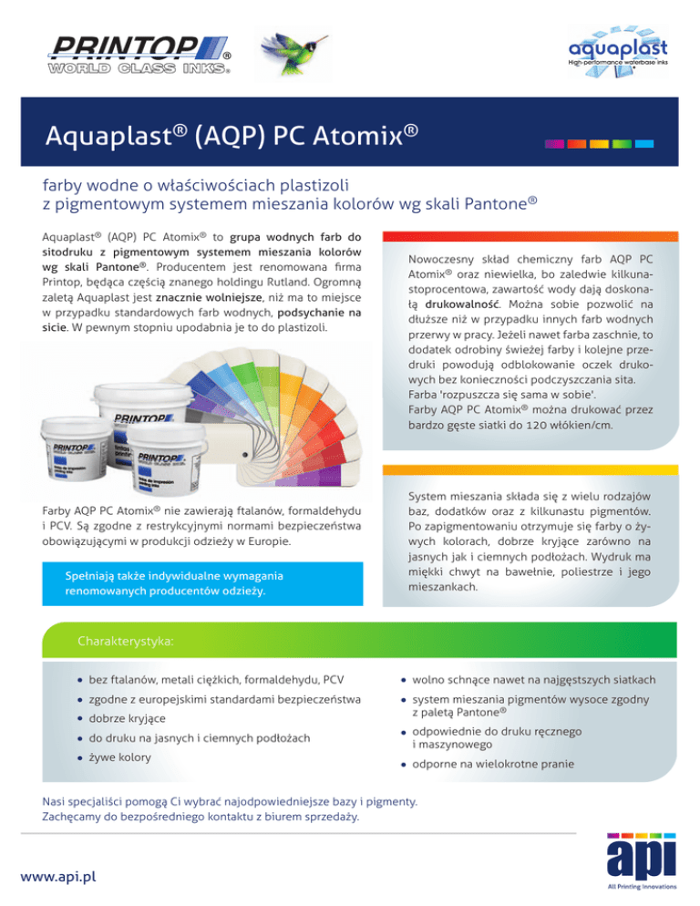Aquaplast® (AQP) PC Atomix® farby wodne o właściwościach plastizoli z pigmentowym systemem mieszania kolorów wg skali Pantone® Aquaplast® (AQP) PC Atomix® to grupa wodnych farb do sitodruku z pigmentowym systemem mieszania kolorów wg skali Pantone®. Producentem jest renomowana firma Printop, będąca częścią znanego holdingu Rutland. Ogromną zaletą Aquaplast jest znacznie wolniejsze, niż ma to miejsce w przypadku standardowych farb wodnych, podsychanie na sicie. W pewnym stopniu upodabnia je to do plastizoli. Farby AQP PC Atomix® nie zawierają ftalanów, formaldehydu i PCV. Są zgodne z restrykcyjnymi normami bezpieczeństwa obowiązującymi w produkcji odzieży w Europie. Spełniają także indywidualne wymagania renomowanych producentów odzieży. Nowoczesny skład chemiczny farb AQP PC Atomix® oraz niewielka, bo zaledwie kilkunastoprocentowa, zawartość wody dają doskonałą drukowalność. Można sobie pozwolić na dłuższe niż w przypadku innych farb wodnych przerwy w pracy. Jeżeli nawet farba zaschnie, to dodatek odrobiny świeżej farby i kolejne przedruki powodują odblokowanie oczek drukowych bez konieczności podczyszczania sita. Farba 'rozpuszcza się sama w sobie'. Farby AQP PC Atomix® można drukować przez bardzo gęste siatki do 120 włókien/cm. System mieszania składa się z wielu rodzajów baz, dodatków oraz z kilkunastu pigmentów. Po zapigmentowaniu otrzymuje się farby o żywych kolorach, dobrze kryjące zarówno na jasnych jak i ciemnych podłożach. Wydruk ma miękki chwyt na bawełnie, poliestrze i jego mieszankach. Charakterystyka: bez ftalanów, metali ciężkich, formaldehydu, PCV wolno schnące nawet na najgęstszych siatkach zgodne z europejskimi standardami bezpieczeństwa system mieszania pigmentów wysoce zgodny z paletą Pantone® dobrze kryjące do druku na jasnych i ciemnych podłożach żywe kolory odpowiednie do druku ręcznego i maszynowego odporne na wielokrotne pranie Nasi specjaliści pomogą Ci wybrać najodpowiedniejsze bazy i pigmenty. Zachęcamy do bezpośredniego kontaktu z biurem sprzedaży. www.api.pl Aquaplast® (AQP) PC Atomix® Zestaw pigmentów Próbki kolorów: PC Atomix Fluo Yellow MX PC Atomix Yellow II PC Atomix Fluo Yellow MX AQP7372 PC Atomix Lemon MX AQP8257 PC Atomix Yellow II AQP7373 PC Atomix Fluo Orange MX AQP7376 PC Atomix Red MX AQP7374 PC Atomix Fluo Fuchsia MX AQP8281 PC Atomix Magenta MX II AQP7377 PC Atomix Violet AQP7378 PC Atomix Blue RQ AQP7380 PC Atomix Blue 1500 AQP7381 PC Atomix Blue B AQP7371 PC Atmonix Green AQP7370 PC Atomix Black AQP7375 PC Atomix White PC Atomix Lemon MX Bezftalanowe bazy PC Atomix Fluo Orange MX PC Atomix Fluo Fuchsia MX PC Atomix Red MX AQP7368 AQP8198 AQP Plus Neutral Mix Base 100 – baza transparentna do pigmentowania AQP8197 Plus Opaque Mix Base 100 – baza kryjąca do pigmentowania serii plus AQP8238 Plus PC Atomix Mix Base – baza do pigmentowania w systemie Pantone® AQP8239 Plus Puff Base 200 – baza puchnąca AQP8094 Devoree Base 100 – baza usuwająca włókna bawełny AQP8246 Plus Pearl Base 200 – baza perłowa serii plus Dodatki PC Atomix Magenta MX II PC Atomix Blue RQ PC Atomix Violet PC Atomix Blue 1500 AQP8267 Plus Matting Addtive – dodatek matujący AQP8207 Plus Viscosity Reducer – reduktor lepkości AQP8265 Plus Retarding Additive – dodatek opóźniający wysychanie AQP8264 Plus Fixer Additive – dodatek podnoszący odporność na pranie (katalizator) AQP8095 Devoree Activator 100 – aktywator usuwający włókna bawełny Farby metaliczne PC Atomix Blue B PC Atomix Black PC Atmonix Green AQP8202 Plus Metallic Gold – farba złota metaliczna serii plus AQP8201 Plus Metallic Silver – farba srebrna metaliczna serii plus PC Atomix White Farby białe AQP8199 Plus Soft White – farba biała o miękkim chwycie niezasychająca na sicie Formuły kolorów Palety Pantone® są dostępne dzięki bezpłatnemu, intuicyjnemu oprogramowaniu. Istnieje w nim opcja indywidualnej biblioteki kolorów, co ułatwia tworzenie własnych efektów specjalnych i ich powtarzalną produkcję. www.api.pl API.PL Spółka z o.o. 95-070 Aleksandrów Łódzki ul. Okrężna 37, Rąbień [email protected] tel. +48 (42) 250 55 95 fax: +48 (42) 250 55 94 Oddział nr I 04-660 Warszawa ul. Sadulska 20 [email protected] tel. +48 (22) 812 06 80 fax: +48 (22) 812 06 80 Oddział nr II 41-500 Chorzów ul. Krzyżowa 3 [email protected] tel. +48 (32) 241 65 14 fax: +48 (32) 241 65 14