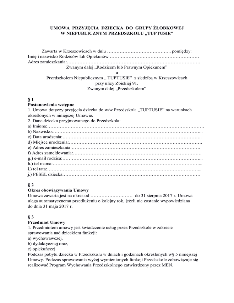 UMOWA PRZYJĘCIA DZIECKA DO GRUPY ŻŁOBKOWEJ W NIEPUBLICZNYM PRZEDSZKOLU „TUPTUSIE” Zawarta w Krzeszowicach w dniu ………………………………….. pomiędzy: Imię i nazwisko Rodziców lub Opiekunów ………………………………………………… Adres zamieszkania:…………………………………………………………………………. Zwanym dalej „Rodzicem lub Prawnym Opiekunem” a Przedszkolem Niepublicznym „ TUPTUSIE” z siedzibą w Krzeszowicach przy ulicy Żbickiej 91. Zwanym dalej „Przedszkolem” §1 Postanowienia wstępne 1. Umowa dotyczy przyjęcia dziecka do w/w Przedszkola „TUPTUSIE” na warunkach określonych w niniejszej Umowie. 2. Dane dziecka przyjmowanego do Przedszkola: a) Imiona:………………………………………………………………………………………. b) Nazwisko:…………………………………………………………………………………... c) Data urodzenia:…………………………………………………………………………….. d) Miejsce urodzenia:…………………………………………………………………………. e) Adres zamieszkania:………………………………………………………………………. f) Adres zameldowania:………………………………………………………………………. g.) e-mail rodzica:……………………………………………………………………………... h.) tel mama:…………………………………………………………………………………... i.) tel tata:……………………………………………………………………………………... j.) PESEL dziecka:…………………………………………………………………………… §2 Okres obowiązywania Umowy Umowa zawarta jest na okres od ……………………… do 31 sierpnia 2017 r. Umowa ulega automatycznemu przedłużeniu o kolejny rok, jeżeli nie zostanie wypowiedziana do dnia 31 maja 2017 r. §3 Przedmiot Umowy 1. Przedmiotem umowy jest świadczenie usług przez Przedszkole w zakresie sprawowania nad dzieckiem funkcji: a) wychowawczej, b) dydaktycznej oraz, c) opiekuńczej Podczas pobytu dziecka w Przedszkolu w dniach i godzinach określonych w§ 5 niniejszej Umowy. Podczas sprawowania wyżej wymienionych funkcji Przedszkole zobowiązuje się realizować Program Wychowania Przedszkolnego zatwierdzony przez MEN. 2. Rodzic zobowiązuje się do wszelkiej współpracy z personelem Przedszkola mającej na celu jak najlepsze sprawowanie wyżej wymienionych funkcji przez Przedszkole, w szczególności w razie występowania problemów wychowawczych. 3. W ramach czesnego, o którym mowa w § 5 niniejszej Umowy, dziecko będzie mogło uczestniczyć w następujących zajęciach: rytmika, gimnastyka korekcyjna oraz brać udział w wewnętrznych atrakcjach przygotowanych przez Przedszkole. 4. Dziecku w przedszkolu przysługują 4 posiłki dziennie (śniadanie godz. 8.30, obiad: (zupa godz. 11.00, II danie godz. 13.30),podwieczorek godz. 15.30) §4 Zajęcia dodatkowe W przypadku zorganizowania przez Przedszkole zajęć dodatkowych Rodzic może zapisać dziecko na takie zajęcia. Rodzaje zajęć oraz warunki płatności będą ustalane w karcie informacyjnej dołączonej do umowy. §5 Godziny pracy Przedszkola 1. Przedszkole świadczy usługi, o których mowa w § 3 niniejszej Umowy, przez cały rok w godzinach od 6.00 do 18.00 w dni robocze od poniedziałku do piątku. 2. Przedszkole świadczy usługi również w soboty po wcześniejszym zapisaniu się na listę chętnych. Przedszkole zostanie otwarte wówczas, gdy będzie zapisanych minimum 8 dzieci. 3. Rodzic zobowiązuje się przyprowadzać dziecko do godz. 8.15 i odbierać do godz. 18.00. Za każdą kolejną rozpoczętą godzinę pozostawania dziecka w Przedszkolu zostanie pobrana dodatkowa opłata w wysokości 25 zł. 4. Jeżeli w sezonie wakacyjnym (lipiec i sierpień) wystąpi zmniejszenie frekwencji, to Przedszkole zastrzega sobie prawo łączenia grup. §6 Opłaty 1. Usługi świadczone przez Przedszkole są płatne. 2. Przy zapisie dziecka do Przedszkola pobierana jest jednorazowa, zwrotna po roku uczęszczania dziecka do przedszkola opłata w wysokości 300 zł (słownie: trzysta złotych) – wpisowe. 3. Wpłacenie pełnej kwoty określonej w punkcie 2niniejszego paragrafu stanowi gwarancję przyjęcia dziecka do Przedszkola i możliwości uczestnictwa dziecka w zajęciach adaptacyjnych. 4. Rodzaje opłat za pobyt w Przedszkolu „TUPTUSIE”: (odpowiednie podkreślić) - Miesięczna opłata stała za świadczone przez Przedszkole usługi wynosi 430 zł (słownie: czterysta trzydzieści złotych) – czesne, pełny pobyt dziecka. - Miesięczna opłata abonamentowa (90 godzin do wykorzystania) wynosi 330 zł (słownie: trzysta trzydzieści złotych) - Godzinowy pobyt dziecka - cena pojedynczej godziny wynosi 12 zł (słownie: dwanaście złotych) 5. Całodniowa opłata za wyżywienie (cztery posiłki) wynosi 9 zł (słownie: dziewięć złotych) 6. Przedszkole zastrzega sobie możliwość zmiany wysokości czesnego i wyżywienia o czym informuje Rodziców poprzez informacje na tablicy informacyjnej w terminie, co najmniej miesiąc przed zmianą. §7 Terminy płatności 1. Termin płatności czesnego za usługi świadczone przez Przedszkole upływa 5dnia każdego miesiąca. Termin płatności wpisowego zostanie określony z chwilą zapisu dziecka do Przedszkola. Datą spełnienia świadczenia pieniężnego jest data wpływu kwoty czesnego na rachunek bankowy Przedszkola, bądź wybity paragon na kasie fiskalnej. 2. Rodzic zobowiązuje się dokonywać wpłat z tytułu czesnego i wpisowego lub zajęć dodatkowych w Przedszkolu lub na niżej podane konto Przedszkola: ZOMAPA Spółka Cywilna Janusz Starzycki Barbara Starzycka ul. Żbicka 91, 32-065 Krzeszowice Nr konta 05 1540 1115 2014 6080 4116 0001 Dokonując
