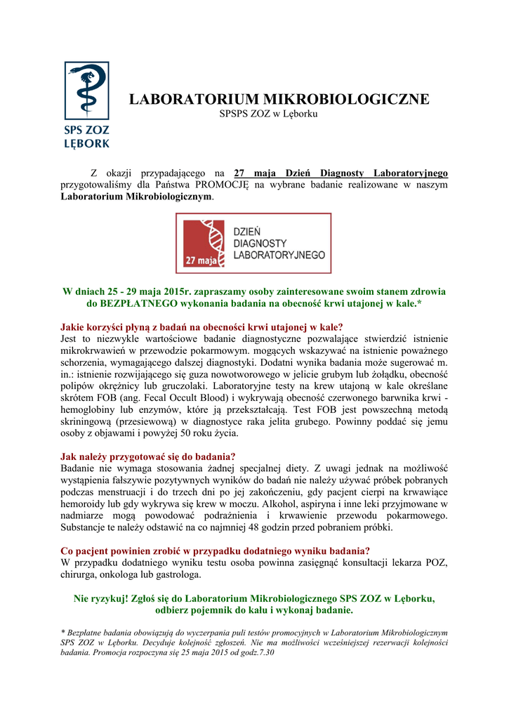 LABORATORIUM MIKROBIOLOGICZNE SPSPS ZOZ w Lęborku Z okazji przypadającego na 27 maja Dzień Diagnosty Laboratoryjnego przygotowaliśmy dla Państwa PROMOCJĘ na wybrane badanie realizowane w naszym Laboratorium Mikrobiologicznym. W dniach 25 - 29 maja 2015r. zapraszamy osoby zainteresowane swoim stanem zdrowia do BEZPŁATNEGO wykonania badania na obecność krwi utajonej w kale.* Jakie korzyści płyną z badań na obecności krwi utajonej w kale? Jest to niezwykle wartościowe badanie diagnostyczne pozwalające stwierdzić istnienie mikrokrwawień w przewodzie pokarmowym. mogących wskazywać na istnienie poważnego schorzenia, wymagającego dalszej diagnostyki. Dodatni wynika badania może sugerować m. in.: istnienie rozwijającego się guza nowotworowego w jelicie grubym lub żołądku, obecność polipów okrężnicy lub gruczolaki. Laboratoryjne testy na krew utajoną w kale określane skrótem FOB (ang. Fecal Occult Blood) i wykrywają obecność czerwonego barwnika krwi hemoglobiny lub enzymów, które ją przekształcają. Test FOB jest powszechną metodą skriningową (przesiewową) w diagnostyce raka jelita grubego. Powinny poddać się jemu osoby z objawami i powyżej 50 roku życia. Jak należy przygotować się do badania? Badanie nie wymaga stosowania żadnej specjalnej diety. Z uwagi jednak na możliwość wystąpienia fałszywie pozytywnych wyników do badań nie należy używać próbek pobranych podczas menstruacji i do trzech dni po jej zakończeniu, gdy pacjent cierpi na krwawiące hemoroidy lub gdy wykrywa się krew w moczu. Alkohol, aspiryna i inne leki przyjmowane w nadmiarze mogą powodować podrażnienia i krwawienie przewodu pokarmowego. Substancje te należy odstawić na co najmniej 48 godzin przed pobraniem próbki. Co pacjent powinien zrobić w przypadku dodatniego wyniku badania? W przypadku dodatniego wyniku testu osoba powinna zasięgnąć konsultacji lekarza POZ, chirurga, onkologa lub gastrologa. Nie ryzykuj! Zgłoś się do Laboratorium Mikrobiologicznego SPS ZOZ w Lęborku, odbierz pojemnik do kału i wykonaj badanie. * Bezpłatne badania obowiązują do wyczerpania puli testów promocyjnych w Laboratorium Mikrobiologicznym SPS ZOZ w Lęborku. Decyduje kolejność zgłoszeń. Nie ma możliwości wcześniejszej rezerwacji kolejności badania. Promocja rozpoczyna się 25 maja 2015 od godz.7.30