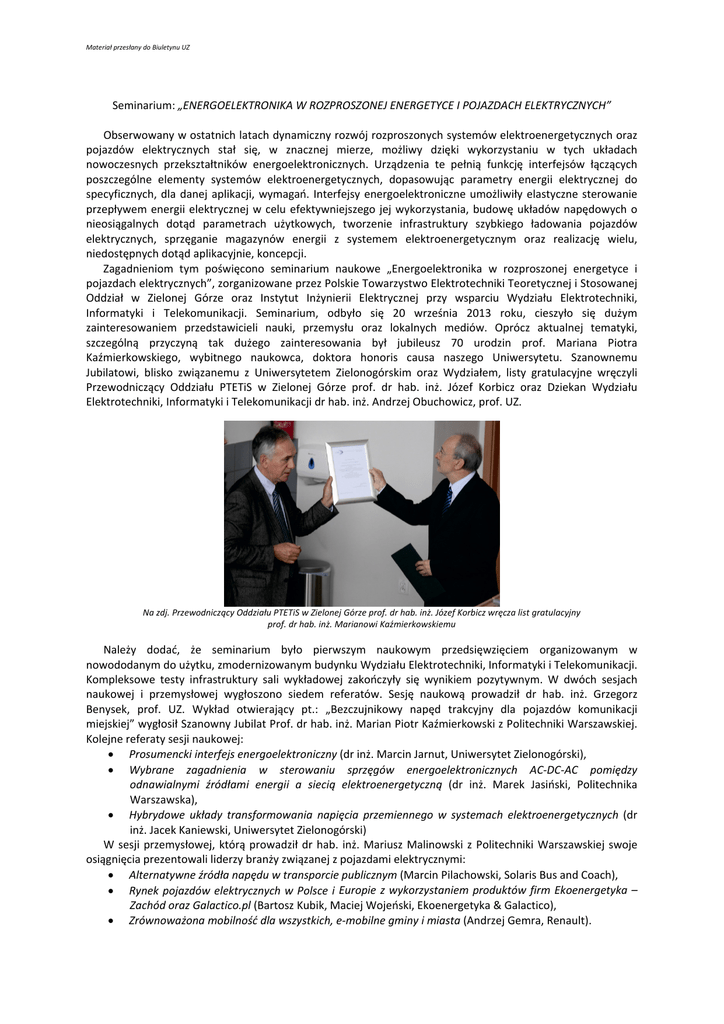 Materiał przesłany do Biuletynu UZ Seminarium: „ENERGOELEKTRONIKA W ROZPROSZONEJ ENERGETYCE I POJAZDACH ELEKTRYCZNYCH” Obserwowany w ostatnich latach dynamiczny rozwój rozproszonych systemów elektroenergetycznych oraz pojazdów elektrycznych stał się, w znacznej mierze, możliwy dzięki wykorzystaniu w tych układach nowoczesnych przekształtników energoelektronicznych. Urządzenia te pełnią funkcję interfejsów łączących poszczególne elementy systemów elektroenergetycznych, dopasowując parametry energii elektrycznej do specyficznych, dla danej aplikacji, wymagań. Interfejsy energoelektroniczne umożliwiły elastyczne sterowanie przepływem energii elektrycznej w celu efektywniejszego jej wykorzystania, budowę układów napędowych o nieosiągalnych dotąd parametrach użytkowych, tworzenie infrastruktury szybkiego ładowania pojazdów elektrycznych, sprzęganie magazynów energii z systemem elektroenergetycznym oraz realizację wielu, niedostępnych dotąd aplikacyjnie, koncepcji. Zagadnieniom tym poświęcono seminarium naukowe „Energoelektronika w rozproszonej energetyce i pojazdach elektrycznych”, zorganizowane przez Polskie Towarzystwo Elektrotechniki Teoretycznej i Stosowanej Oddział w Zielonej Górze oraz Instytut Inżynierii Elektrycznej przy wsparciu Wydziału Elektrotechniki, Informatyki i Telekomunikacji. Seminarium, odbyło się 20 września 2013 roku, cieszyło się dużym zainteresowaniem przedstawicieli nauki, przemysłu oraz lokalnych mediów. Oprócz aktualnej tematyki, szczególną przyczyną tak dużego zainteresowania był jubileusz 70 urodzin prof. Mariana Piotra Kaźmierkowskiego, wybitnego naukowca, doktora honoris causa naszego Uniwersytetu. Szanownemu Jubilatowi, blisko związanemu z Uniwersytetem Zielonogórskim oraz Wydziałem, listy gratulacyjne wręczyli Przewodniczący Oddziału PTETiS w Zielonej Górze prof. dr hab. inż. Józef Korbicz oraz Dziekan Wydziału Elektrotechniki, Informatyki i Telekomunikacji dr hab. inż. Andrzej Obuchowicz, prof. UZ. Na zdj. Przewodniczący Oddziału PTETiS w Zielonej Górze prof. dr hab. inż. Józef Korbicz wręcza list gratulacyjny prof. dr hab. inż. Marianowi Kaźmierkowskiemu Należy dodać, że seminarium było pierwszym naukowym przedsięwzięciem organizowanym w nowododanym do użytku, zmodernizowanym budynku Wydziału Elektrotechniki, Informatyki i Telekomunikacji. Kompleksowe testy infrastruktury sali wykładowej zakończyły się wynikiem pozytywnym. W dwóch sesjach naukowej i przemysłowej wygłoszono siedem referatów. Sesję naukową prowadził dr hab. inż. Grzegorz Benysek, prof. UZ. Wykład otwierający pt.: „Bezczujnikowy napęd trakcyjny dla pojazdów komunikacji miejskiej” wygłosił Szanowny Jubilat Prof. dr hab. inż. Marian Piotr Kaźmierkowski z Politechniki Warszawskiej. Kolejne referaty sesji naukowej: • Prosumencki interfejs energoelektroniczny (dr inż. Marcin Jarnut, Uniwersytet Zielonogórski), • Wybrane zagadnienia w sterowaniu sprzęgów energoelektronicznych AC‐DC‐AC pomiędzy odnawialnymi źródłami energii a siecią elektroenergetyczną (dr inż. Marek Jasiński, Politechnika Warszawska), • Hybrydowe układy transformowania napięcia przemiennego w systemach elektroenergetycznych (dr inż. Jacek Kaniewski, Uniwersytet Zielonogórski) W sesji przemysłowej, którą prowadził dr hab. inż. Mariusz Malinowski z Politechniki Warszawskiej swoje osiągnięcia prezentowali liderzy branży związanej z pojazdami elektrycznymi: • Alternatywne źródła napędu w transporcie publicznym (Marcin Pilachowski, Solaris Bus and Coach), • Rynek pojazdów elektrycznych w Polsce i Europie z wykorzystaniem produktów firm Ekoenergetyka – Zachód oraz Galactico.pl (Bartosz Kubik, Maciej Wojeński, Ekoenergetyka & Galactico), • Zrównoważona mobilność dla wszystkich, e‐mobilne gminy i miasta (Andrzej Gemra, Renault). Materiał przesłany do Biuletynu UZ Dzięki uprzejmości autorów prezentacje dostępne są na stronie www.ptetis.uz.zgora.pl. Zarówno referaty prezentowane w sesji naukowej jak i przemysłowej wzbudzały żywiołową dyskusję. Należy jednak szczerze przyznać, że największym zainteresowaniem cieszyły się testy elektrycznych pojazdów, zaprezentowanych, w przerwie pomiędzy sesjami, przez Renault. Uczestnicy seminarium chętnie korzystali z możliwości przejażdżki elektrycznym Renault Fluence oraz Twizy. Na zdj. Dr inż. Marek Jasiński z Politechniki Warszawskiej testuje nowe Renault Twizy Następnego dnia goście z Instytutu Sterowania i Elektroniki Przemysłowej Politechniki z Warszawskiej wspólnie z pracownikami Instytutu Inżynierii Elektrycznej Uniwersytetu Zielonogórskiego uczestniczyli w wizycie naukowo‐technicznej zorganizowanej dzięki uprzejmości firmy Juwi, międzynarodowego holdingu przedsiębiorstw z siedzibą w Niemczech, której przedstawiciel był uczestnikiem seminarium. Celem podróży była, wybudowana w pobliżu Lipska, elektrownia słoneczna Waldpolenz Solar Park o mocy 52 MW oraz znajdująca się w bezpośrednim sąsiedztwie, uruchomiona przed kilkoma tygodniami, biogazownia o mocy około 4 MW. Pracownicy firmy Juwi wykazali się niezwykłą cierpliwością, pozwalając uczestnikom wizyty na wyjątkowo szczegółowe analizy techniczne obiektu o relatywnie dużych gabarytach. Elektrownia powstała na opuszczonym przez wojska radzieckie lotnisku i zajmuje powierzchnię ok. 300 boisk piłkarskich. Największe emocje wzbudzała jednak biogazownia… każdy chciał eksperymentalnie, „na własny nos”, zweryfikować obiegowe opinie dotyczące efektów ubocznych, towarzyszących produkcji biogazu. W zgodnej opinii zwiedzających, biogazownie byłyby idealnym uzupełnieniem instalowanych obecnie w rozproszonym systemie elektroenergetycznym odnawialnych źródeł, ponieważ nie mają podstawowej wady „typowych” odnawialnych źródeł energii, wynikającej z niestałości dostawy energii pierwotnej (brak wia