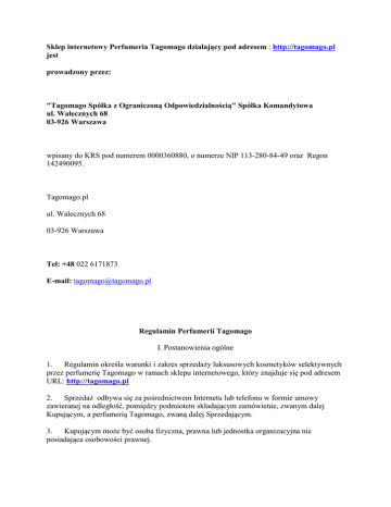 Sklep internetowy Perfumeria Tagomago działający pod adresem : http://tagomago.pl jest prowadzony przez: "Tagomago Spółka z Ograniczoną Odpowiedzialnością" Spółka Komandytowa ul. Walecznych 68 03-926 Warszawa wpisany do KRS pod numerem 0000360880, o numerze NIP 113-280-84-49 oraz Regon 142490095. Tagomago.pl ul. Walecznych 68 03-926 Warszawa Tel: +48 022 6171873 E-mail: [email protected] Regulamin Perfumerii Tagomago I. Postanowienia ogólne 1. Regulamin określa warunki i zakres sprzedaży luksusowych kosmetyków selektywnych przez perfumerię Tagomago w ramach sklepu internetowego, który znajduje się pod adresem URL: http://tagomago.pl 2. Sprzedaż odbywa się za pośrednictwem Internetu lub telefonu w formie umowy zawieranej na odległość, pomiędzy podmiotem składającym zamówienie, zwanym dalej Kupującym, a perfumerią Tagomago, zwaną dalej Sprzedającym. 3. Kupującym może być osoba fizyczna, prawna lub jednostka organizacyjna nie posiadająca osobowości prawnej. 4. Kupujący najpóźniej w chwili złożenia zamówienia jest zobowiązany do zapoznania się z Regulaminem i do jego zaakceptowania. II. Zasady dokonania zakupu 1. Wszystkie produkty przedstawione na stronie internetowej sklepu stanowią zaproszenie do składania ofert kupna zgodnie z przepisami Kodeksu cywilnego 2. Kupujący składając zmówienie przedstawia Sprzedającemu ofertę zawarcia umowy sprzedaży określonego produktu. 3. Kupujący może składać zamówienia przez 24h na dobę za pośrednictwem strony internetowej http://tagomago.pl. Prawidłowe wypełnienie formularza Rejestracji jest podstawowym warunkiem realizacji zamówienia. Kupujący może także złożyć zamówienie przez telefon w godzinach otwarcia Sklepu kosmetycznego ul. Walecznych 68, 03-926 Warszawa, tj. do poniedziałku do piątku od godziny 08.00 do 19.00, w soboty od godziny 10.00 do 14.00 pod numerem telefonu: 022 617 18 73 (dalej Sklep). 4. Przebieg świadczenia usług w sklepie internetowym Sprzedającego odbywa się w ramach czterech kroków: 1- wybór produktu (Do koszyka), 2- wybór sposobu płatności i dostawy, 3- wprowadzenie przez Kupującego danych osobowych wymaganych do realizacji zamówienia, 4- potwierdzenie złożenia zamówienia przez Kupującego. Analogiczna procedura stosowana jest w przypadku złożenia zamówienia przez telefon. 5. W chwili potwierdzenia złożenia zamówienia przez Kupującego, Sprzedający przesyła potwierdzenia przyjęcia zmówienia produktu wraz z numerem Zamówienia. Numer Zamówienia pozwala Kupującemu na sprawdzanie stanu realizacji zamówienia. W przypadku zamówienia złożonego przez telefon potwierdzenie złożenia zamówienia następuje ustnie. 6. Zamówienie jest realizowane w terminie do 14 dni roboczych licząc od dnia potwierdzenia przyjęcia zamówienia przez Sprzedającego w przypadku wyboru sposobu płatności przy odbiorze lub od dnia zaksięgowania płatności na koncie Sprzedawcy w przypadku wyboru płatności z góry, o ile w chwili składania zamówienia produkty są dostępne w magazynie Sprzedającego. 7. Jeżeli produkt jest niedostępny Sprzedający powiadomi o tym Kupującego niezwłocznie, nie później jednak niż w terminie 14 dni od dnia potwierdzenia zawarcia umowy i zwróci całą otrzymaną od Kupującego sumę pieniężną odpowiednio do sposobu złożonego zamówienia. 8. W przypadku, gdy Sprzedający otrzyma informację, że możliwa jest jedynie częściowa realizacja zmówienia zawiadomi o tym Kupującego drogą mailową bądź telefoniczną w zależności od sposobu składanego zamówienia i za jego zgodą dokona częściowej realizacji zamówienia. 9. Jeżeli dojdzie do częściowej realizacji zamówienia z powodu braku produktów Kupujący pokrywa koszty pierwszej przesyłki. Koszty przesyłek pozostałych części pierwotnego zamówienia pokrywa Sprzedający. 10. W przypadku, gdy Kupujący odmówi podania danych osobowych niezbędnych do realizacji zamówienia nie dojdzie do przyjęcia zamówienia. 11. Sprzedający ustalił ceny produktów w polskich złotych z uwzględnieniem podatku VAT. Cennik dostawy znajduje się http://tagomago.pl/czytaj/15/Dostawa-towaru. 12. Ceną wiążącą jest cena produktu podana na stronie internetowej Sprzedającego w chwili składania zamówienia przez Kupującego. 13. Sprzedający zastrzega sobie prawo do zmiany cen oferowanych produktów w ramach bieżących wyprzedaży i innych akcji promocyjnych. To uprawnienie Sprzedającego nie odnosi się do zamówień złożonych przed dniem wejścia w życie zmiany ceny produktu. 14. Wszystkie produkty prezentowane przez Sprzedającego są oryginalne. Brak foli nie świadczy o braku oryginalności, w przypadku gdy taka praktyka stosowana jest przez producenta. III. Formy płatności i dostawy 1. Zapłaty za produkt, który ma być dostarczony do Kupującego na terenie Polski można dokonać: a) przelewem bankowym, b) płatność za pobraniem, c) płatność za pośrednictwem platformy mTransfer, d) za pośrednictwem systemu płatniczego eCard wówczas realizacja zmówienia nastąpi po dniu zaksięgowania płatności na koncie Sprzedającego. Szczegóły dotyczące sposobów płatności http://tagomago.pl/czytaj/98/sposoby_platnosci. 2. Dostawa zamówionych produktów następuje według sposobu wskazanego przez Kupującego: a) przesyłka kurierska, b) przesyłka pocztowa. Istnieje także możliwość odbioru osobistego. Szczegóły dotyczące dostawy http://tagomago.pl/czytaj/15/Dostawa-towaru. 3. W przypadku osobistego odbioru w Sklepie możliwa jest zapłata gotówką lub karta płatniczą. Karty płatnicze akceptowane przez Sprzedającego znajdują się pod adresem http://tagomago.pl/czytaj/99/. 4. W przypadku wyboru odbioru osobistego Kupujący zobowiązany jest odebrać zamówione przez siebie produkty w terminie 14 dni od dnia potwierdzenia przyjęcia zamówienia przez Sprzedającego. Po upływie powyższego terminu zamówienie zostaje anulowane. 5. Istnieje