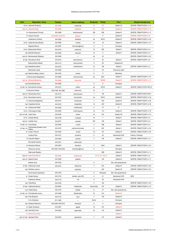Alfabetyczny spis pracowników ICHF PAN Tytuł Nazwisko i Imię dr inż. Adamiak Wojciech mgr inż. Albrycht Paweł Telefon Adres mailowy Budynek Pokój Pion 343-3306 wadamiak 3 35 Zakład VII ZESPÓŁ TEMATYCZNY nr 14 343-3236 palbrycht 7a 216 Zakład III ZESPÓŁ TEMATYCZNY nr 10 343-2068 tandryszewski NH 208 Zakład III ZESPÓŁ TEMATYCZNY nr 11 343-2086, 343-3412 gangulo 3 47 Zakład IX ZESPÓŁ TEMATYCZNY nr 8 343-3383 ardasiew 4a NH10 Zakład IX ZESPÓŁ TEMATYCZNY nr 29 dr inż. Asztemborska Monika 343-3296 monika 7a 18 Zakład III ZESPÓŁ TEMATYCZNY nr 10 Bagiński Marcin 343-3387 [email protected] 5 2 Chemipan dr inż. Balawender Robert 343-3419 balawend 7a 205 Zakład II ZESPÓŁ TEMATYCZNY nr 9 mgr Bartołd Katarzyna 343-3055 kbartold 7a 5 Zakład II ZESPÓŁ TEMATYCZNY nr 2 mgr inż. Bartoszewski Zbigniew 343-3369 --- 4a 23 343-3410 pbernatowicz 3 54 Zakład II 343-3115 ibeszczynska 9 26 Księgowość mgr Białobłocka Maria 343-3213 mbialoblocka 7a 106 Zakład II Biechoński Jacek 343-3326 --- 3 20 Pracownia szkła mgr Bielecka-Mądry Joanna 343-3422 jmadry 9 11 Biblioteka 343-3286 mbonarowska 4a NH4 Zakład V ZESPÓŁ TEMATYCZNY nr 15 343-3064 bbonczak NH208 Zakład III ZESPÓŁ TEMATYCZNY nr 12 343-3385 --- 5 6 Chemipan Zakład III ZESPÓŁ TEMATYCZNY NR 23 dr Andryszewski Tomasz dr Angulo Gonzalo Ardasiewicz Andrzej dr hab. Bernatowicz Piotr Beszczyńska Izabela dr Bonarowska Magdalena mgr inż. Bończak Bartłomiej mgr Borodzińska Ewa dr hab. inż. Borodziński Andrzej ZESPÓŁ TEMATYCZNY nr 20 ZESPÓŁ TEMATYCZNY nr 6 ZESPÓŁ TEMATYCZNY nr 2 343-3314 andbor 4a NH18 343-3188, 343-3280 pborowicz 7a 7 343-3172 abrzozowska 7 139 Zakład III ZESPÓŁ TEMATYCZNY NR 5 343-3216 jbuczynska 4a NH10 Zakład IX ZESPÓŁ TEMATYCZNY nr 29 343-3414 mceborska 7 242 Zakład IX ZESPÓŁ TEMATYCZNY nr 29 mgr Cegielska Dorota 343-3210 dcegielska 7a 230 Zakład IX ZESPÓŁ TEMATYCZNY nr 29 inż. Chabrowski Rafał 343-3238 rchabrowski 3 37 IT 343-3260 ochernyayeva 7a 113 Zakład III ZESPÓŁ TEMATYCZNY nr 19 343-3242 aciach 7a 210 Zakład VIII ZESPÓŁ TEMATYCZNY nr 13 343-3188 mcieplak 7a 7 Zakład II ZESPÓŁ TEMATYCZNY nr 2 343-2077 acieslak NH 108 Zakład II ZESPÓŁ TEMATYCZNY nr 9 dr hab. inż. Cinal Marek 343-3204 mcinal 3 18B Zakład II ZESPÓŁ TEMATYCZNY nr 9 Colmenares Quintero Juan dr hab. inż. Carlos 343-3215 jcarloscolmenares 6 255 Zakład V ZESPÓŁ TEMATYCZNY nr 28 343-3353 tcuster 7a 107 Zakład IX ZESPÓŁ TEMATYCZNY nr 25 Cwalina Piotr 343-3151 pcwalina 9 42 Sekretariat ICHF dr Cybulski Olgierd 343-3405 cybulski 7 125 Zakład III ZESPÓŁ TEMATYCZNY nr 11 343-3341 adamaziak ZESPÓŁ TEMATYCZNY nr 22 dr Borowicz Paweł mgr inż. Brzozowska Anna dr inż. Buczyńska Joanna dr Ceborska Magdalena dr inż. Chernyayeva Olga prof. dr hab. Ciach Alina dr inż. Cieplak Maciej mgr inż. Cieślak Anna dr Custer Thomas Damaziak Andrzej dr Danylyuk Oksana Patenty, Przetargi 343-3232 danylyuk 7 244A Zakład II 343-3387, 632-6335 [email protected] 5 1 Chemipan 22B Zakład III ZESPÓŁ TEMATYCZNY nr 11 mgr inż. Dąbrowski Marcin 343-2094 mdabrowski 19, 10, 21, 122, NH104 Zakład II ZESPÓŁ TEMATYCZNY nr 2 mgr inż. Dębski Paweł 343-3380 pdebski 130 Zakład III ZESPÓŁ TEMATYCZNY nr 11 Dłubak Jerzy 343-3105 --- 9 --- Sek. adm-gospodarcza 343-3214 dobkowsk 7 234 Zakład IX ZESPÓŁ TEMATYCZNY nr 29 400 Zakład VII ZESPÓŁ TEMATYCZNY nr 23 Daszczuk Janusz Dąbrowski Bogdan dr hab. Dobkowski Jacek mgr Dolińska Joanna Duchnowska Agnieszka dr Dudek Danuta Dutkiewicz Maciej mgr Fałat Maria jdolinska 343-3105 --- 9 Recepcja Sek. adm-gospodarcza 343-3133 ddudek, sekn-RN 9 41 Sekretariat ICHF 343-3115 md 9 26 Sekretariat ICHF 343-3376 --- 4 12d 343-2067 mfialkowski Nowa Hala 212 Zakład III mgr Fijołek Eliasz 343-3135 efijolek 9 27 Sek. adm-gospodarcza dr hab. inż. Flis-Kabulska Iwona 343-3406 ifliskabulska 7a 214 Zakład VII mgr Fraś Zbigniew 343-3172 exxo 7 139 Zakład III 811-1925 --- Żerań --- Chemipan mgr Gadecka Marzena 343-3385, 632-4513 chemipan 5 6 Chemipan dr Gajek Arkadiusz 343-3297 agajek 7a 212 Zakład III 343-3403 agamdzyk 7a 119 Zakład III 343-2233 pgarstecki 7 147 Zakład III dr hab. Fiałkowski Marcin Furs Arkadiusz mgr Gamdzyk Anna dr Garcia-Cruz Alvar prof. dr hab. Garstecki Piotr 1z6 Zespół tematyczny MSD ZESPÓŁ TEMATYCZNY nr 20 ZESPÓŁ TEMATYCZNY nr 12 Zakład II Ostatnia aktualizacja: 2016-03-16 11:19 Alfabetyczny spis pracowników ICHF PAN Tytuł Nazwisko i Imię Telefon Adres mailowy Budynek Pokój Garwolińska Anna 343-3141 agarwolinska 9 27 mgr Gawecka Karolina 343-3055 kgawecka 7a 5 Zakład II 343-3118 anetag 9 22 Księgowość Gawęda-Fijołek Aneta 343-3404 mgawlik 9 20 mgr inż. Gąsiorowski Krzysztof mgr Gawlik Marcin 811-19-25 [email protected] Żerań --- mgr inż. Gąsiorowski Rafał Dział Prawny Chemipan 343-3238 rafalg 3 37 IT 343-3074 mgil 3 34 Zakład IX mgr inż. Gilewski Janusz 343-3383 gilewski 4a NH10 Zakład IX mgr Giziński Damian 343-3360 dgizinski 7a 109 Zakład V dr Golec Barbara 343-3305 NNH 8 Zakład IX mgr Gonzalez Gil Rafael 343-2092 3 W15 Zakład V dr Gorski Aleksander 343-3140 agorski --- 226 Zakład IX mgr Goszewska Ilona 343-3320 izielinska 7a 104 Zakład V inż. Gotwald Marek 343-3105 --- 9 --- Sek. adm-gospodarcza 343-3420 gorecki 10 4 Zakład VIII Górniak Elżbieta 343-3422 egorniak 9 12 Biblioteka mgr Górski Krzysztof 343-3220 dr hab. Góźdź Wojciech 343-3242 prof. dr hab. Grabowska Anna prof. dr Grabowski Zbigniew wtg 110 / 102 Zakład IX 7a 210 Zakład VIII zgrabowski --- --- Zakład IX 343-3172 gregor 7 139 Zakład III W. mechaniczny jegri 3 16 343-3353 marcin 7a 107 Zakład IX 343-3201 mgryciuk 7a 8 Zakład VIII prof. dr hab. Herbich Jerzy 343-3305 herbich 4a NH8 Zakład IX prof. dr hab. Holas Andrzej 343-3243 aholas 7a 205 Profesor emerytowany 343-2078 mholdynski 4 H1 Zakład III prof. dr hab. Hołyst Robert 343-3123 holyst 7 133 Zakład III mgr inż. Horka Michał 343-3340 mhorka 7 137 Zakład III 343-3244 
