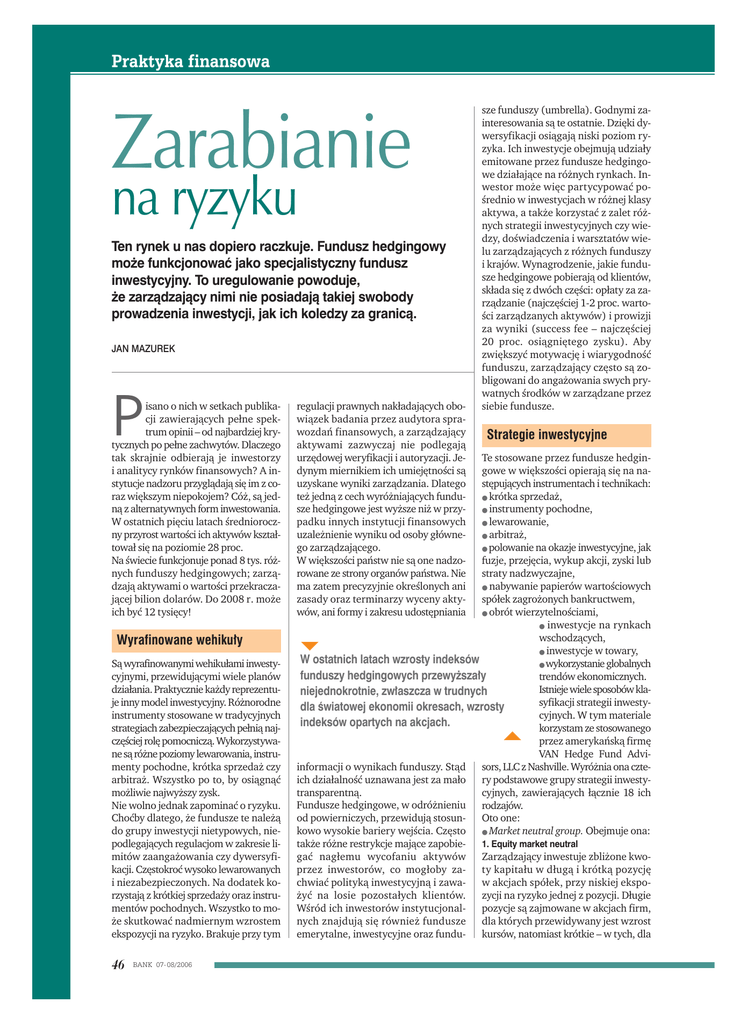 Praktyka finansowa Zarabianie na ryzyku Ten rynek u nas dopiero raczkuje. Fundusz hedgingowy mo˝e funkcjonowaç jako specjalistyczny fundusz inwestycyjny. To uregulowanie powoduje, ˝e zarzàdzajàcy nimi nie posiadajà takiej swobody prowadzenia inwestycji, jak ich koledzy za granicà. JAN MAZUREK P isano o nich w setkach publikacji zawierających pełne spektrum opinii – od najbardziej krytycznych po pełne zachwytów. Dlaczego tak skrajnie odbierają je inwestorzy i analitycy rynków finansowych? A instytucje nadzoru przyglądają się im z coraz większym niepokojem? Cóż, są jedną z alternatywnych form inwestowania. W ostatnich pięciu latach średnioroczny przyrost wartości ich aktywów kształtował się na poziomie 28 proc. Na świecie funkcjonuje ponad 8 tys. różnych funduszy hedgingowych; zarządzają aktywami o wartości przekraczającej bilion dolarów. Do 2008 r. może ich być 12 tysięcy! Wyrafinowane wehiku∏y Są wyrafinowanymi wehikułami inwestycyjnymi, przewidującymi wiele planów działania. Praktycznie każdy reprezentuje inny model inwestycyjny. Różnorodne instrumenty stosowane w tradycyjnych strategiach zabezpieczających pełnią najczęściej rolę pomocniczą. Wykorzystywane są różne poziomy lewarowania, instrumenty pochodne, krótka sprzedaż czy arbitraż. Wszystko po to, by osiągnąć możliwie najwyższy zysk. Nie wolno jednak zapominać o ryzyku. Choćby dlatego, że fundusze te należą do grupy inwestycji nietypowych, niepodlegających regulacjom w zakresie limitów zaangażowania czy dywersyfikacji. Częstokroć wysoko lewarowanych i niezabezpieczonych. Na dodatek korzystają z krótkiej sprzedaży oraz instrumentów pochodnych. Wszystko to może skutkować nadmiernym wzrostem ekspozycji na ryzyko. Brakuje przy tym 46 BANK 07- 08/2006 regulacji prawnych nakładających obowiązek badania przez audytora sprawozdań finansowych, a zarządzający aktywami zazwyczaj nie podlegają urzędowej weryfikacji i autoryzacji. Jedynym miernikiem ich umiejętności są uzyskane wyniki zarządzania. Dlatego też jedną z cech wyróżniających fundusze hedgingowe jest wyższe niż w przypadku innych instytucji finansowych uzależnienie wyniku od osoby głównego zarządzającego. W większości państw nie są one nadzorowane ze strony organów państwa. Nie ma zatem precyzyjnie określonych ani zasady oraz terminarzy wyceny aktywów, ani formy i zakresu udostępniania sze funduszy (umbrella). Godnymi zainteresowania są te ostatnie. Dzięki dywersyfikacji osiągają niski poziom ryzyka. Ich inwestycje obejmują udziały emitowane przez fundusze hedgingowe działające na różnych rynkach. Inwestor może więc partycypować pośrednio w inwestycjach w różnej klasy aktywa, a także korzystać z zalet różnych strategii inwestycyjnych czy wiedzy, doświadczenia i warsztatów wielu zarządzających z różnych funduszy i krajów. Wynagrodzenie, jakie fundusze hedgingowe pobierają od klientów, składa się z dwóch części: opłaty za zarządzanie (najczęściej 1-2 proc. wartości zarządzanych aktywów) i prowizji za wyniki (success fee – najczęściej 20 proc. osiągniętego zysku). Aby zwiększyć motywację i wiarygodność funduszu, zarządzający często są zobligowani do angażowania swych prywatnych środków w zarządzane przez siebie fundusze. Strategie inwestycyjne Te stosowane przez fundusze hedgingowe w większości opierają się na następujących instrumentach i technikach: ● krótka sprzedaż, ● instrumenty pochodne, ● lewarowanie, ● arbitraż, ● polowanie na okazje inwestycyjne, jak fuzje, przejęcia, wykup akcji, zyski lub straty nadzwyczajne, ● nabywanie papierów wartościowych spółek zagrożonych bankructwem, ● obrót wierzytelnościami, ● inwestycje na rynkach wschodzących, ● inwestycje w towary, W ostatnich latach wzrosty indeksów ● wykorzystanie globalnych funduszy hedgingowych przewy˝sza∏y trendów ekonomicznych. Istnieje wiele sposobów klaniejednokrotnie, zw∏aszcza w trudnych syfikacji strategii inwestydla Êwiatowej ekonomii okresach, wzrosty cyjnych. W tym materiale indeksów opartych na akcjach. korzystam ze stosowanego przez amerykańską firmę VAN Hedge Fund Adviinformacji o wynikach funduszy. Stąd sors, LLC z Nashville. Wyróżnia ona czteich działalność uznawana jest za mało ry podstawowe grupy strategii inwestytransparentną. cyjnych, zawierających łącznie 18 ich Fundusze hedgingowe, w odróżnieniu rodzajów. od powierniczych, przewidują stosun- Oto one: kowo wysokie bariery wejścia. Często ● Market neutral group. Obejmuje ona: także różne restrykcje mające zapobie- 1. Equity market neutral gać nagłemu wycofaniu aktywów Zarządzający inwestuje zbliżone kwoprzez inwestorów, co mogłoby za- ty kapitału w długą i krótką pozycję chwiać polityką inwestycyjną i zawa- w akcjach spółek, przy niskiej ekspożyć na losie pozostałych klientów. zycji na ryzyko jednej z pozycji. Długie Wśród ich inwestorów instytucjonal- pozycje są zajmowane w akcjach firm, nych znajdują się również fundusze dla których przewidywany jest wzrost emerytalne, inwestycyjne oraz fundu- kursów, natomiast krótkie – w tych, dla Hedging których prawdopodobny jest spadek kursów. 2. Event Driven Zarządzający wykorzystuje zdarzenia nadzwyczajne w spółkach. Zajmuje zatem odpowiednie pozycje w papierach wartościowych firm, w przypadku których spodziewa się zmiany ceny spowodowanej przewidywanym wydarzeniem nadzwyczajnym, związanym z ich funkcjonowaniem. Mogą to być: restrukturyzacja, fuzja, przejęcie, bankructwo, wykup papierów wartościowych, zmiana ratingu spółki lub nadzwyczajne zyski lub straty. 3. Market Neutral Arbitrage Licząc na nieefektywność rynku, zarządzający zajmuje długie i krótkie pozycje w różnych papierach wartościowych spółki. Ich łączenie powoduje redukcję ryzyka inwestycji. Przykładem takich strategii może być zajmowani
