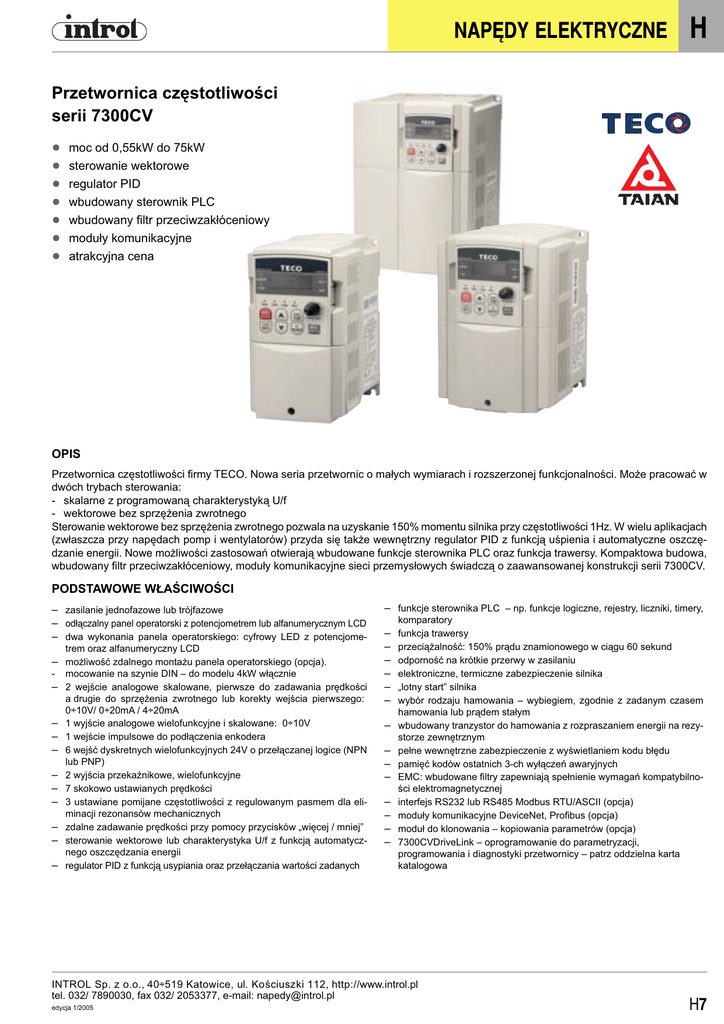 NAPĘDY ELEKTRYCZNE H Przetwornica częstotliwości serii 7300CV ● ● ● ● ● ● ● moc od 0,55kW do 75kW sterowanie wektorowe regulator PID wbudowany sterownik PLC wbudowany filtr przeciwzakłóceniowy moduły komunikacyjne atrakcyjna cena OPIS Przetwornica częstotliwości firmy TECO. Nowa seria przetwornic o małych wymiarach i rozszerzonej funkcjonalności. Może pracować w dwóch trybach sterowania: - skalarne z programowaną charakterystyką U/f - wektorowe bez sprzężenia zwrotnego Sterowanie wektorowe bez sprzężenia zwrotnego pozwala na uzyskanie 150% momentu silnika przy częstotliwości 1Hz. W wielu aplikacjach (zwłaszcza przy napędach pomp i wentylatorów) przyda się także wewnętrzny regulator PID z funkcją uśpienia i automatyczne oszczędzanie energii. Nowe możliwości zastosowań otwierają wbudowane funkcje sterownika PLC oraz funkcja trawersy. Kompaktowa budowa, wbudowany filtr przeciwzakłóceniowy, moduły komunikacyjne sieci przemysłowych świadczą o zaawansowanej konstrukcji serii 7300CV. PODSTAWOWE WŁAŚCIWOŚCI – zasilanie jednofazowe lub trójfazowe – odłączalny panel operatorski z potencjometrem lub alfanumerycznym LCD – dwa wykonania panela operatorskiego: cyfrowy LED z potencjometrem oraz alfanumeryczny LCD – możliwość zdalnego montażu panela operatorskiego (opcja). - mocowanie na szynie DIN – do modelu 4kW włącznie – 2 wejście analogowe skalowane, pierwsze do zadawania prędkości – – – – – – – – – a drugie do sprzężenia zwrotnego lub korekty wejścia pierwszego: 0÷10V/ 0÷20mA / 4÷20mA 1 wyjście analogowe wielofunkcyjne i skalowane: 0÷10V 1 wejście impulsowe do podłączenia enkodera 6 wejść dyskretnych wielofunkcyjnych 24V o przełączanej logice (NPN lub PNP) 2 wyjścia przekaźnikowe, wielofunkcyjne 7 skokowo ustawianych prędkości 3 ustawiane pomijane częstotliwości z regulowanym pasmem dla eliminacji rezonansów mechanicznych zdalne zadawanie prędkości przy pomocy przycisków „więcej / mniej” sterowanie wektorowe lub charakterystyka U/f z funkcją automatycznego oszczędzania energii regulator PID z funkcją usypiania oraz przełączania wartości zadanych – funkcje sterownika PLC – np. funkcje logiczne, rejestry, liczniki, timery, – – – – – – – – – – – – – – komparatory funkcja trawersy przeciążalność: 150% prądu znamionowego w ciągu 60 sekund odporność na krótkie przerwy w zasilaniu elektroniczne, termiczne zabezpieczenie silnika „lotny start” silnika wybór rodzaju hamowania – wybiegiem, zgodnie z zadanym czasem hamowania lub prądem stałym wbudowany tranzystor do hamowania z rozpraszaniem energii na rezystorze zewnętrznym pełne wewnętrzne zabezpieczenie z wyświetlaniem kodu błędu pamięć kodów ostatnich 3-ch wyłączeń awaryjnych EMC: wbudowane filtry zapewniają spełnienie wymagań kompatybilności elektromagnetycznej interfejs RS232 lub RS485 Modbus RTU/ASCII (opcja) moduły komunikacyjne DeviceNet, Profibus (opcja) moduł do klonowania – kopiowania parametrów (opcja) 7300CVDriveLink – oprogramowanie do parametryzacji, programowania i diagnostyki przetwornicy – patrz oddzielna karta katalogowa INTROL Sp. z o.o., 40÷519 Katowice, ul. Ko ściusz ki 112, http://www.introl.pl tel. 032/ 7890030, fax 032/ 2053377, e-mail: [email protected] edycja 1/2005 H7 H NAPĘDY ELEKTRYCZNE DANE TECHNICZNE Przec. 110%/60s Moc [kW] Przec. 150%/60s Napiecie zasilania 1x230V, napięcie wyjściowe 3x0÷230V Prąd [A] Moc [kW] Prąd [A] 0.55 0.75 1.5 3.1 4.5 7.5 2.2 10.5 Wymiary wys.x szer.x gł. Model 7300CV JNTHBCBA R500AC 0001AC 0002AC 163x90x147 -UF 187x128x148 0003AC Rezystor hamowania Moc [W] Oporność [ohm] JNBRN2-201S JNBRN2-201S JNBRN2-202S 60 60 150 200 200 100 JNBRN2-203S 200 70 60 150 200 300 500 600 750 400 250 150 100 80 napięcie zasilania 3x400V, napięcie wyjściowe 3x0÷400V 3 5.5 7.5 11 5.9 10 15 20 0.75 1.5 2.2 4 5.5 7.5 2.3 3.8 5.2 8.8 13 17.5 15 28 11 25 0015BE JNTLKEB-1500WS 1500 40 18,5 22 30 37 45 55 36 45 54 72 90 108 15 18,5 22 30 37 45 32 40 48 64 80 96 0020BE 0025BE 0030BE 0040BE 0050BE 0060BE JNTBR-1R6KW50 JNTBR-4R8KW32 JNTBR-4R8KW27R2 JNTBR-6kW20 JNTBR-9R6KW16 JNTBR-9R6KW13R6 1600 4800 4800 6000 9600 9600 50 32 27.2 20 16 13.6 75 145 55 128 JNTBR-6KW20 (2szt.) 12000 10 JNTHBCBA JNTHBCBA 0001BE 0002BE 0003BE 0005BE 7R50BE 0010BE 163x90x147 JNBRN2-401S JNBRN2-402S JNBRN2-403S JNBRN2-405S JNBRN2-408S JNBRN2-4010S 187x128x148 -UF 260x186x195 360x265x225 -U 652x269x277 770x308x282 0075BE FILTRY EMC Zasilanie 1 fazowe 200V do 240V ±10 3 fazowe 380V do 480V ±10% Napięcie wyjściowe od 0 V do napięcia zasilania Zakres częstotliwości wyj. 0,1 do 650Hz Częstotliwość PW 2 do 16kHz Dokładność częstotliwości wyj. ± 0.01 % pełnego zakresu Rozdzielczość częstotliwości wyj. 0,01Hz Temperatura pracy -10°C do +50°C Wilgotność otoczeni do 95% bez kondensacji Przeciążenie termiczne 150% In w ciągu 60s Przeciążenie prądowe chwilowe 200% In Stopień ochrony IP 20 Wbudowane lub zewnętrzne filtry spełniają wymagania normy dotyczącej kompatybilności elektromagnetycznej – PN-EN61800-3. Poniższa tabela zawiera wykaz przetwornic bez wbudowanego filtra oraz odpowiednie filtry JNTHBCBA Model 300CV Filtr zewnętrzny Wymiary filtra wys.x szer.x gł. 0020BE JUNF34048S-MA 250x70x100 0025BE KMF370A 312x93x190 KMF3100A 312x93x190 0060BE KMF3150A 312x126x224 0075BE KMF3180A 312x126x224 0030BE 0040BE 0050BE AKCESORIA JNSW3xxx JNBRN2-xxx JNSIF-232 JNSIF-485 JNSIF-MP JNSDOP-LED JNSDOP-LCD JNSDOP-BD H8 zestaw do zdalnego przyłączenia panela operatorskiego z kablem o długości 0,5m, 1m, 2m, 3m, 4m lub 5m rezystory hamowania moduł interfejsu RS232 moduł interfejsu RS485 Modbus RTU/ASCI moduł do klonowania (kopiowania parametrów) panele operatorski cyfrowy LED panel operatorski alfanumeryczny LCD zaślepka panela opertorskiego JNSIF-232 JNSIF-MP JNSIF-485 INTROL Sp. z o.o., 40÷519 Katowice, ul. 