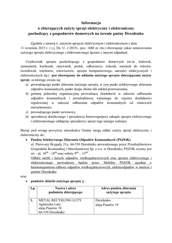 Informacja o zbierających zużyty sprzęt elektryczny i elektroniczny pochodzący z gospodarstw domowych na terenie gminy Drezdenko Zgodnie z ustawą o zużytym sprzęcie elektrycznym i elektronicznym z dnia 11 września 2015 r. ( t.j. Dz. U. z 2015r., poz. 1688 ze zm.) obowiązuje zakaz umieszczania zużytego sprzętu elektrycznego i elektronicznego łącznie z innymi odpadami. Użytkownik sprzętu pochodzącego z gospodarstw domowych (m.in. lodówek, zamrażarek, kuchenek, zmywarek, pralek, odkurzaczy, żelazek, suszarek do włosów, świetlówek, telefonów, telewizorów, sprzętu komputerowego, narzędzi elektrycznych i elektronicznych itp.) jest obowiązany do oddania zużytego sprzętu zbierającemu zużyty sprzęt, za którego uważa się: a) prowadzącego punkt zbierania zużytego sprzętu, w tym punkt selektywnego zbierania odpadów komunalnych, punkt skupu złomu lub zakład przetwarzania, b) gminną jednostkę organizacyjną prowadzącą działalność w zakresie odbierania odpadów komunalnych i przedsiębiorcę wpisanego do rejestru działalności regulowanej w zakresie odbierania odpadów komunalnych od właścicieli nieruchomości, c) prowadzącego punkt serwisowy, d) sprzedawcę detalicznego i sprzedawcę hurtowego(przy zakupie sprzętu elektrycznego i elektronicznego oddajemy sprzedawcy sprzęt tego samego rodzaju). Biorąc pod uwagę powyższe mieszkańcy Gminy mogą oddać zużyty sprzęt elektryczny i elektroniczny do: Punktu Selektywnego Zbierania Odpadów Komunalnych (PSZOK) ul. Pierwszej Brygady 21a, 66-530 Drezdenko prowadzonego przez Przedsiębiorstwo Gospodarki Komunalnej i Mieszkaniowej Sp. z o.o. w Drezdenku, PSZOK czynny jest wt. - pt. 1000 - 1800 oraz soboty 900 – 1300 . Odbiór mebli i innych odpadów wielkogabarytowych oraz sprzętu elektrycznego i elektronicznego prowadzony będzie przez Mobilny PSZOK zgodnie z harmonogramem odbioru odpadów wielkogabarytowych, elektroodpadów w mieście i gminie Drezdenko oraz punktów zbiórki zużytego sprzętu tj.: Lp. 1. Nazwa i adres podmiotu zbierającego METAL RECYKLING LUTY Agnieszka Luty aleja Piastów 19 66-530 Drezdenko Adres punktu zbierania zużytego sprzętu Drezdenko aleja Piastów 19 2. Marlen Górna Spółka Jawna ul. 11 Listopada 11 66-530 Drezdenko Drezdenko ul. Miedziana (dz. nr 1317) Ponadto informuję, że sprzedawcy detaliczni oraz hurtowi są zobowiązani przy sprzedaży sprzętu przeznaczonego dla gospodarstw domowych do nieodpłatnego przyjęcia zużytego sprzętu w ilości nie większej niż sprzedawany nowy sprzęt, jeżeli zużyty sprzęt jest tego samego rodzaju (art. 42 ust. 1 w/w ustawy). Również przedsiębiorca prowadzący punkt serwisowy jest obowiązany do nieodpłatnego przyjęcia zużytego sprzętu, gdy naprawa przyjętego do punktu serwisowego sprzętu jest niemożliwa ze względów technicznych lub właściciel sprzętu uzna, że naprawa sprzętu jest dla niego nieopłacalna.
